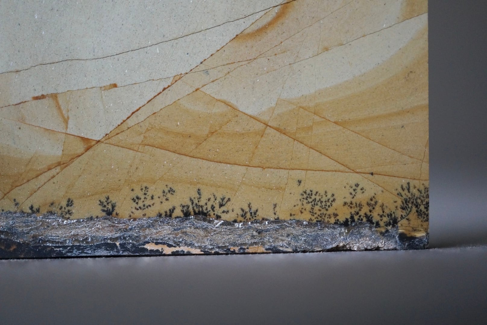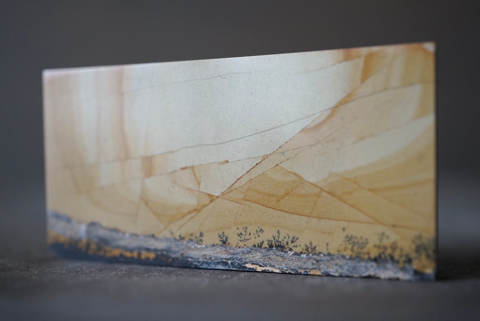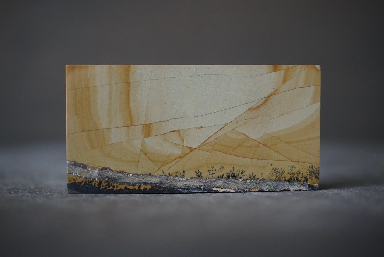 遠景に連なるピラミッドのような三角形とデンドライトによる草木のような模様が美しく表れた一枚です。