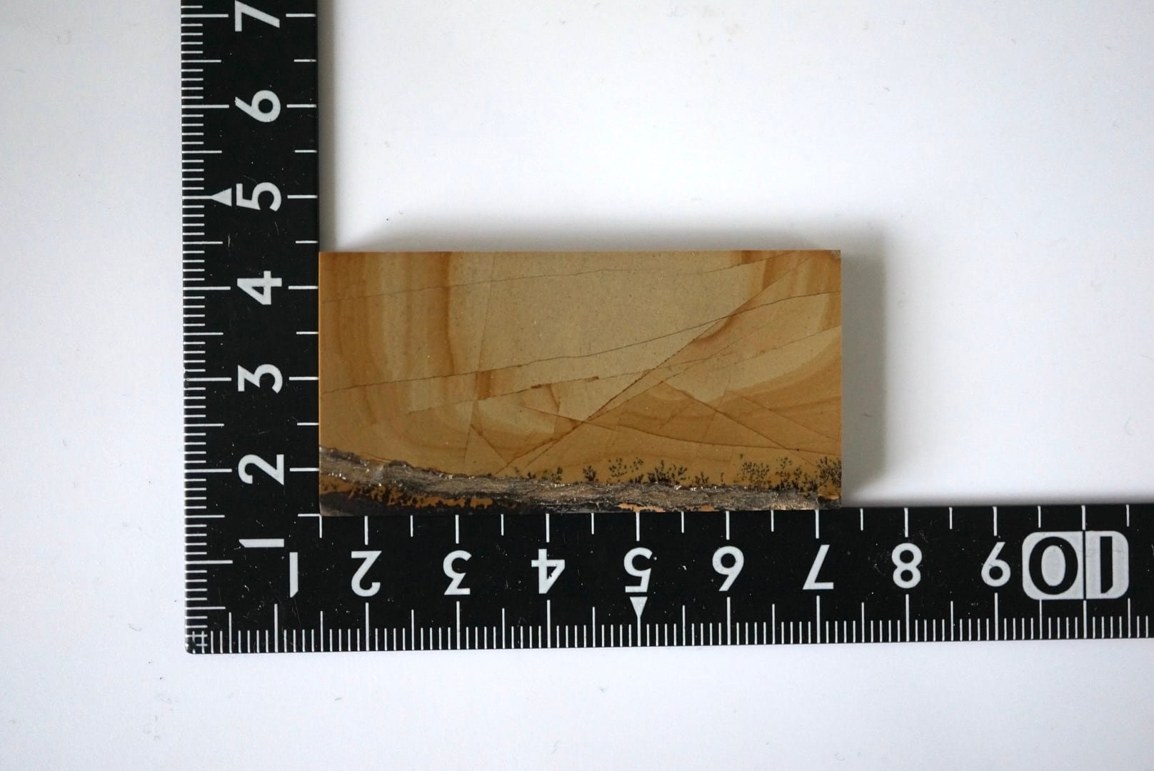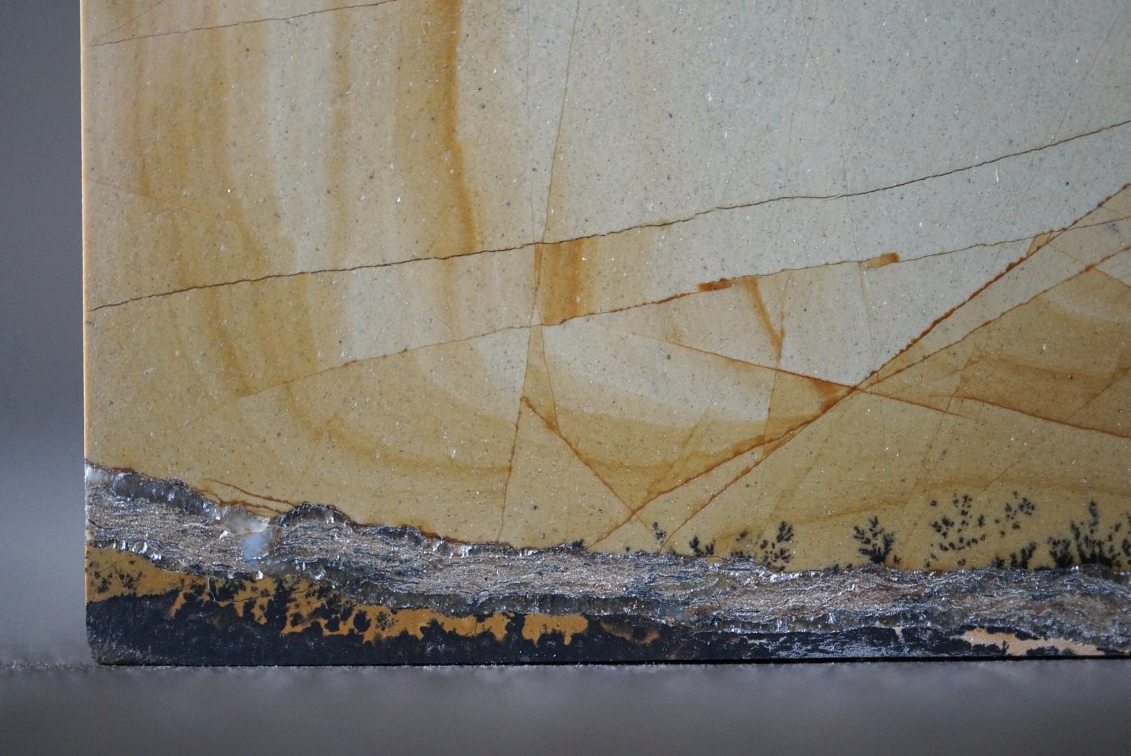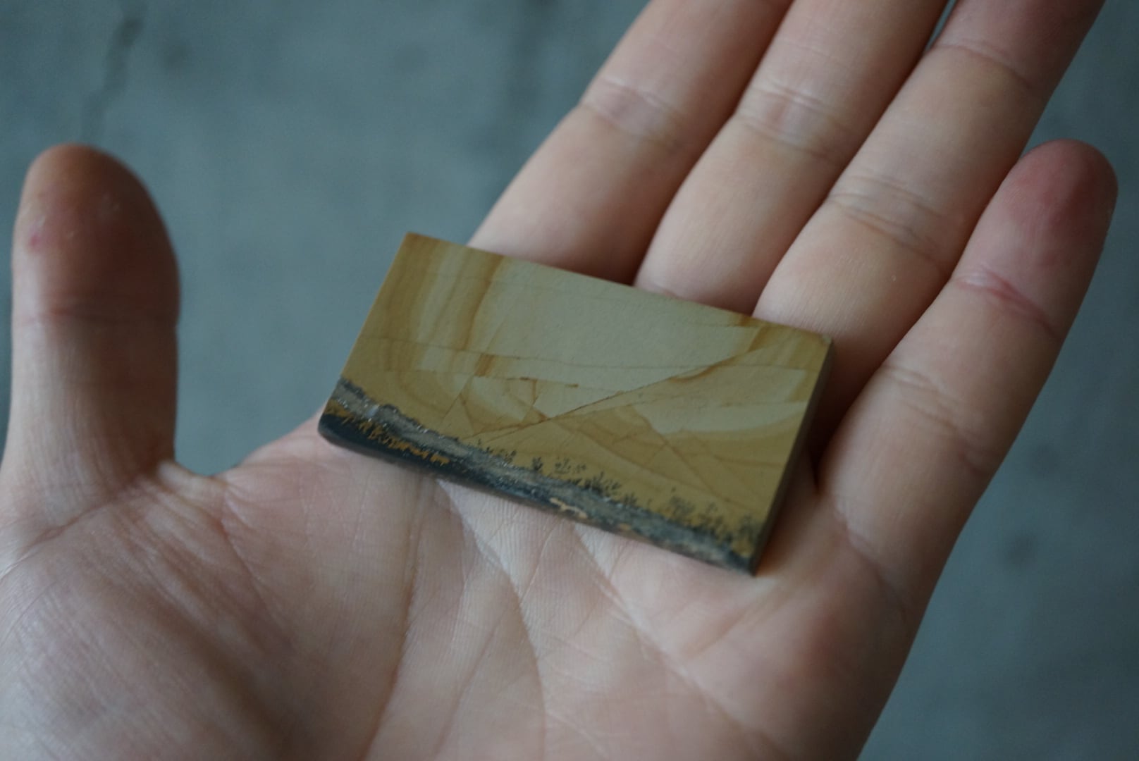 遠景に連なるピラミッドのような三角形とデンドライトによる草木のような模様が美しく表れた一枚です。