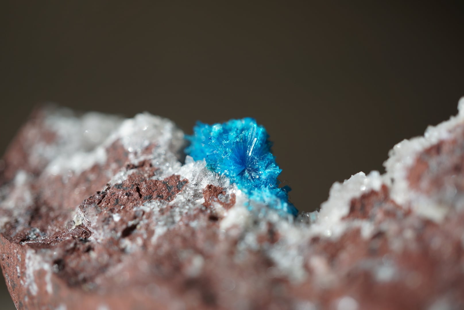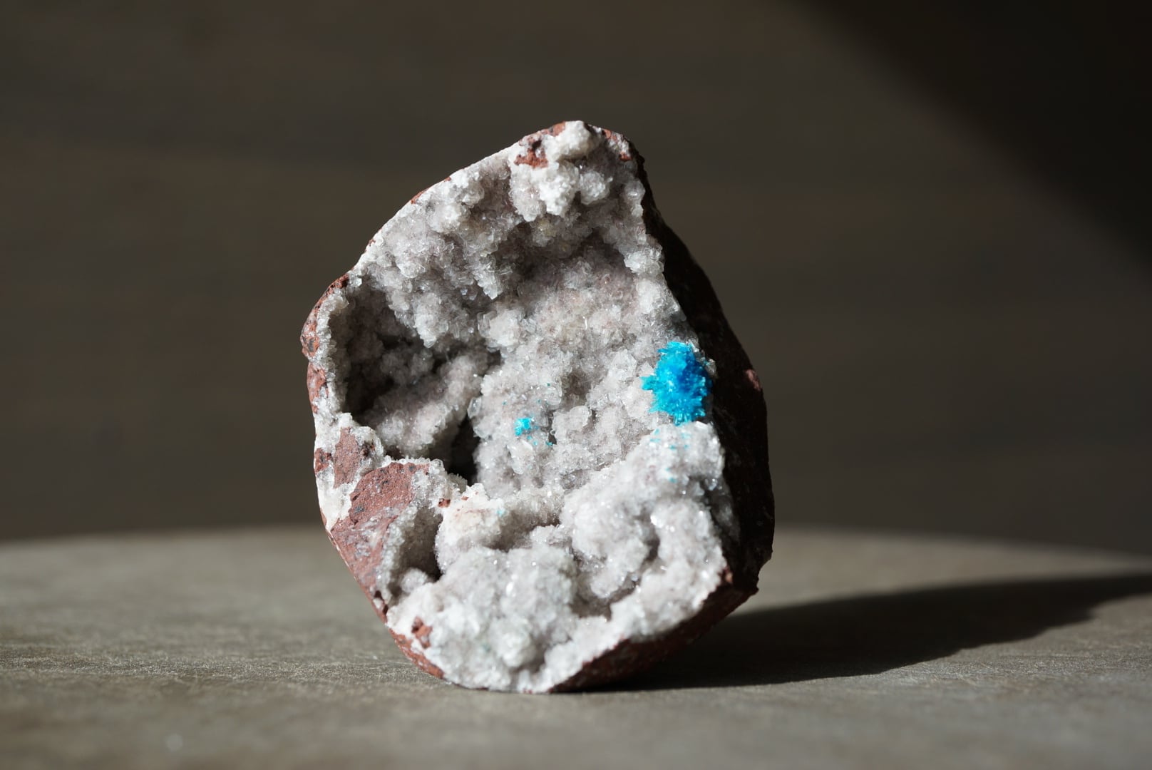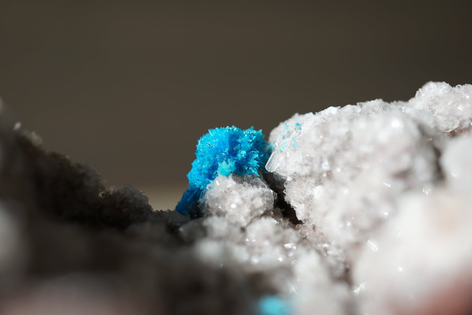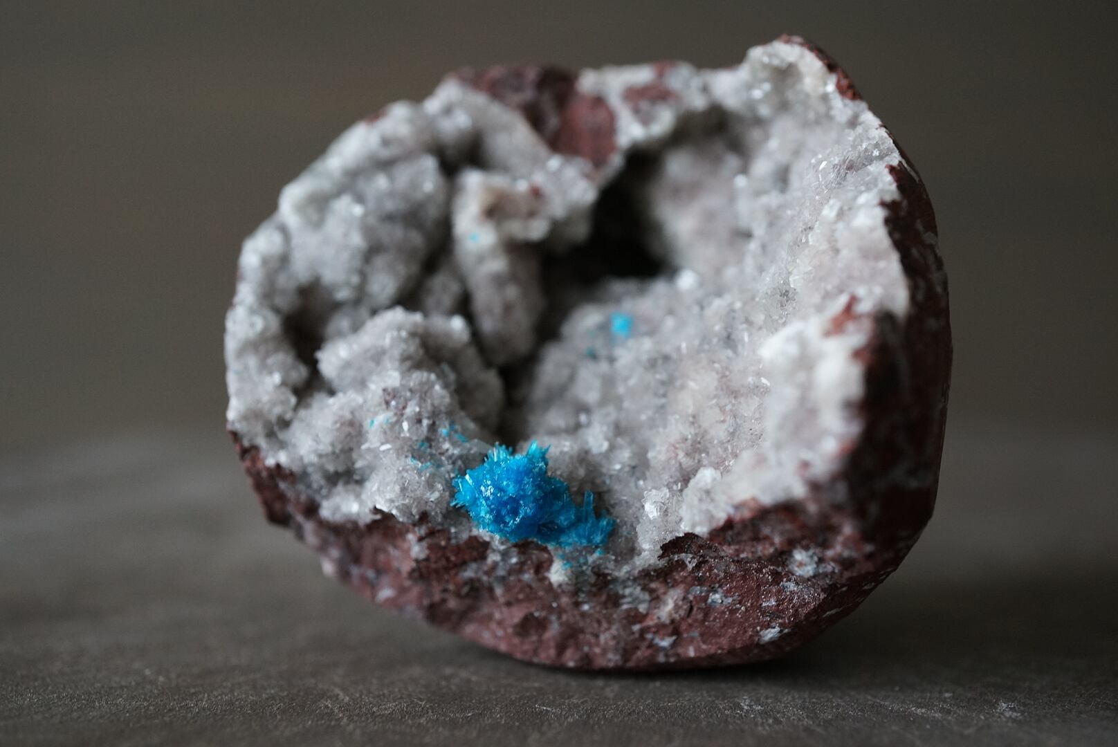 鮮烈なブルーのカバンサイトを包み守るようなドゥルージーな輝沸石(ヒューランダイト)が細やかな煌きを放っています。
