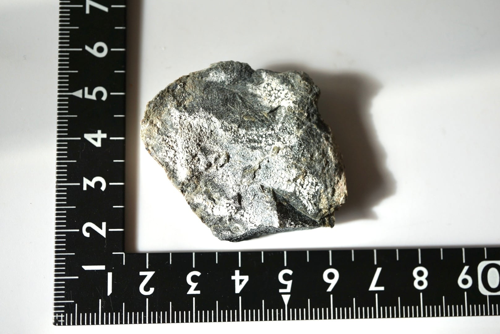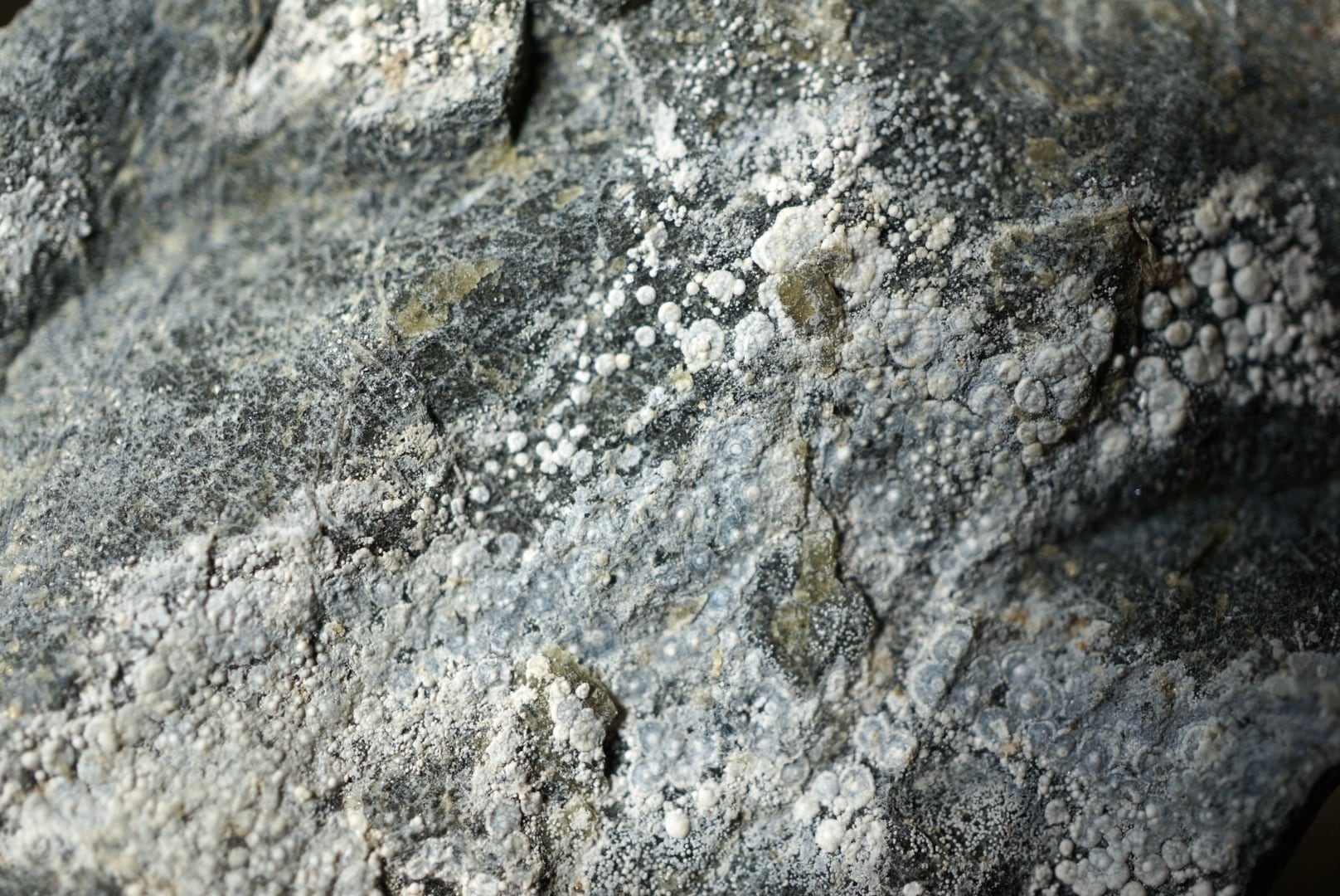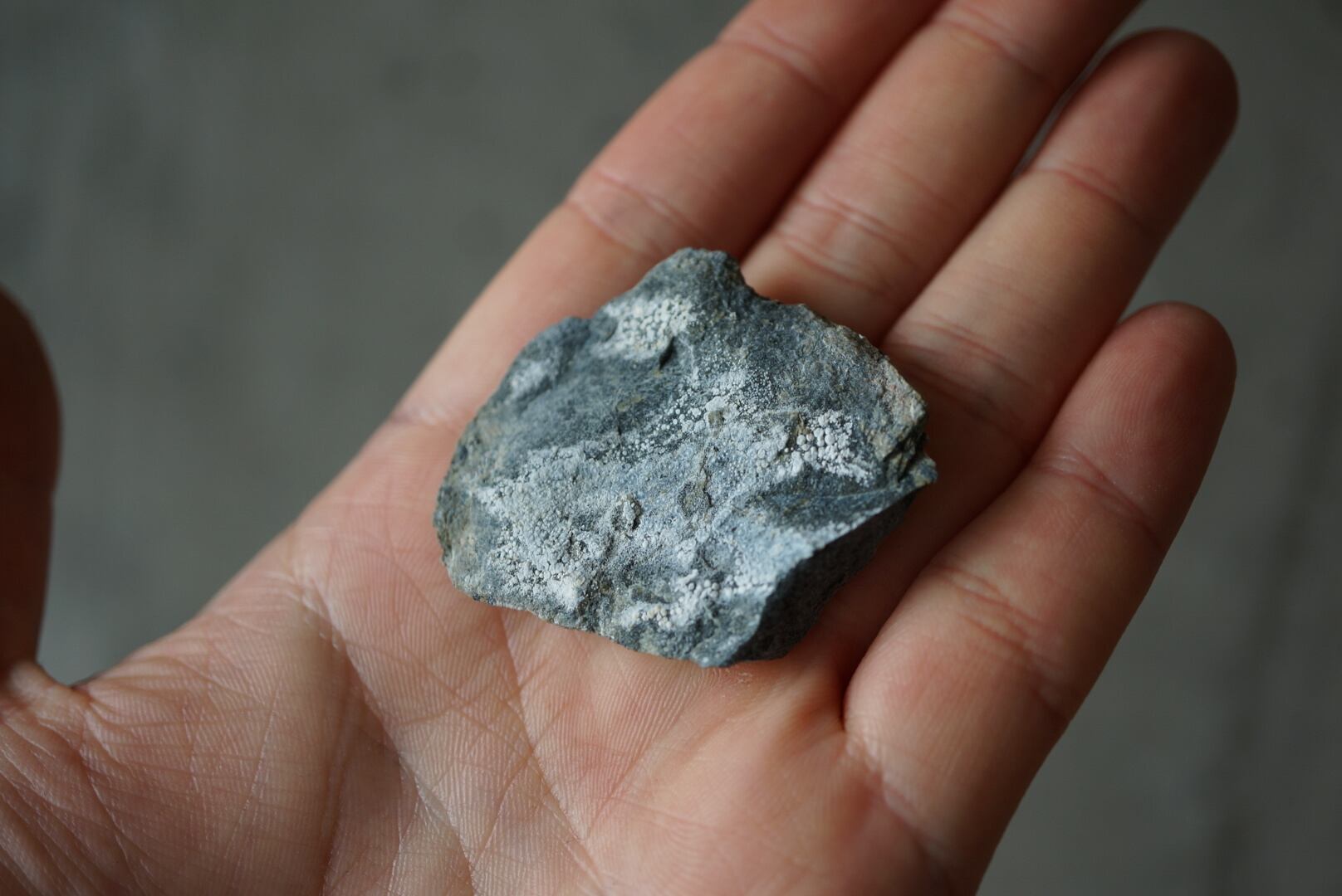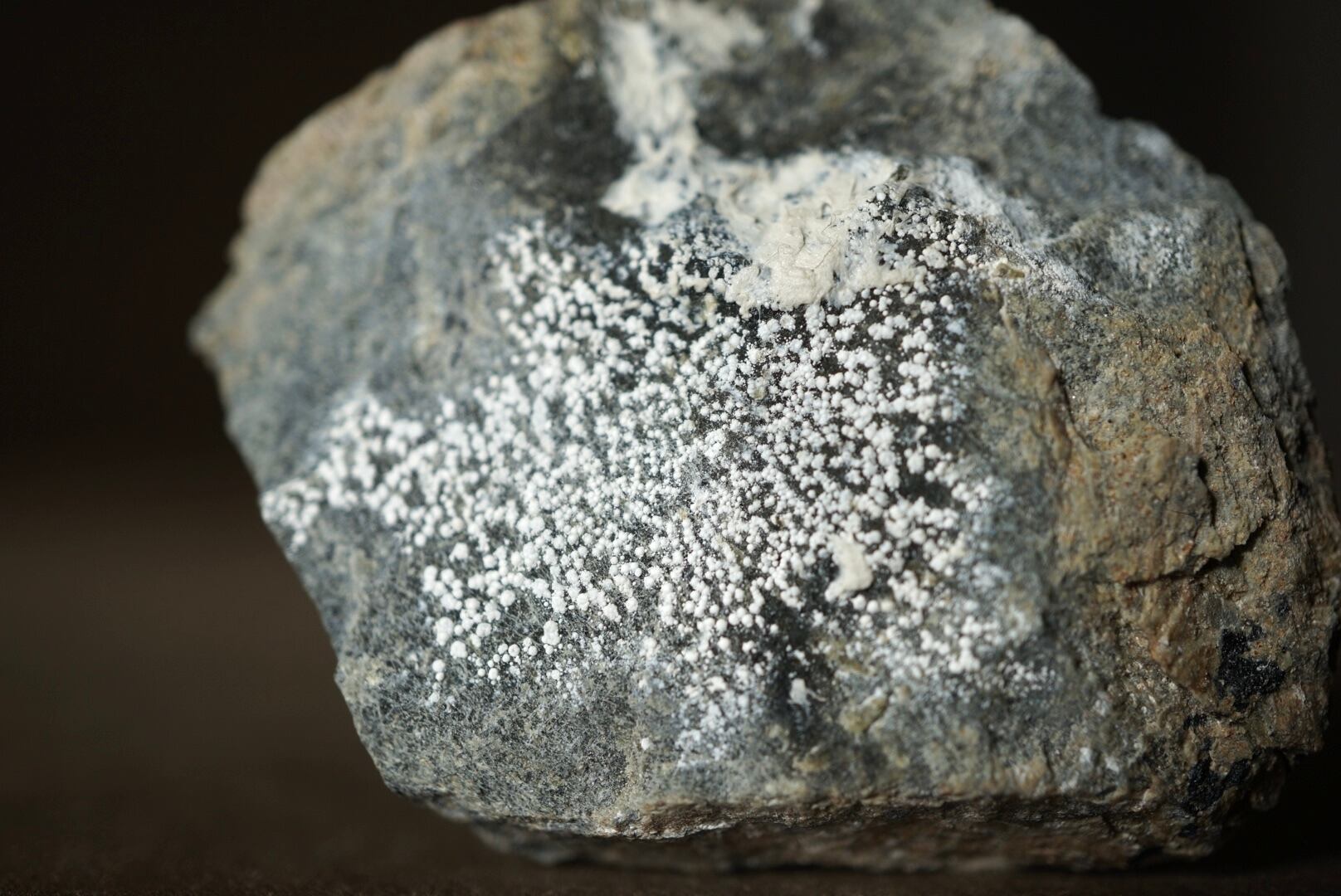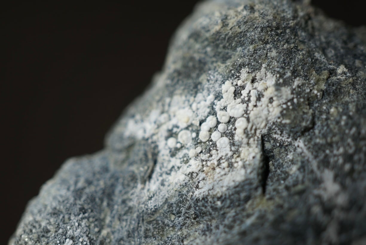 その微細で広がる白色の結晶がまるで苔や菌糸のように岩肌を覆い、無機物でありながらどこか生物的な趣を感じさせる特異な鉱物です。