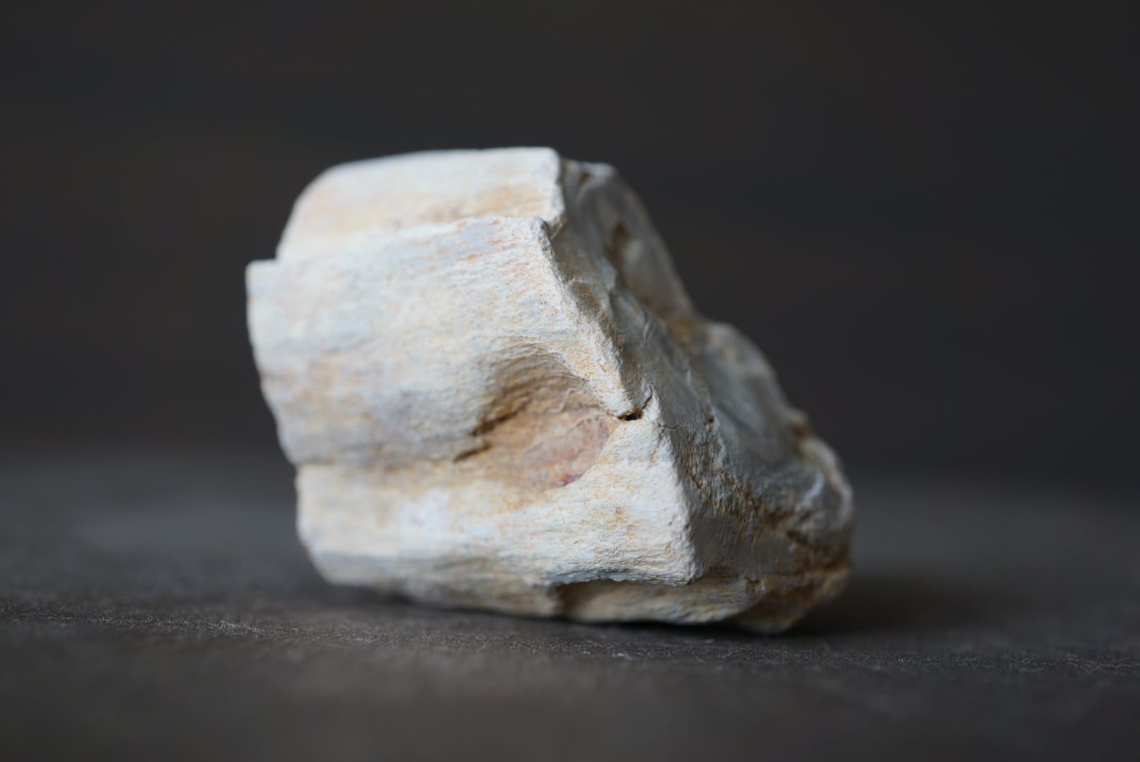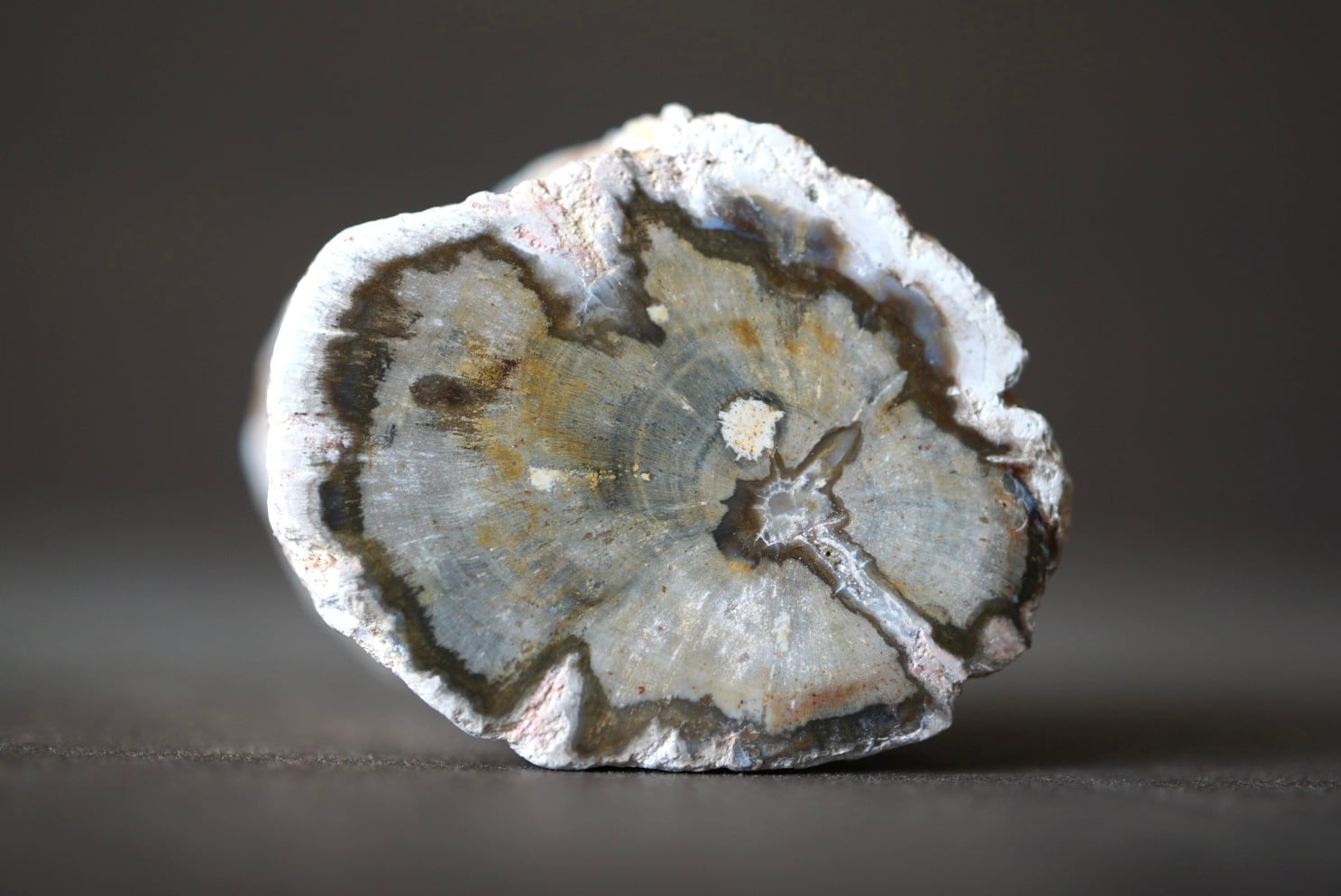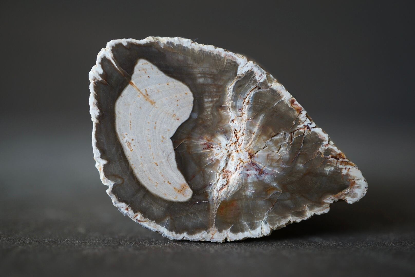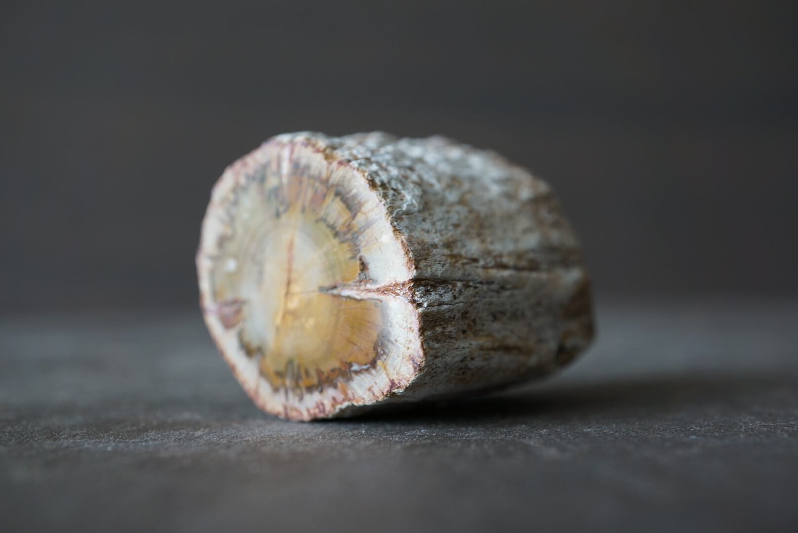 本品はよく見られる薄くスライスされたスラブ状のものではなく、木の幹のかたちや木肌の質感をそのまま留めた丸太状1面研磨の立体型。