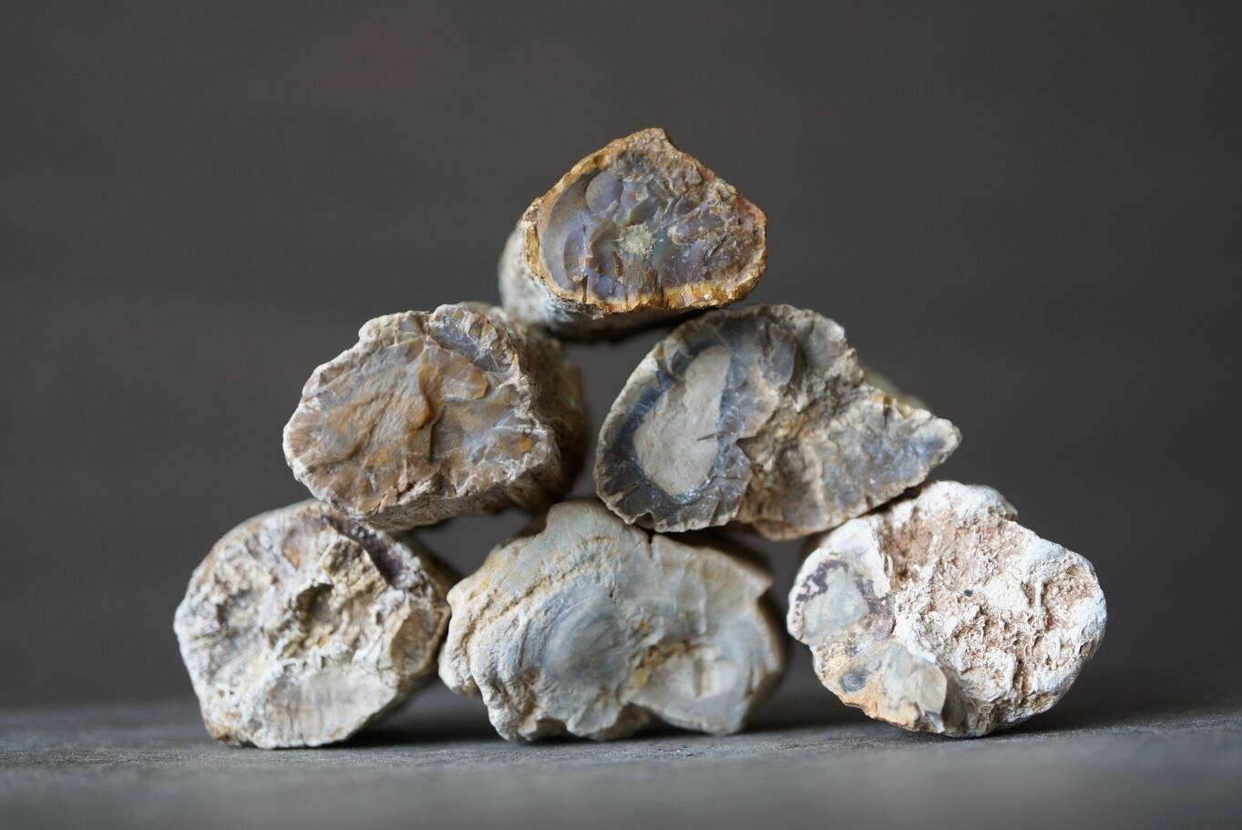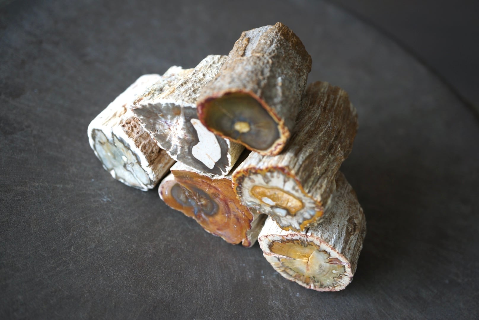 断面には年輪のような模様と多様な色彩が現れており、赤や黄、青や緑など、個体ごとに全く異なる表情を見せます。