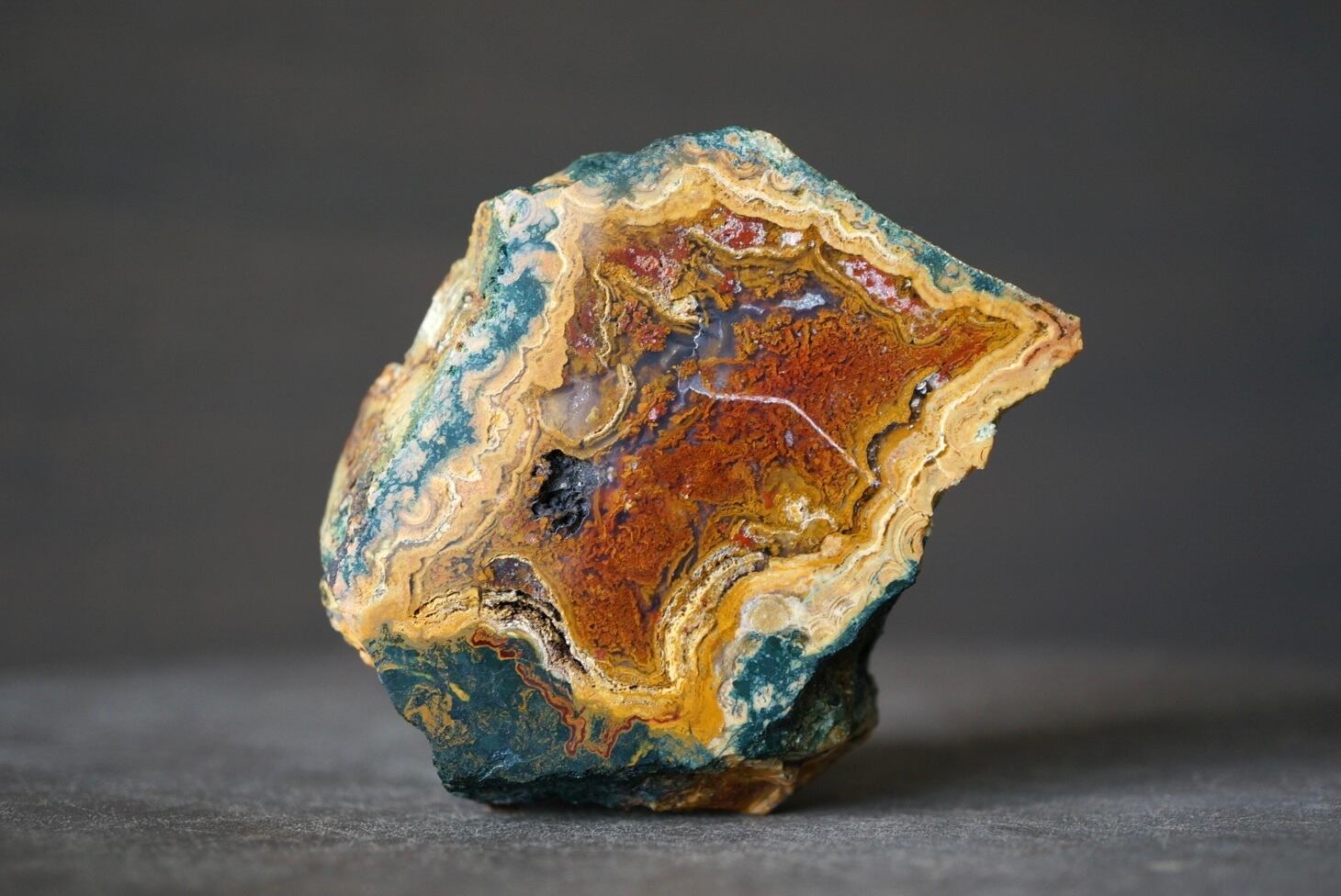 外殻のセラドナイトによる深いグリーンとコアのブラウンカラーが特徴で、内部にはモス状のプルームや透明のプルームを宿しており、他産地の瑪瑙では見られない美しい個性を持った一石です。