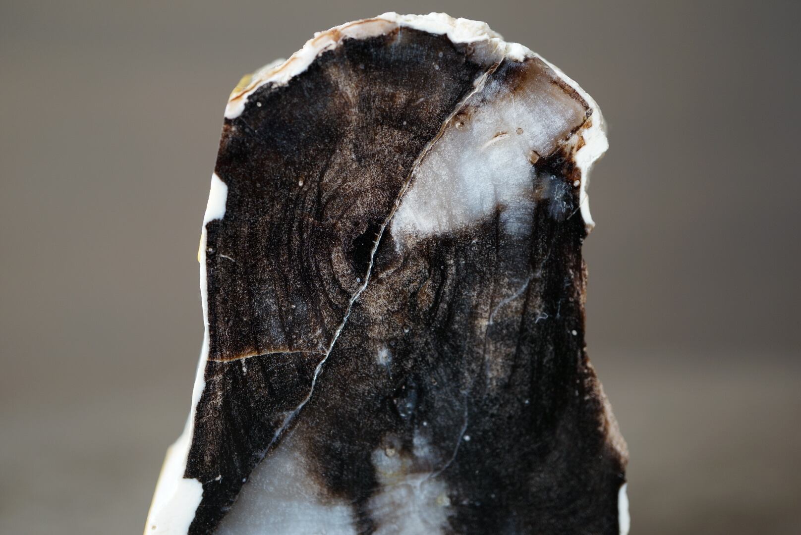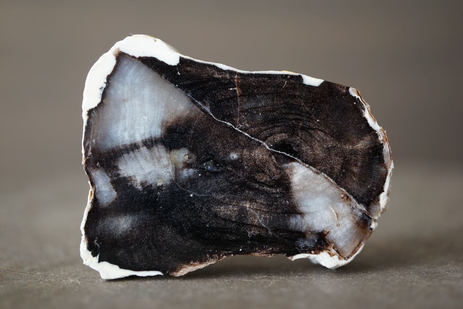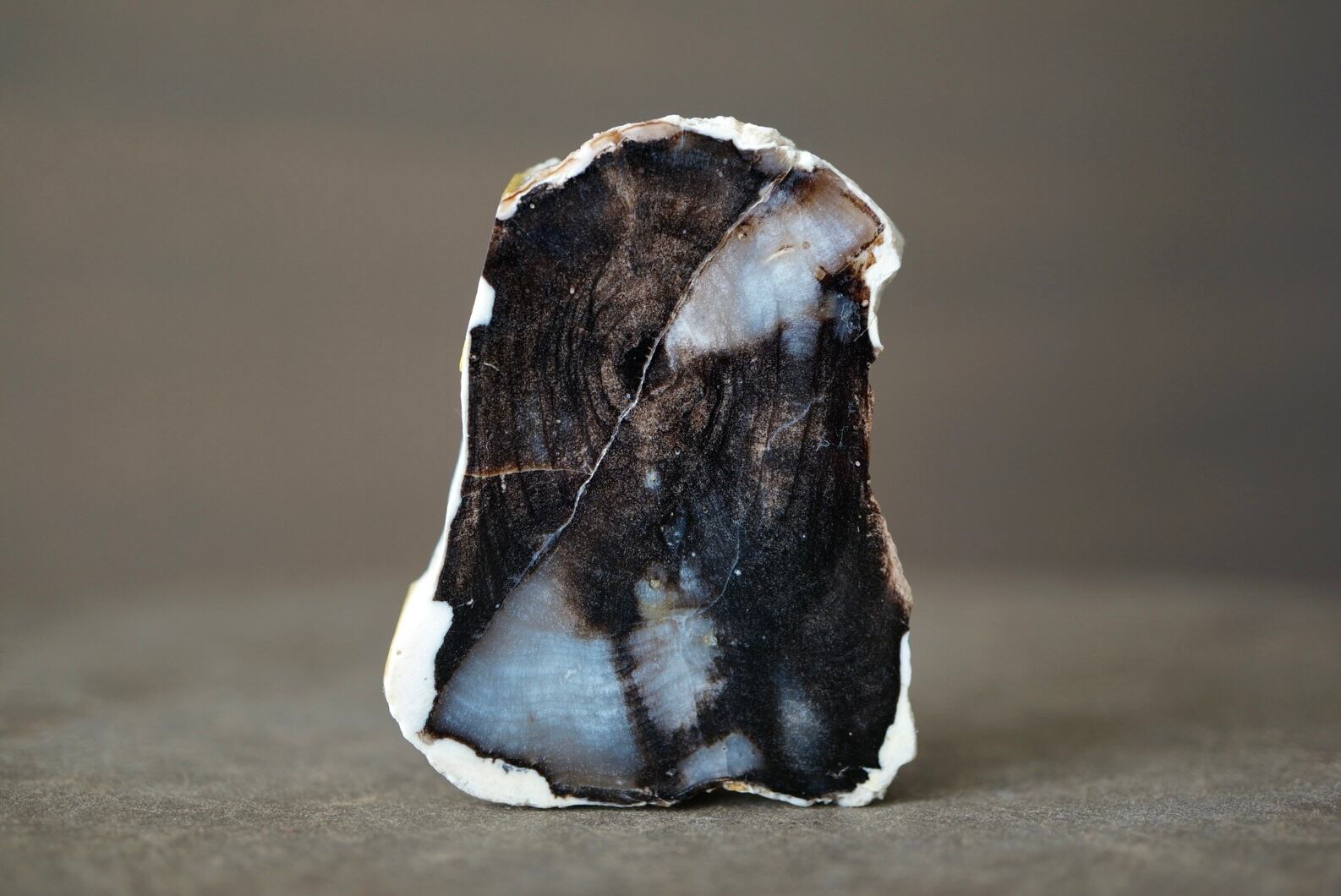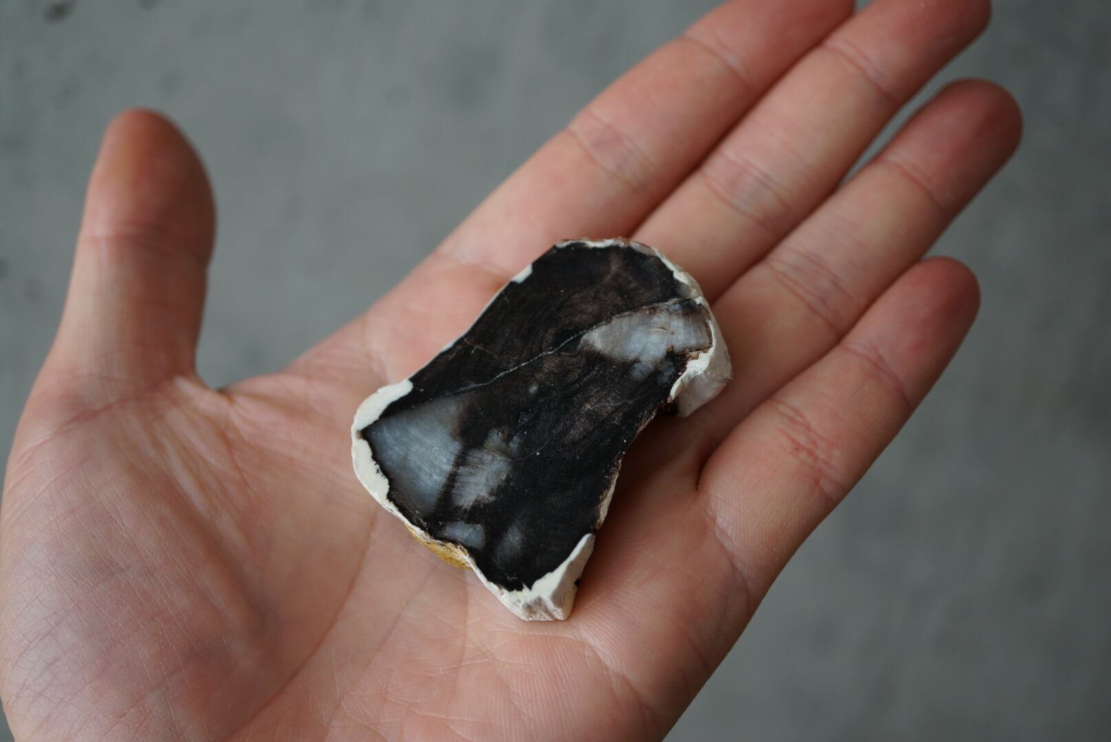 本産地の珪化木は白い縁取りと、深い黒色の美しいコントラストが特徴です。