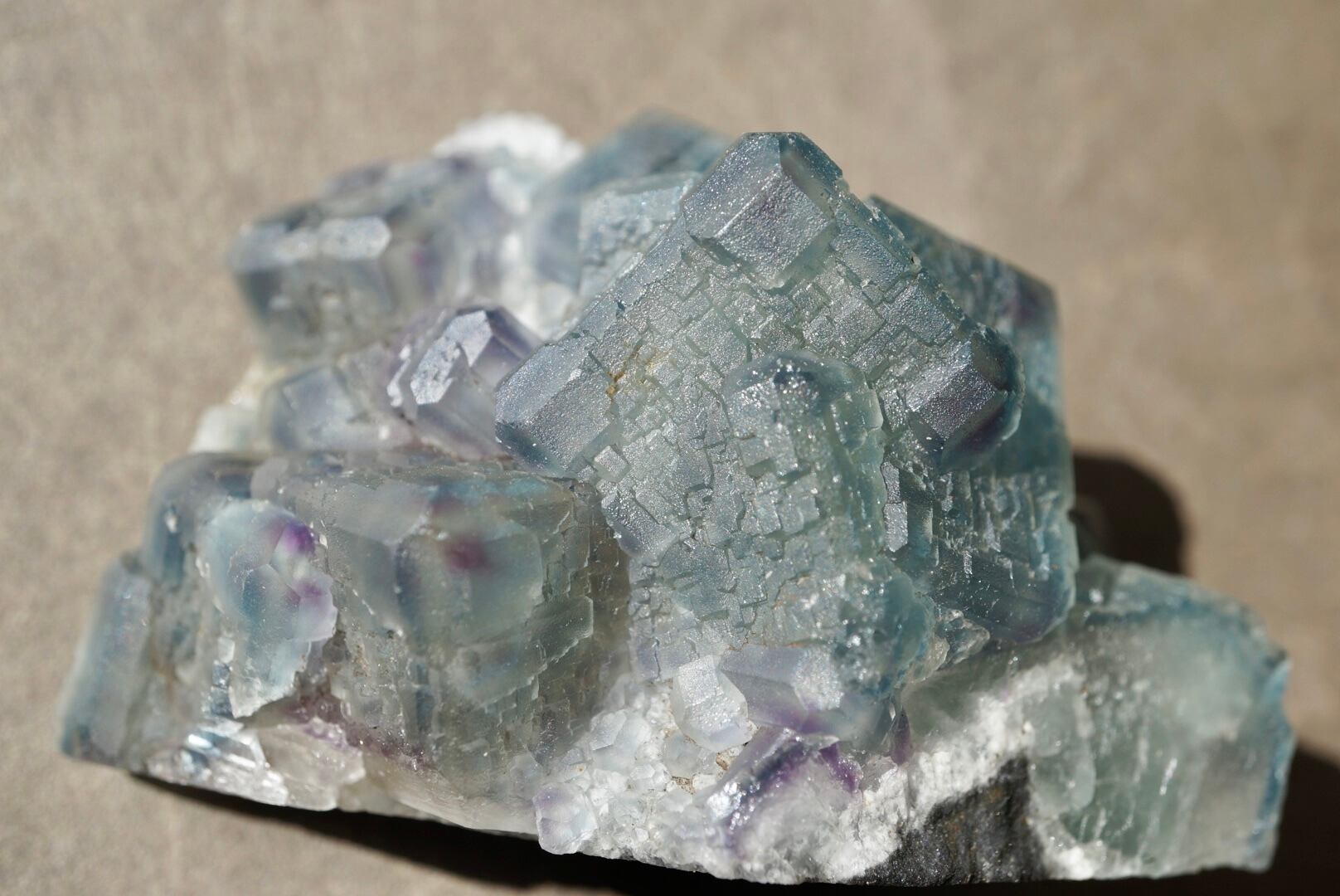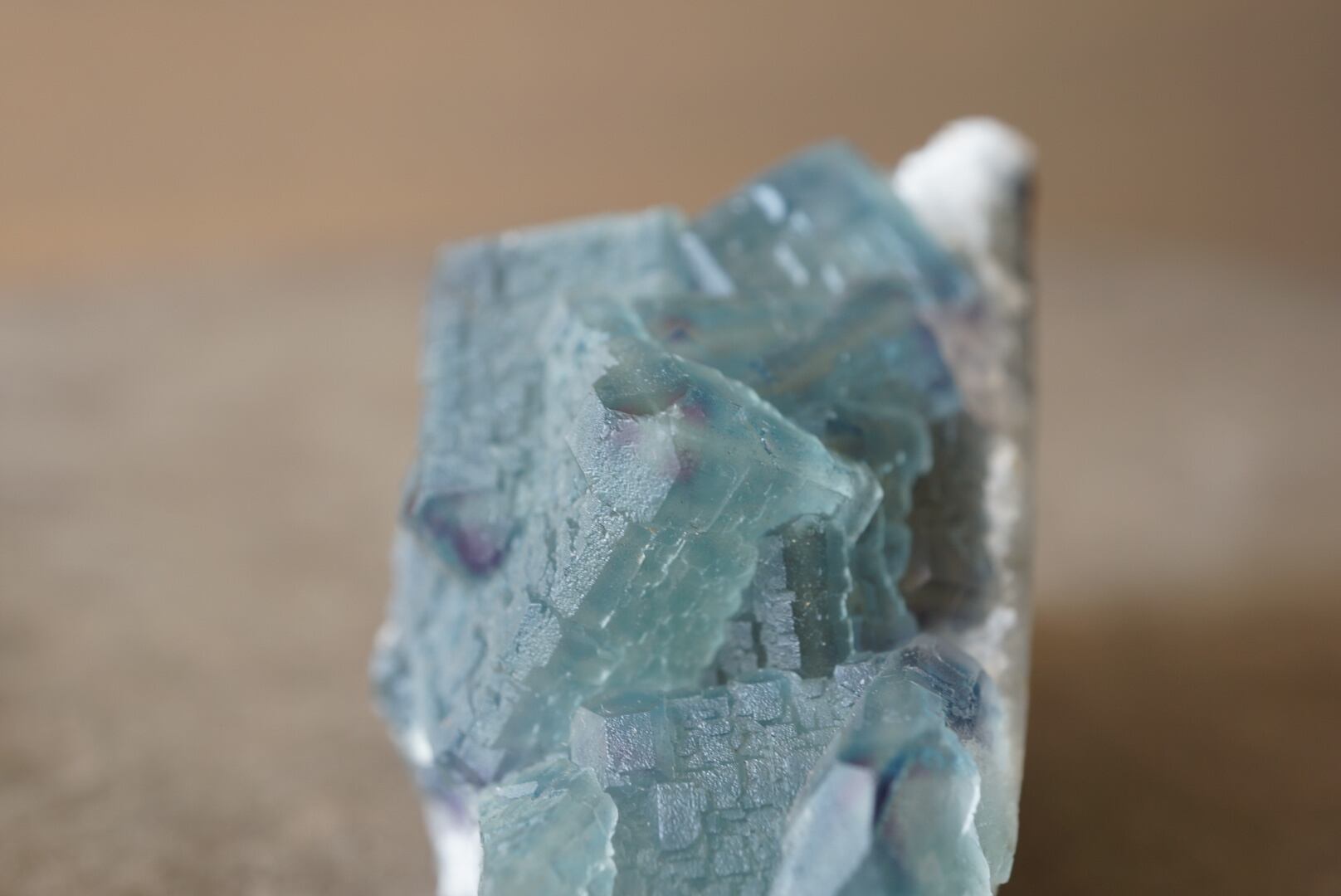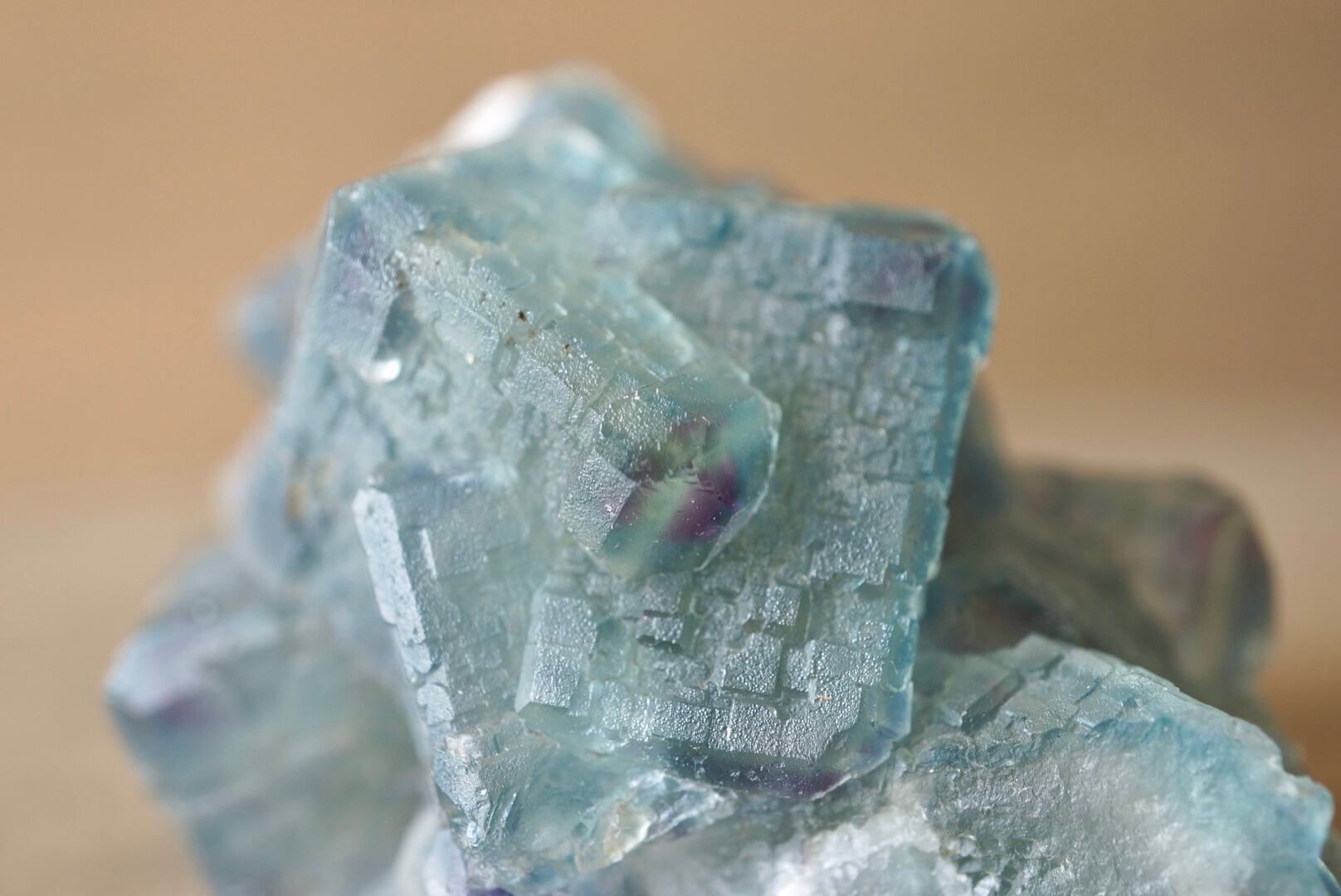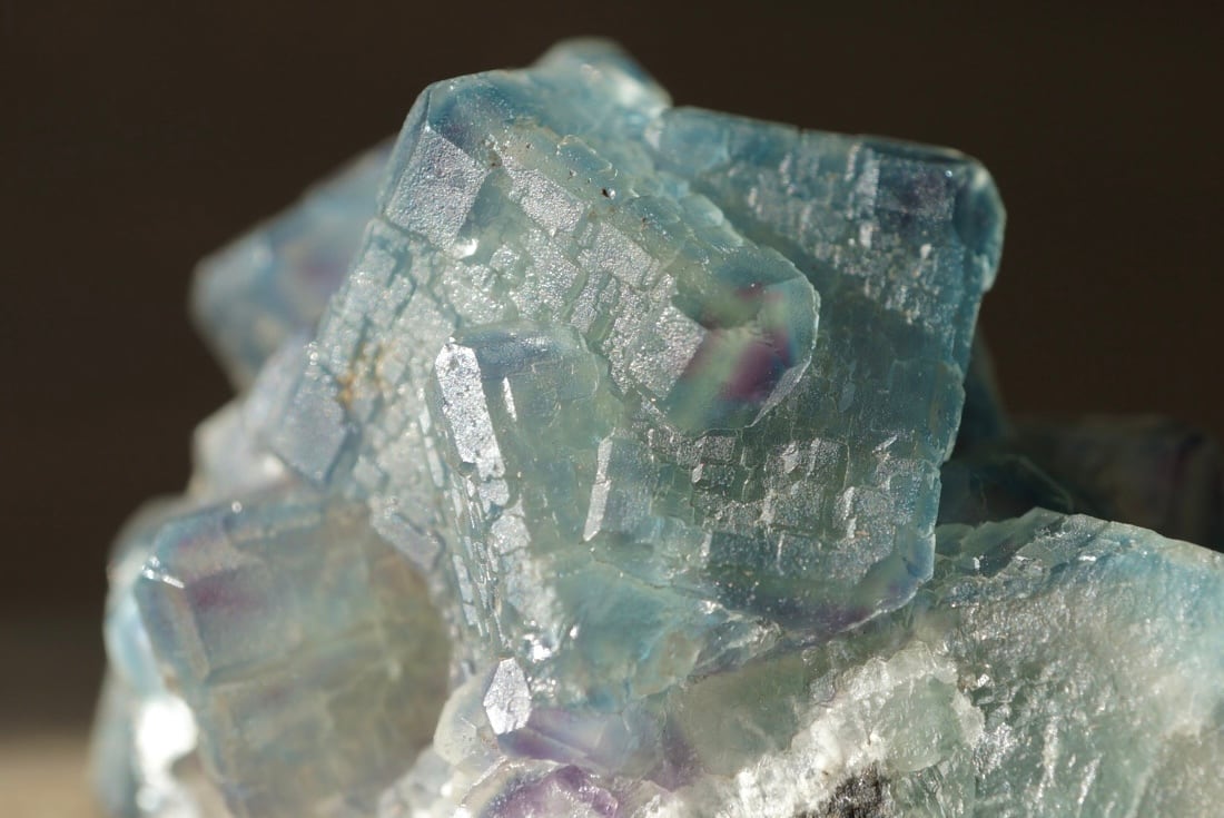 四角い結晶面には直線的な凹凸が表れ、この特徴的な模様から「QR code fluorite」とも呼ばれています。