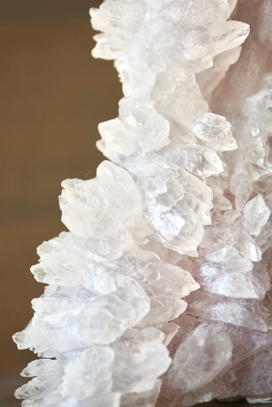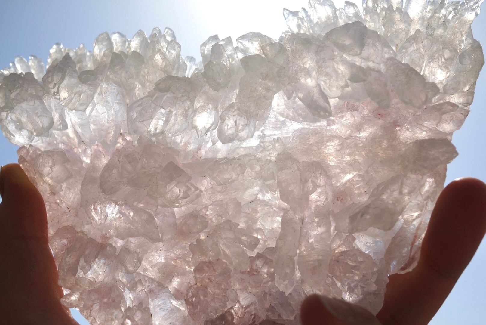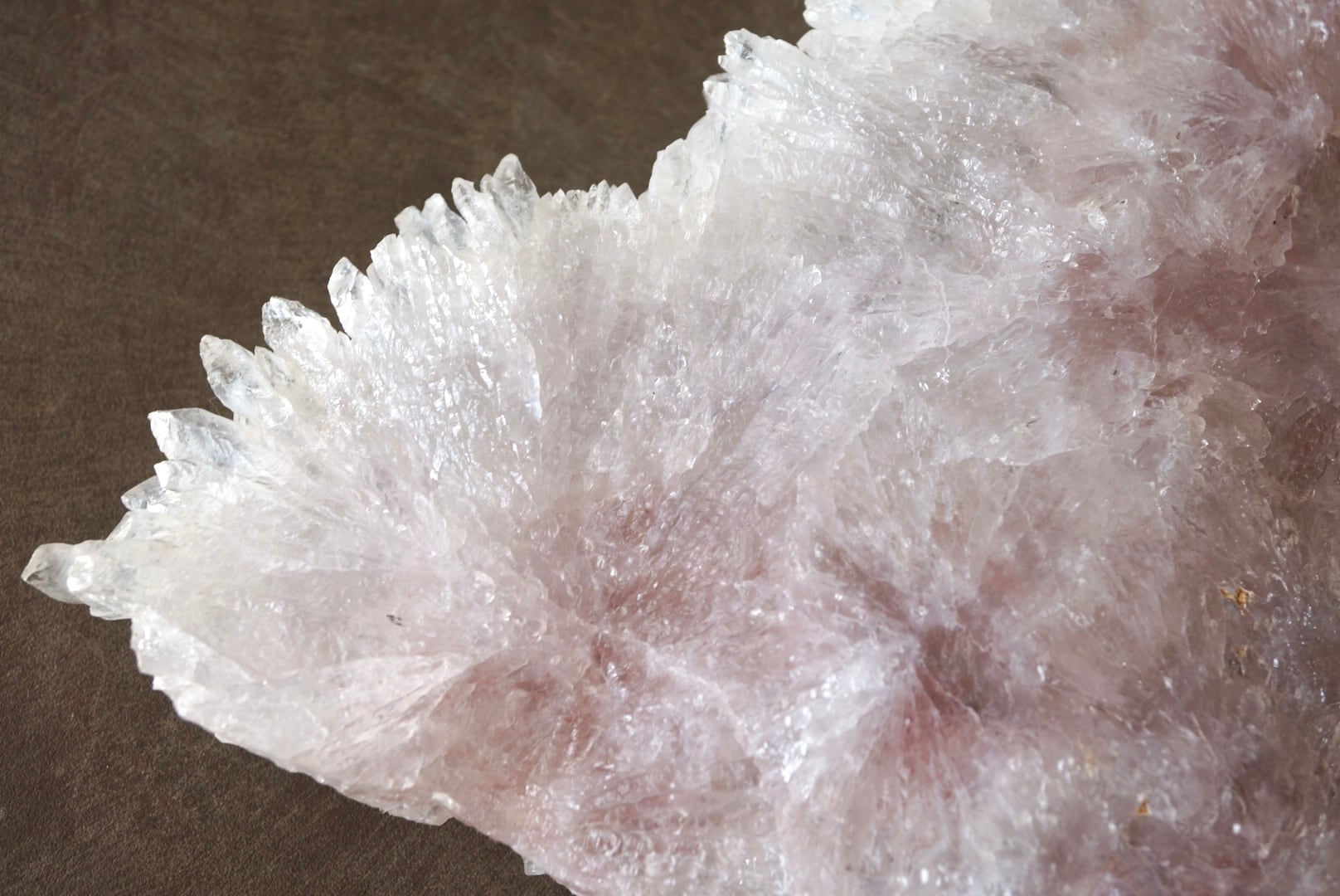 扇形に広がった結晶には微量の鉄イオンが含まれ、淡いピンク色が静かに表れています。