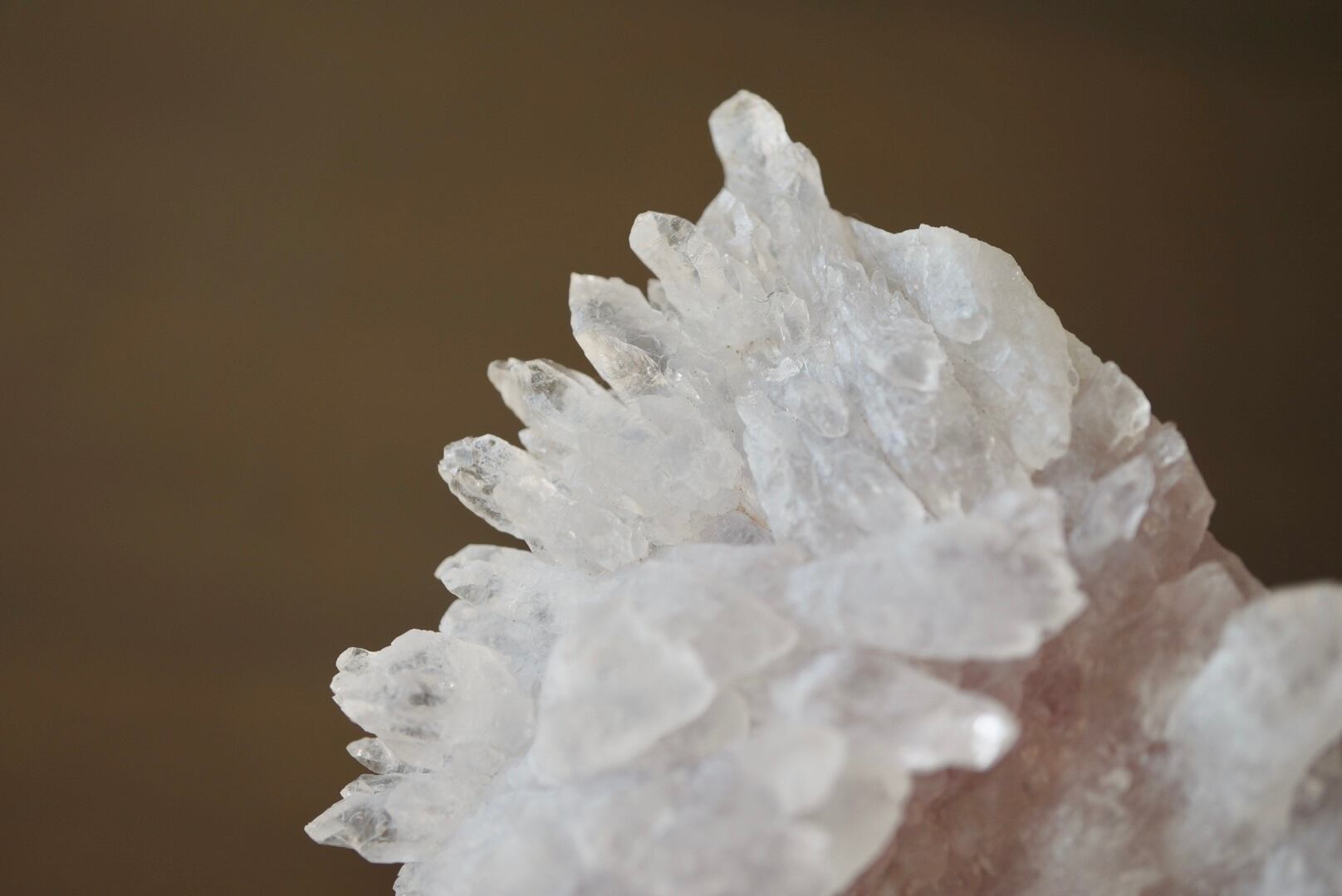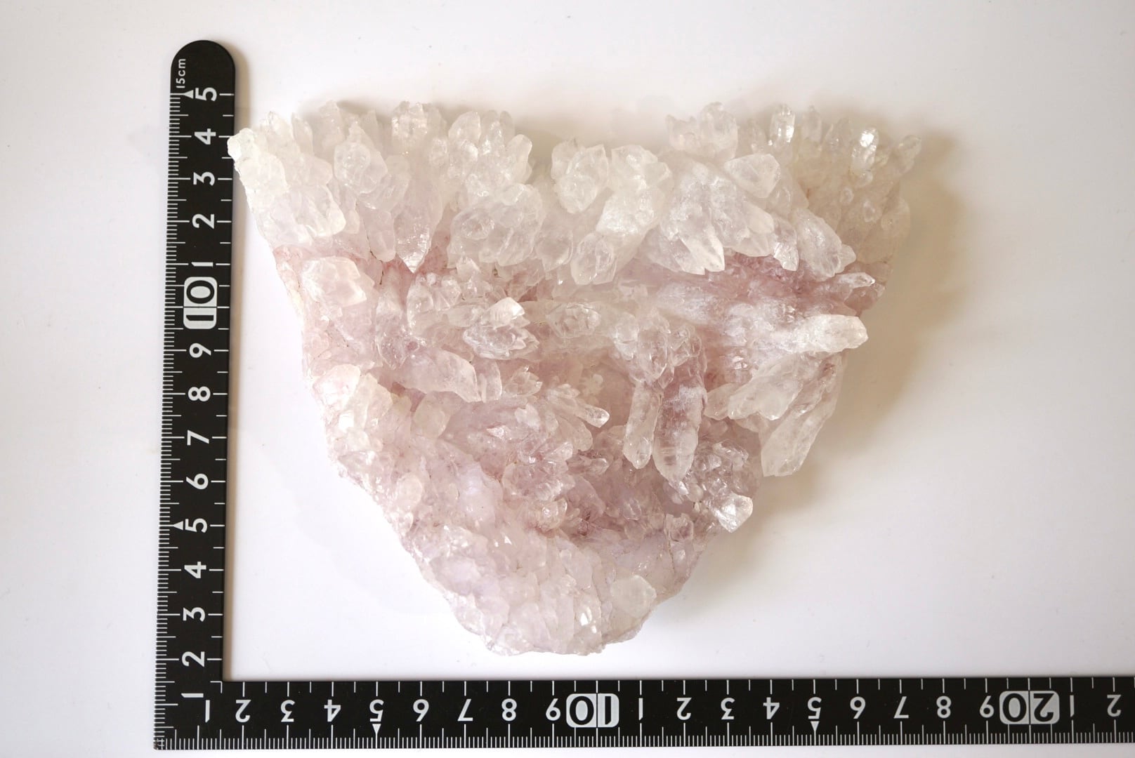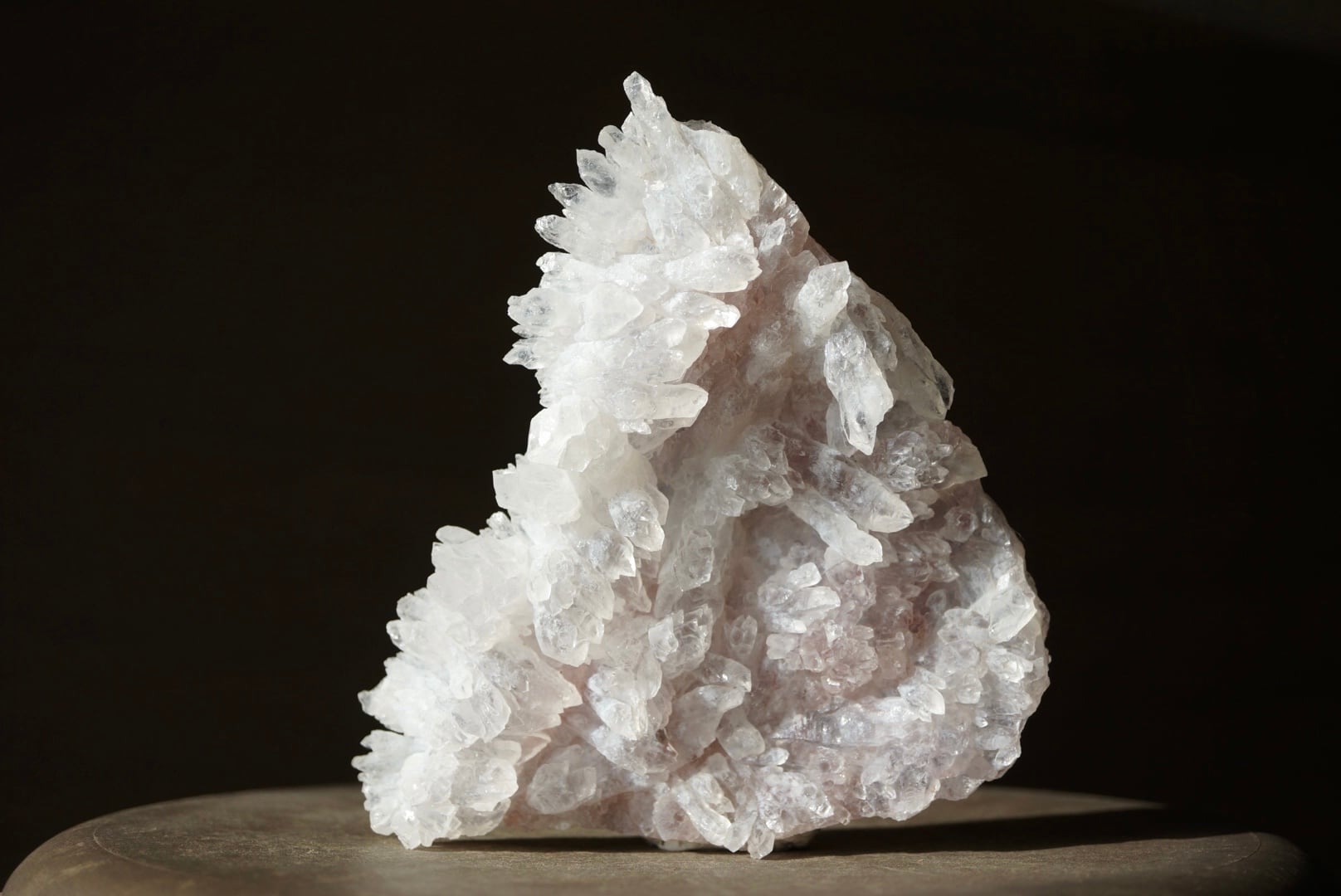 扇形に広がった結晶には微量の鉄イオンが含まれ、淡いピンク色が静かに表れています。