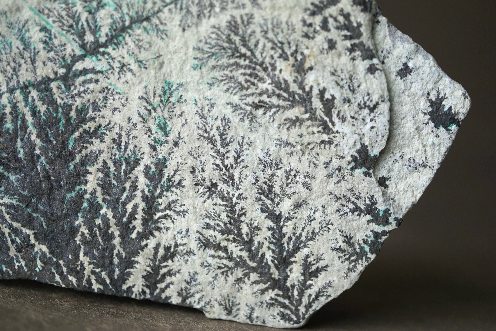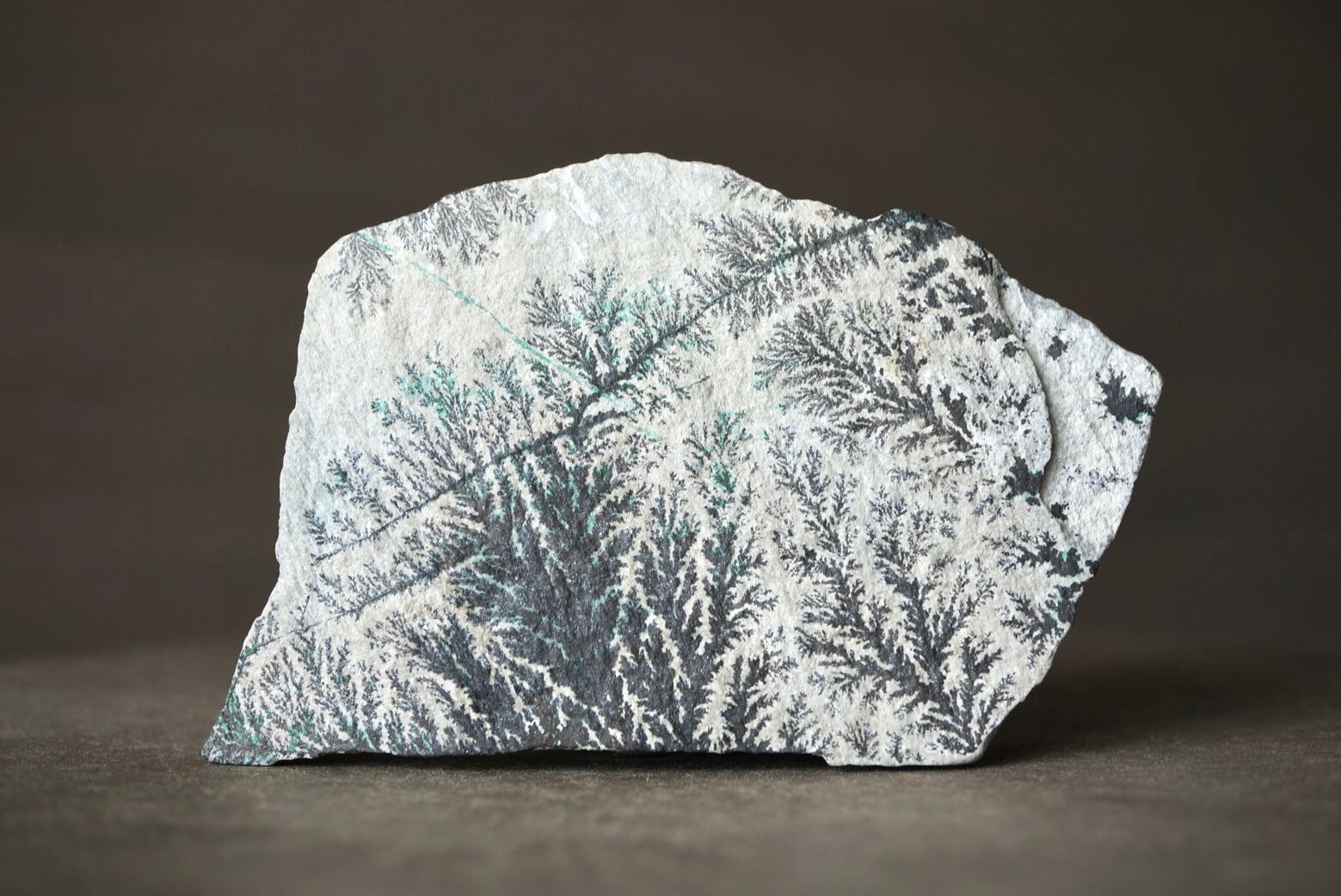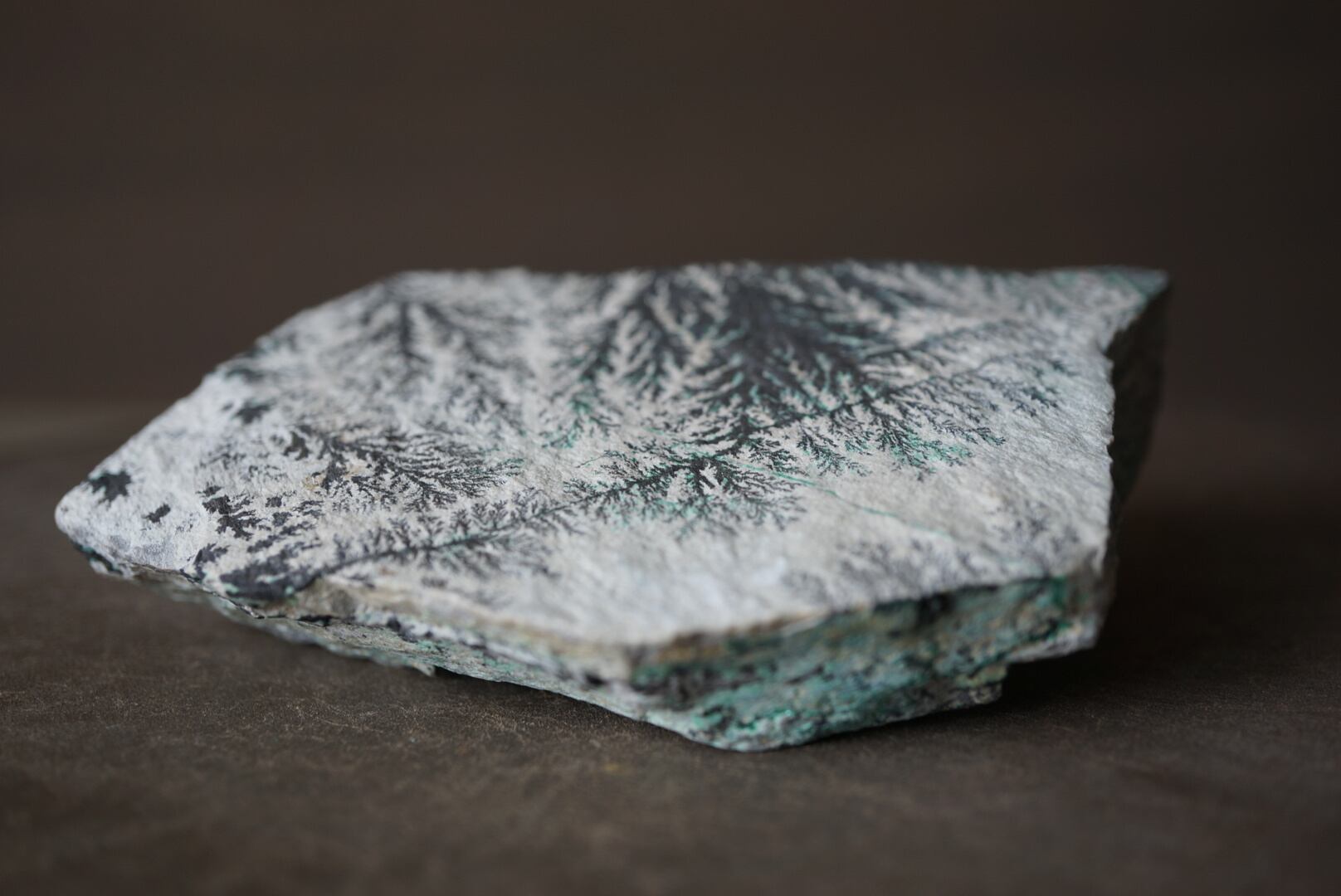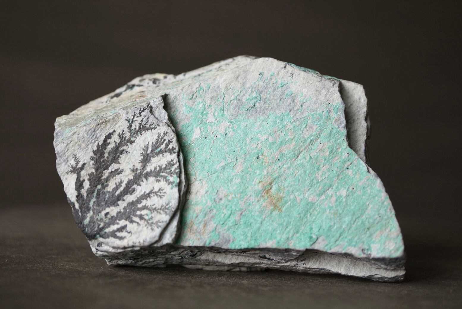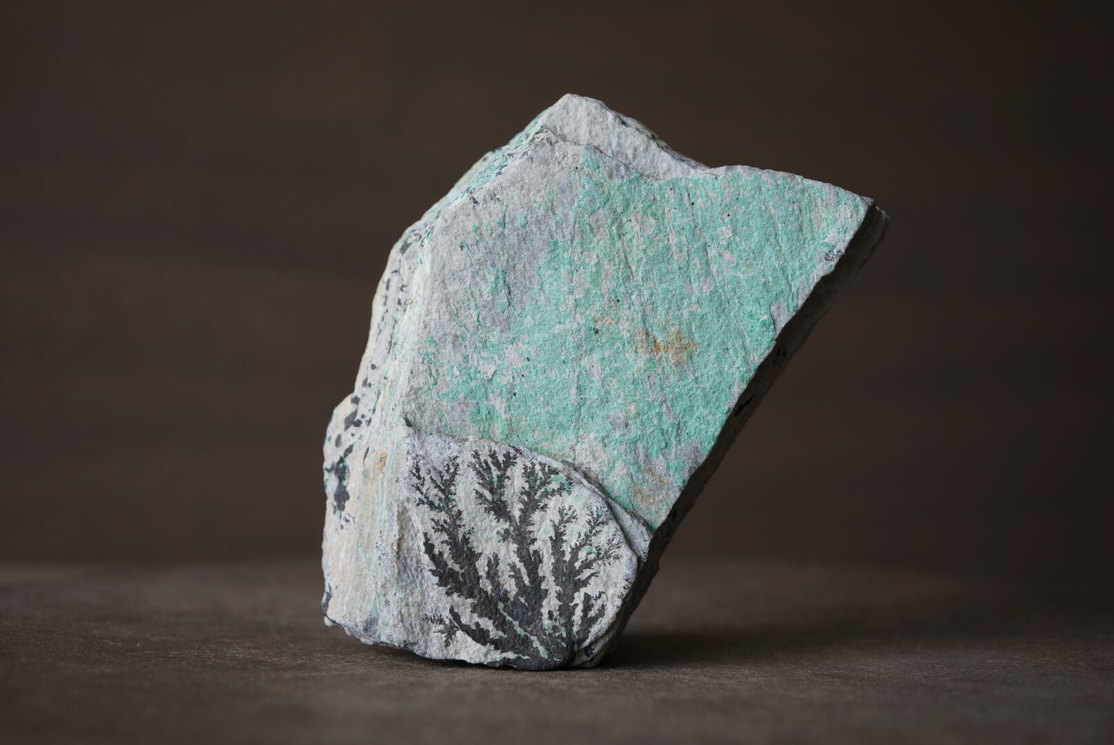 水色のクリソコラを含んだ鮮やかな母岩にデンドライトが表れた珍しい一石。