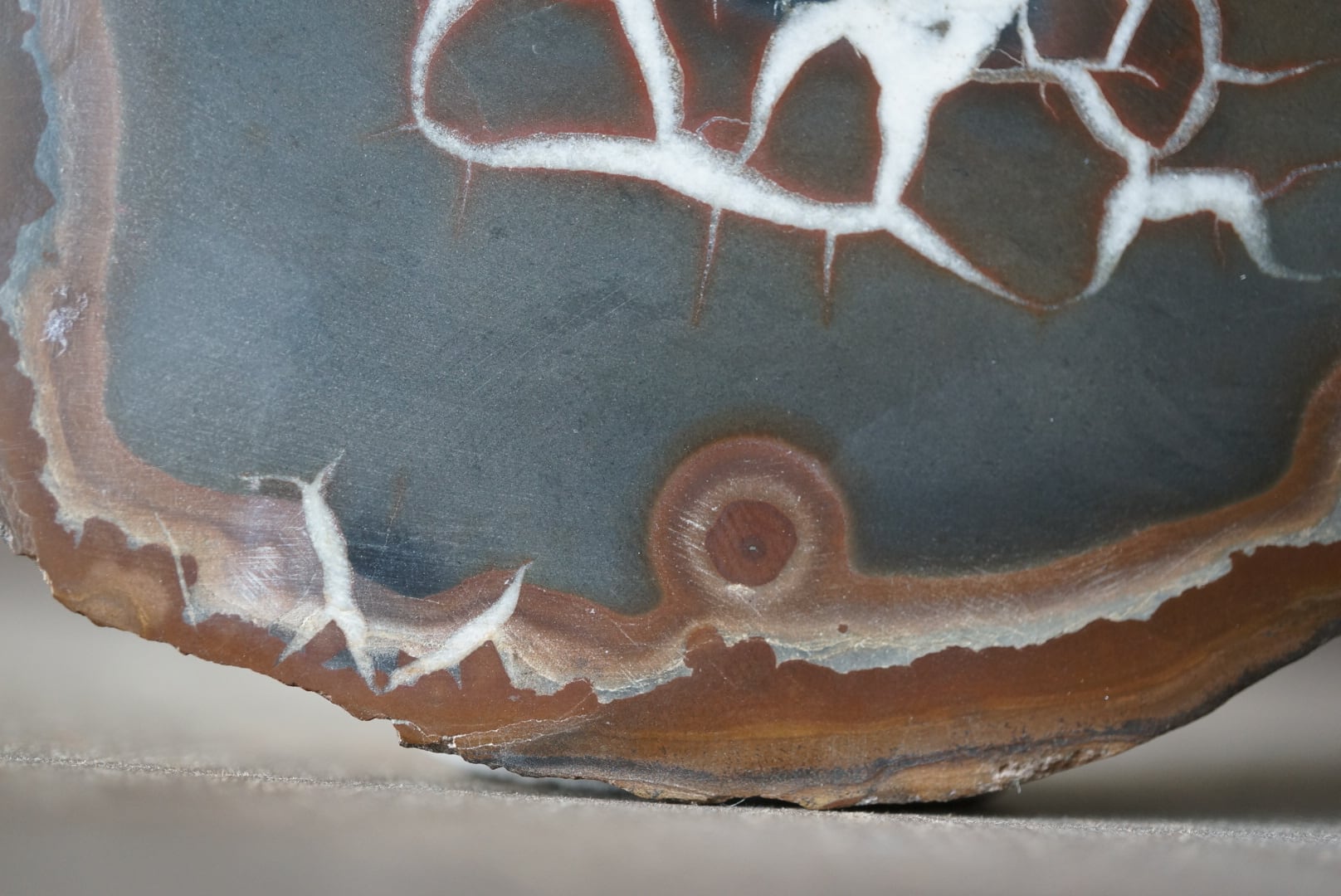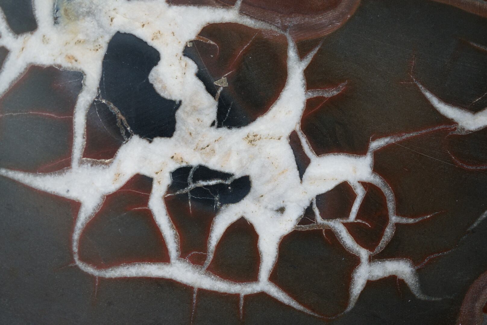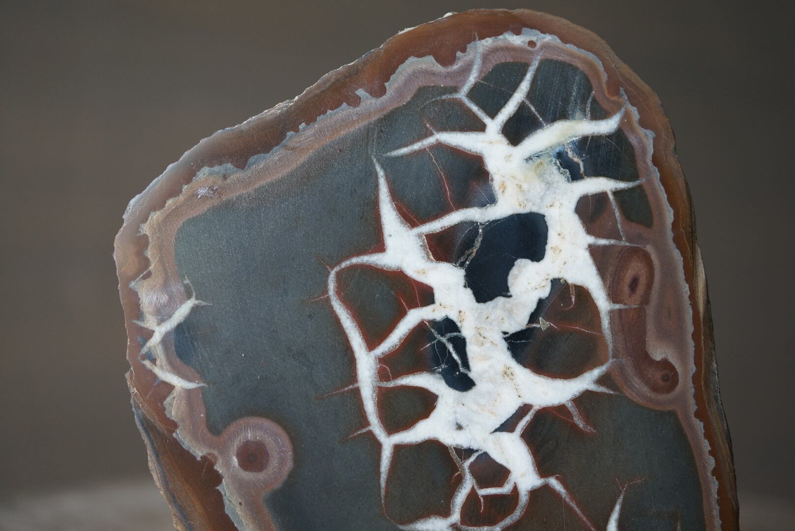 本石の断面にはカルサイトが亀裂状に結晶化し、岡本太郎的、アボリジニアート的な模様が表れています。