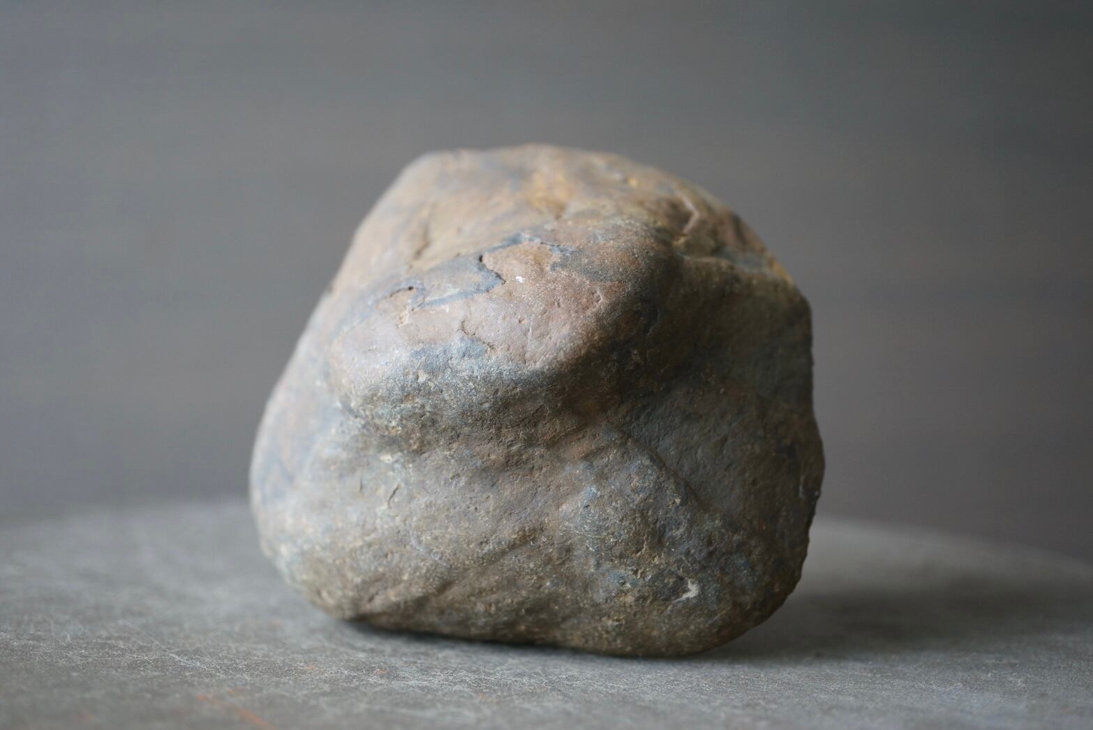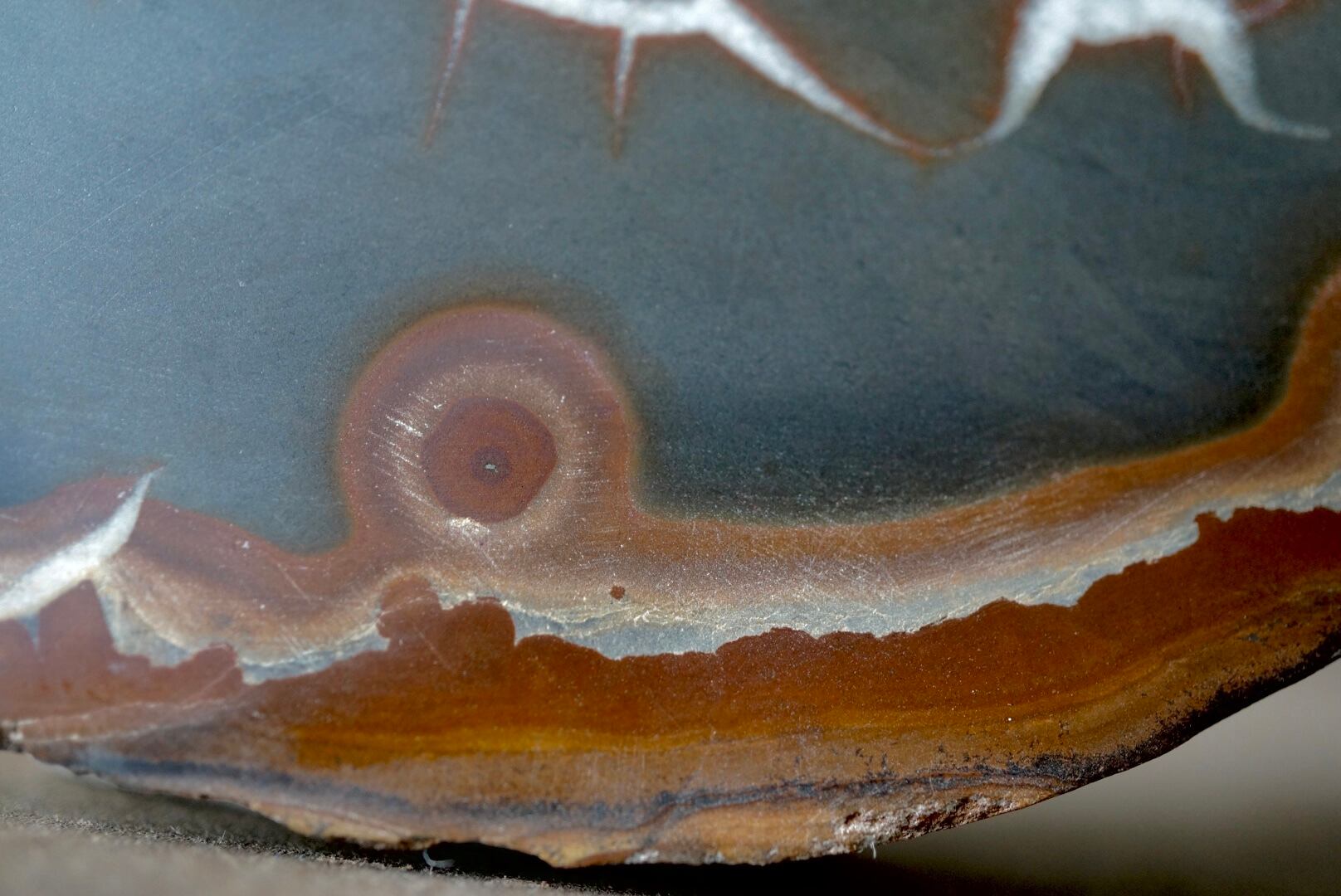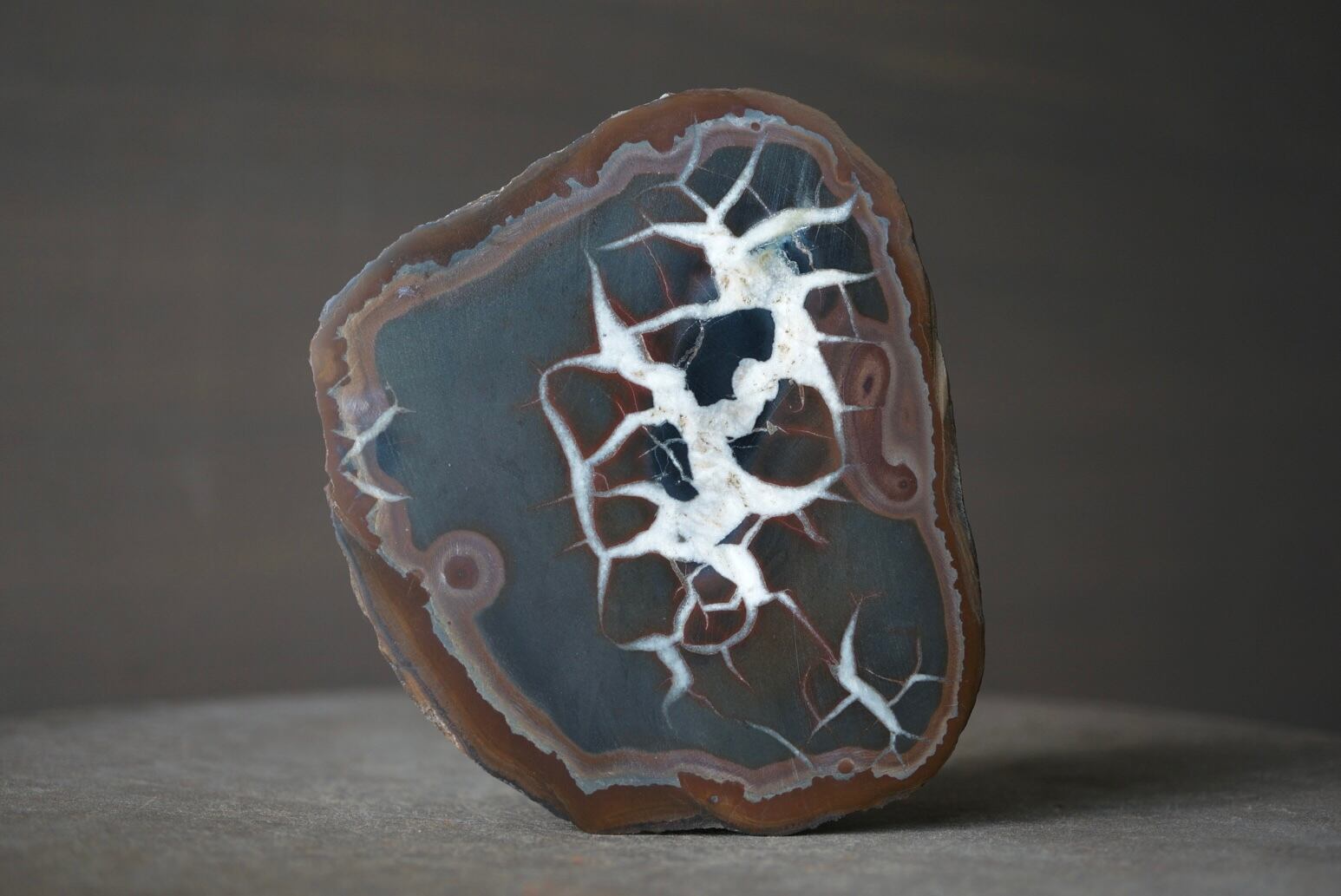 本石の断面にはカルサイトが亀裂状に結晶化し、岡本太郎的、アボリジニアート的な模様が表れています。