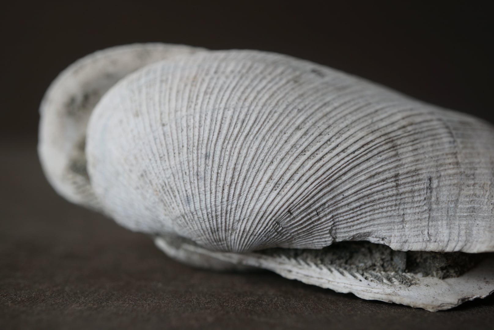 ビョウブガイは左右非対称に捻れた殻と密に走る放射肋が特徴のフネガイ科二枚貝です。