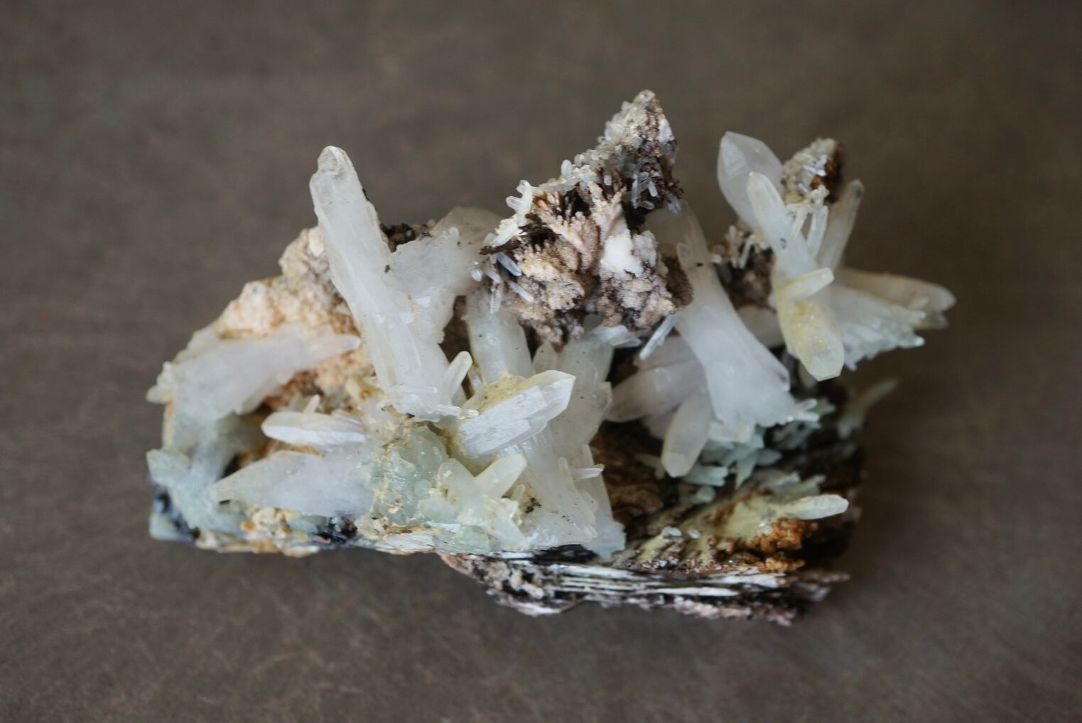 乳白色の柱状結晶はクォーツ、淡いピンクを帯びた微細な粒状部分にはロードクロサイト(菱マンガン鉱)、母岩の表面には白いドロマイト(苦灰石)結晶がみられます。