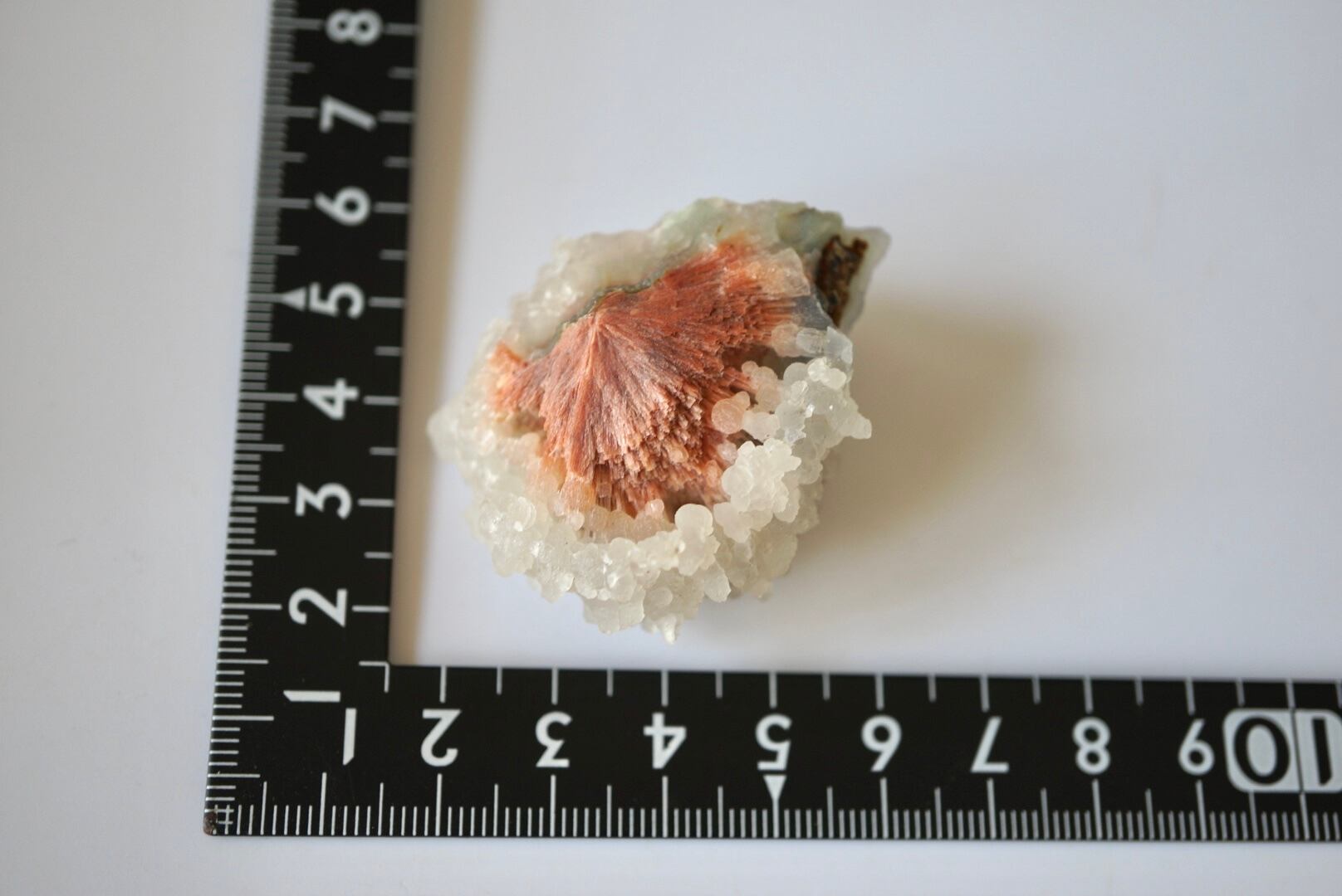 マンガンにより赤く変色したスコレサイトが放射状に広がり、周りには泡のような半透明のカルセドニーが覆われています。