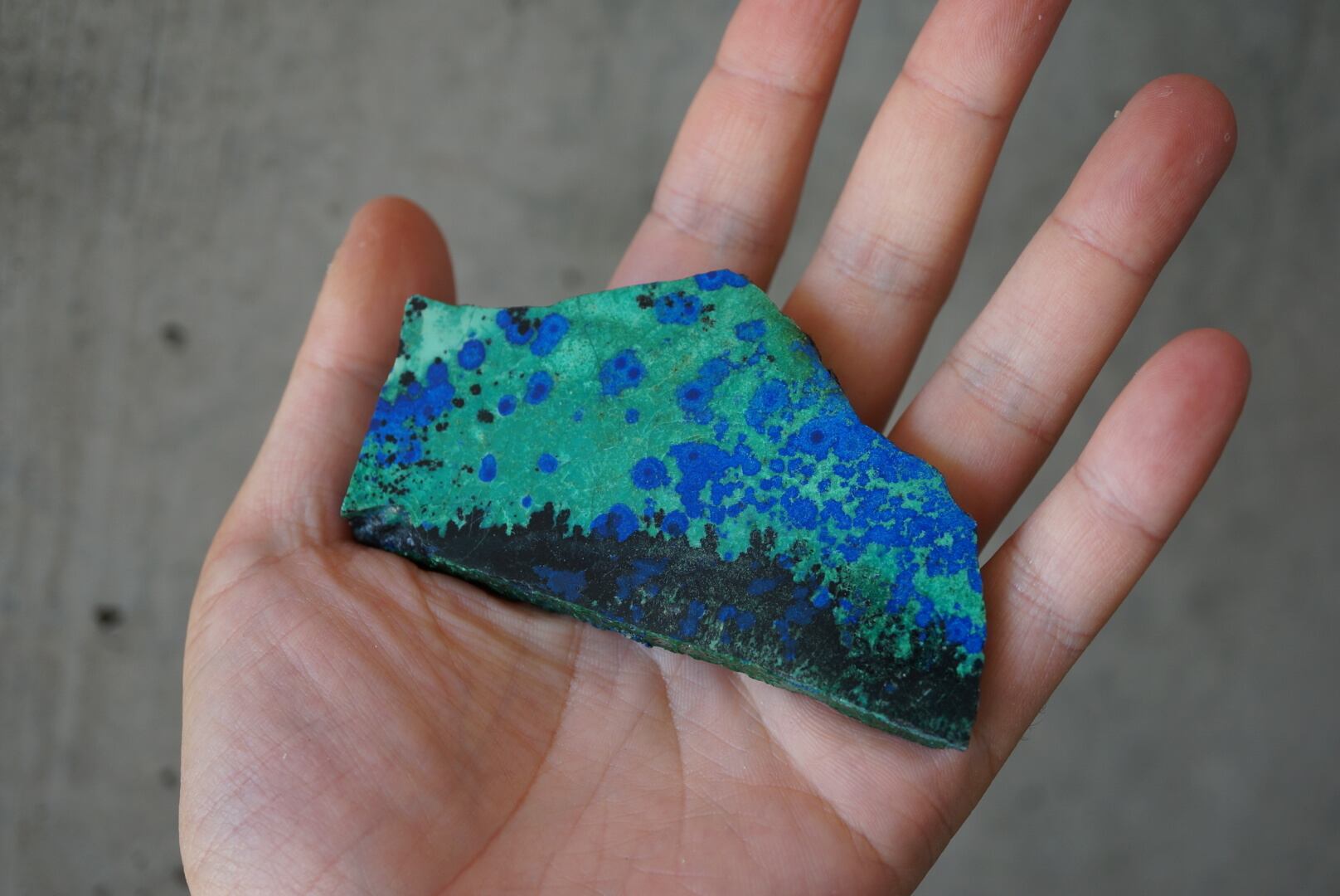 比較的流通量の多い安徽省産マラカイトですが、本石のような断面を見せたスラブタイプは珍しく、青々とした色彩が鮮烈にあらわれています。