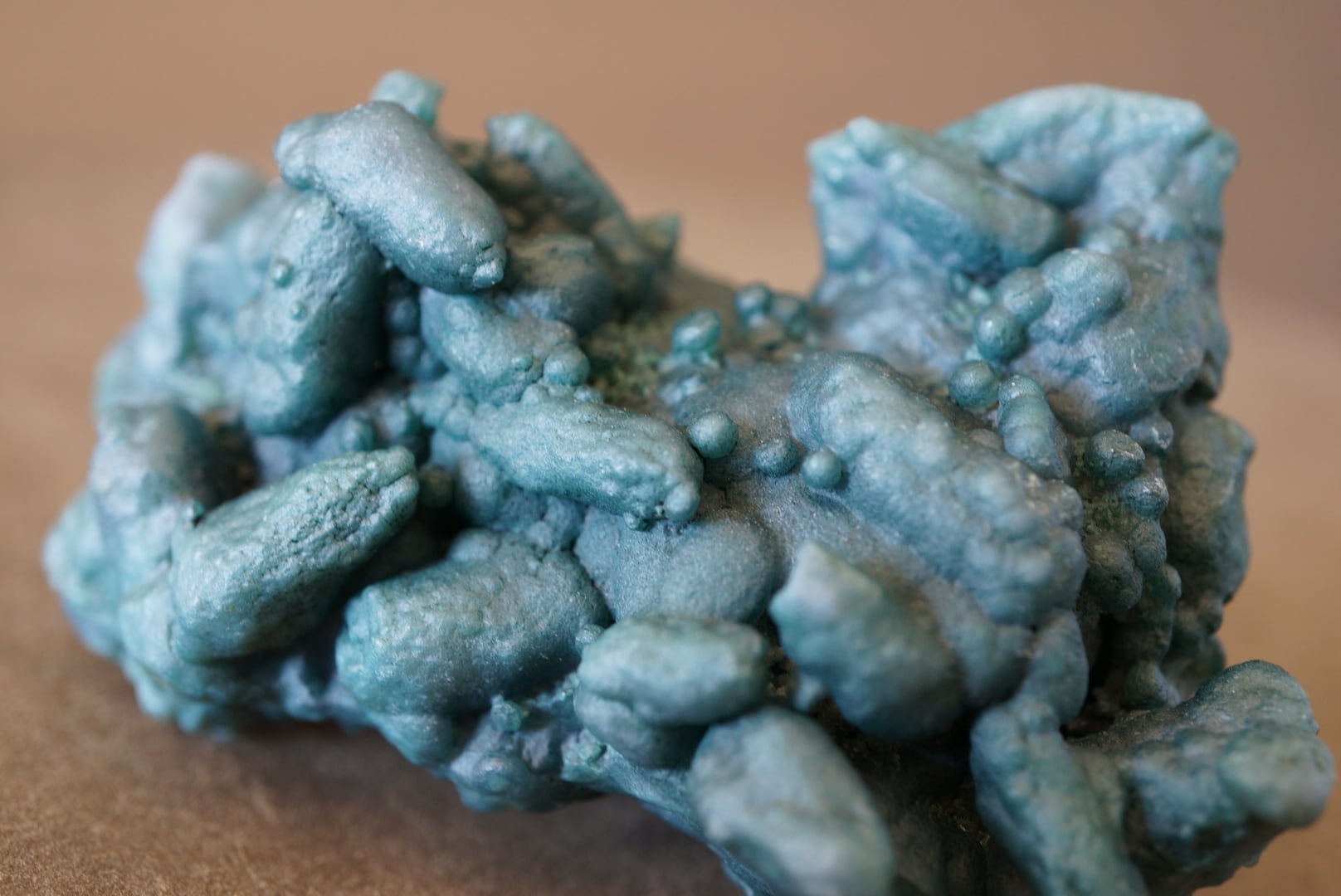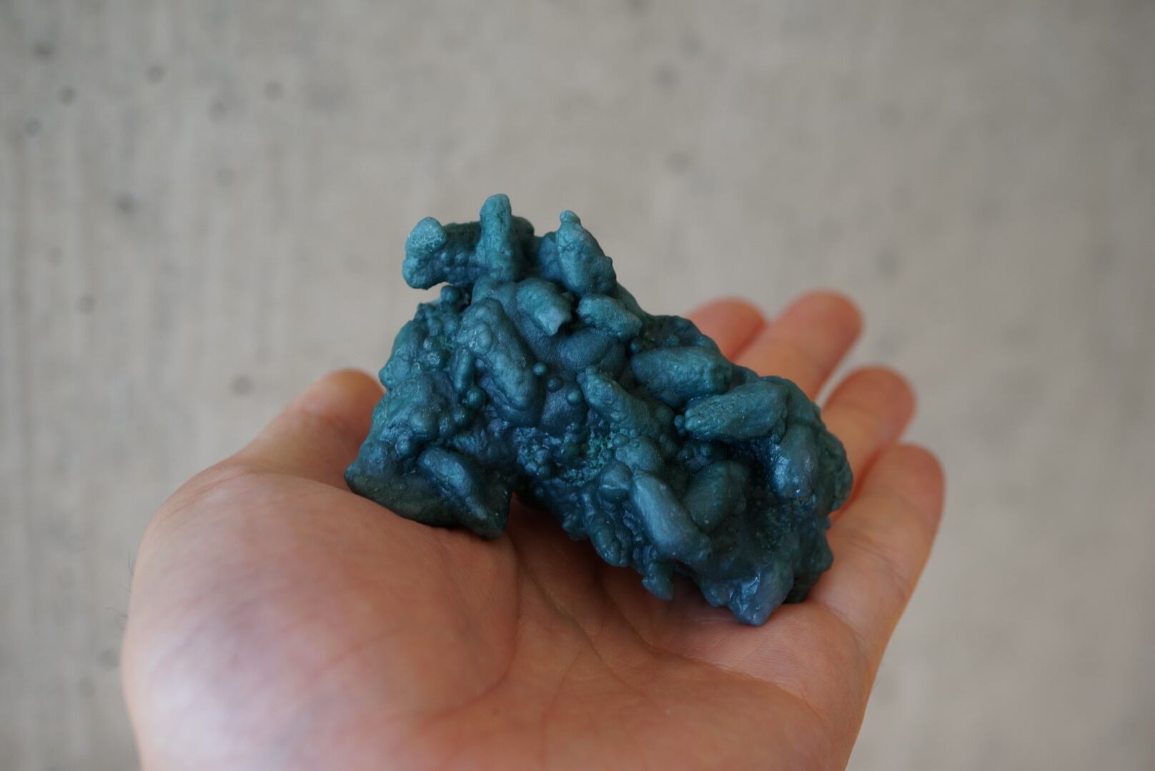 ブロンズ彫刻を想わせる深い青緑のマチエールと、突起状と葡萄状の結晶が交錯した造形が唯一無二の存在感を放っています。