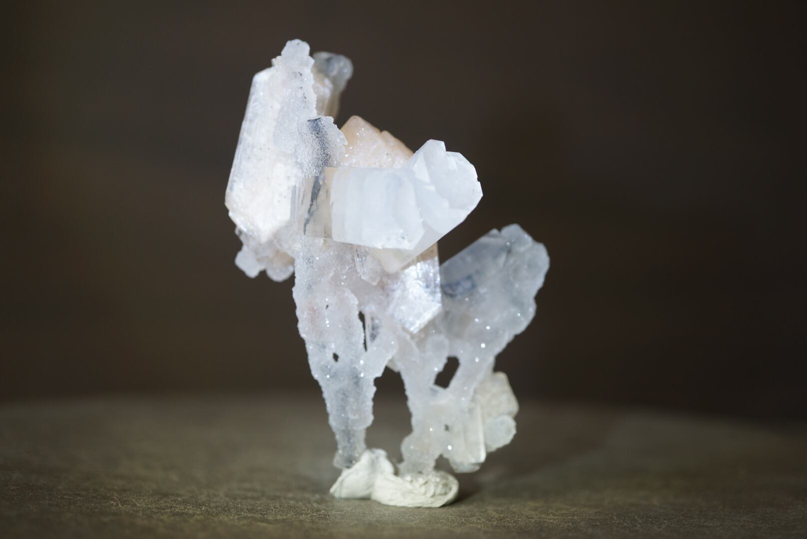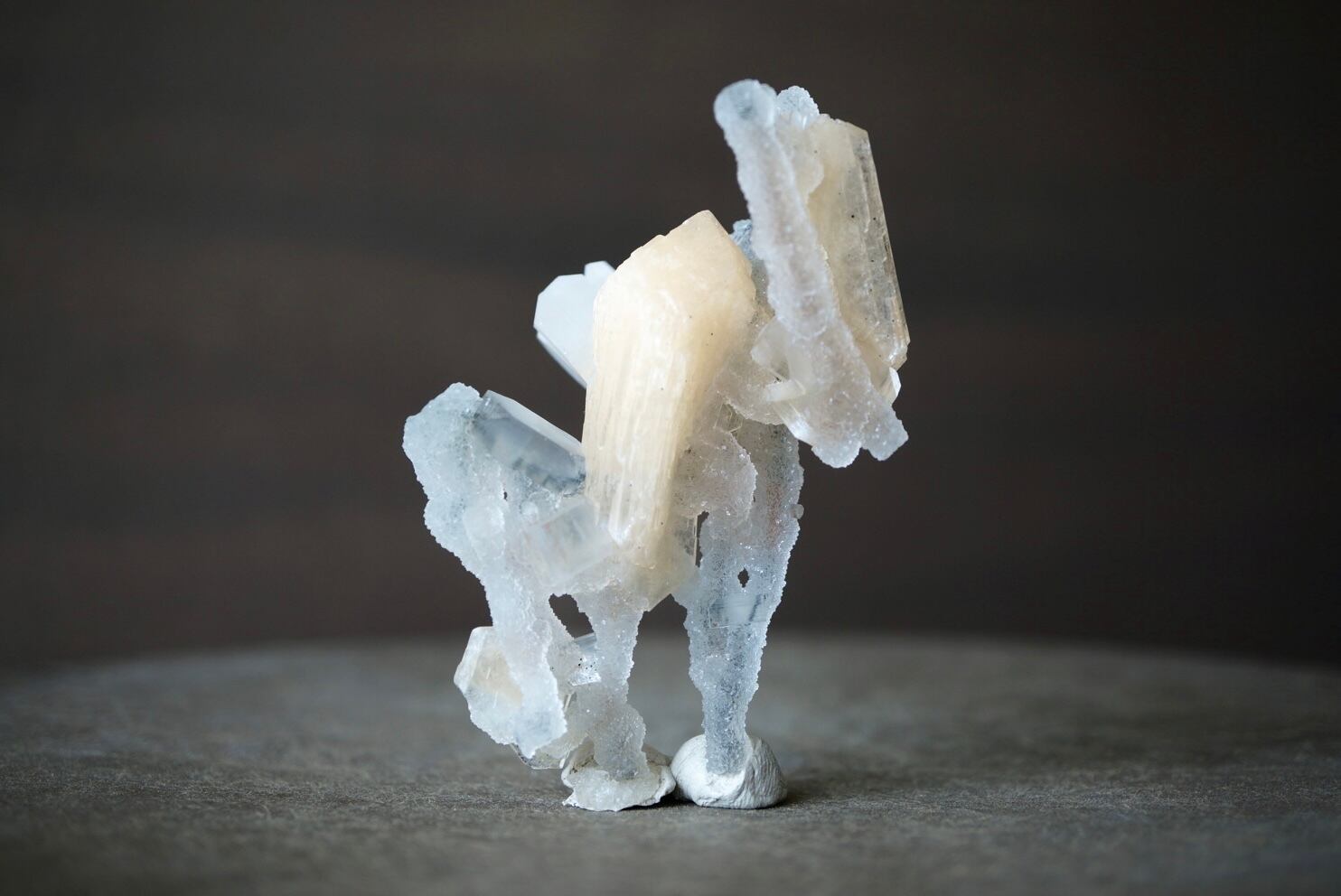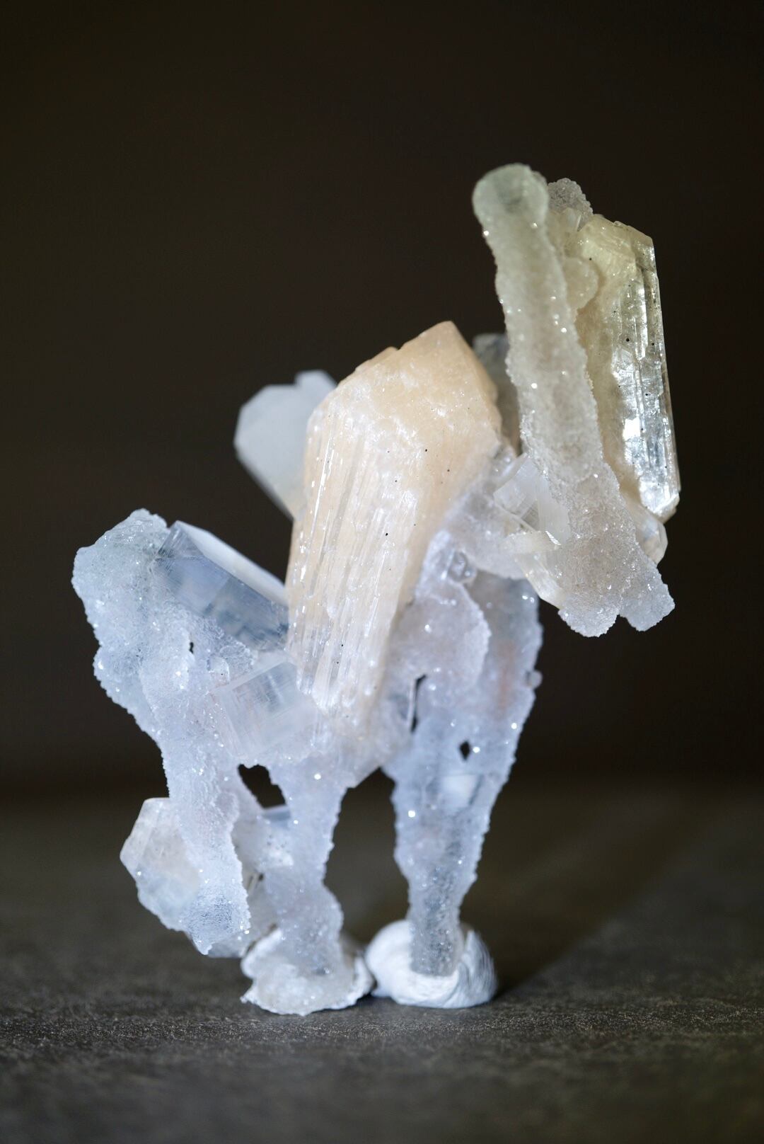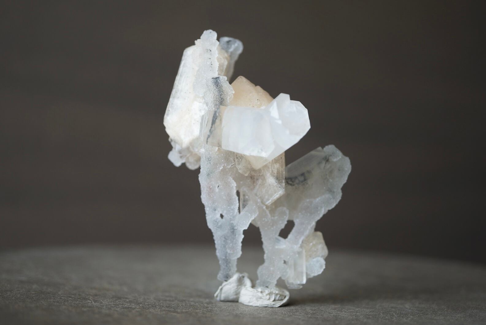 ドゥルージーなカルセドニーを骨組みに、共生するアポフィライトとスティルバイトがユニークな形を構成しています。