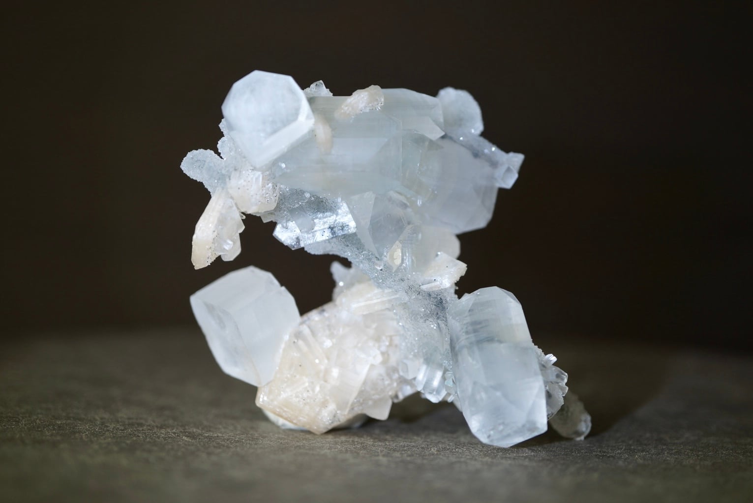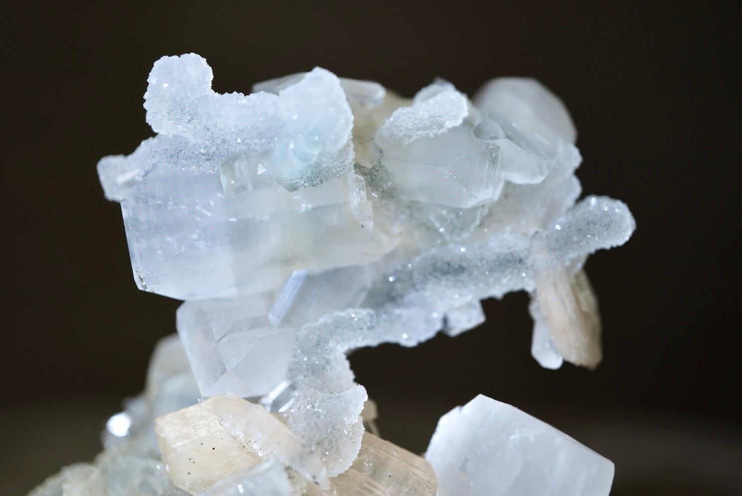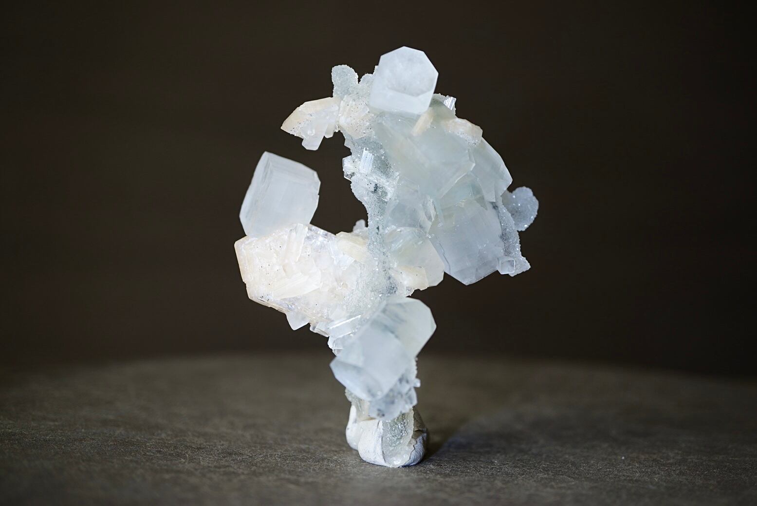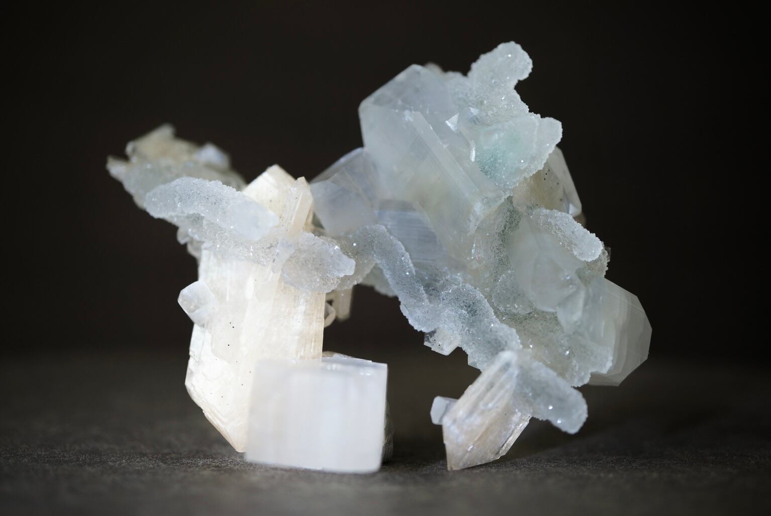 ドゥルージーなカルセドニーを骨組みに、共生するアポフィライトとスティルバイトがユニークな形を構成しています。