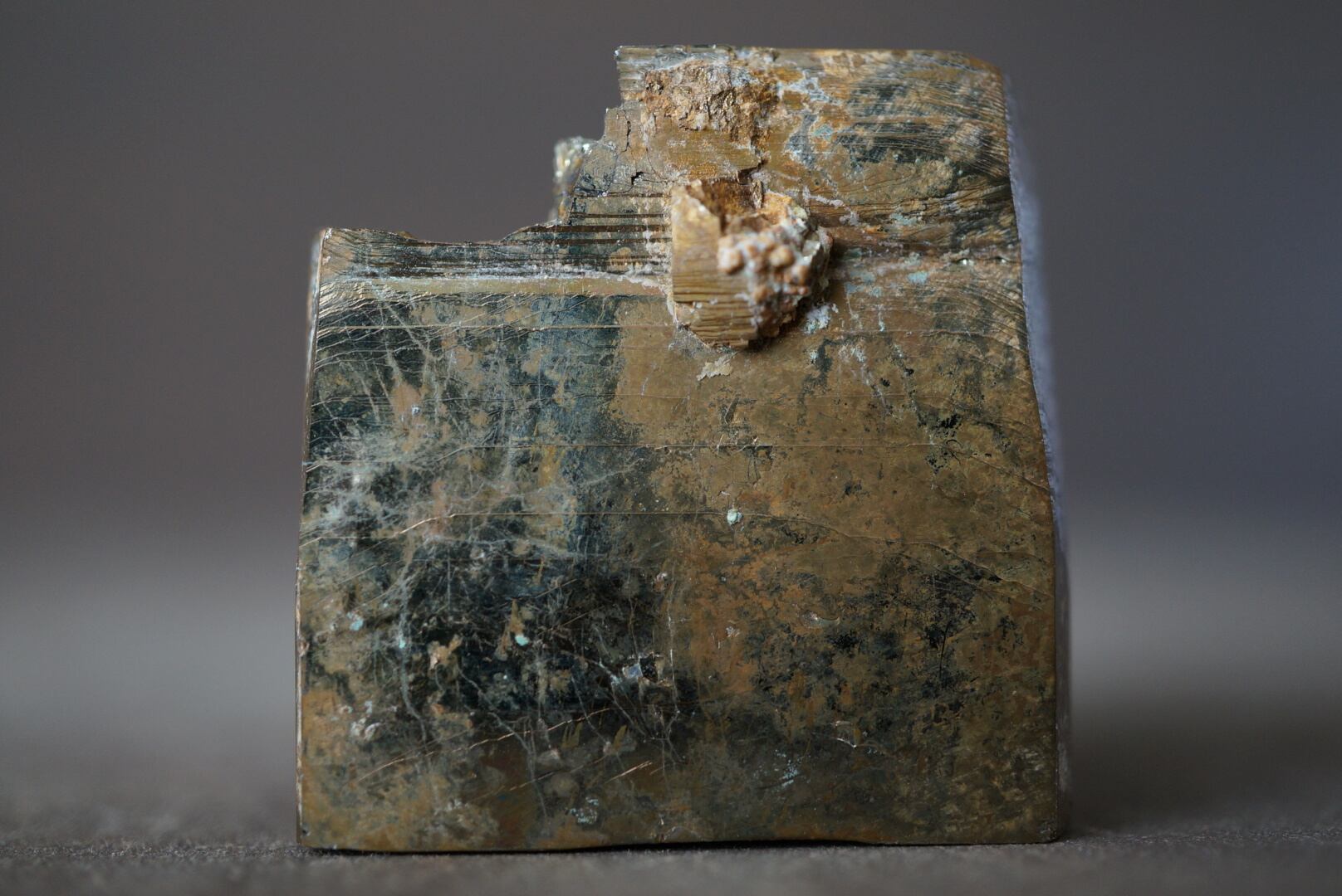 真鍮色のキューブに幾何学的な条線が浮かんでいます。