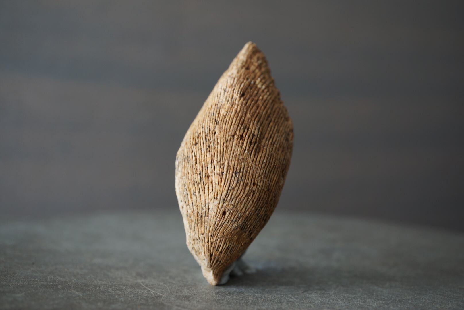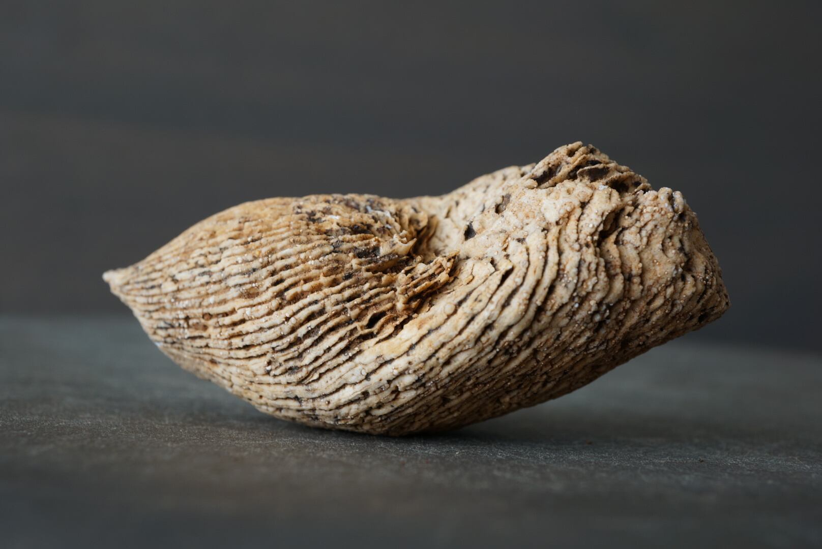 本種の化石のほとんどは角のような口を開けた状態で見つかりますが、本石はアーモンドのようなユニークな形状で保存されています。