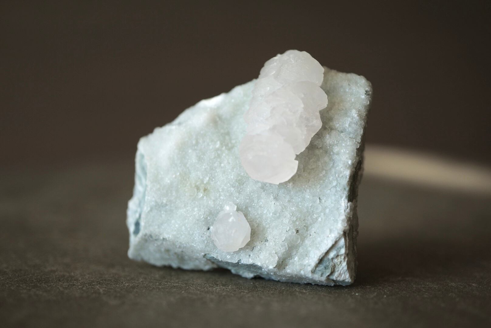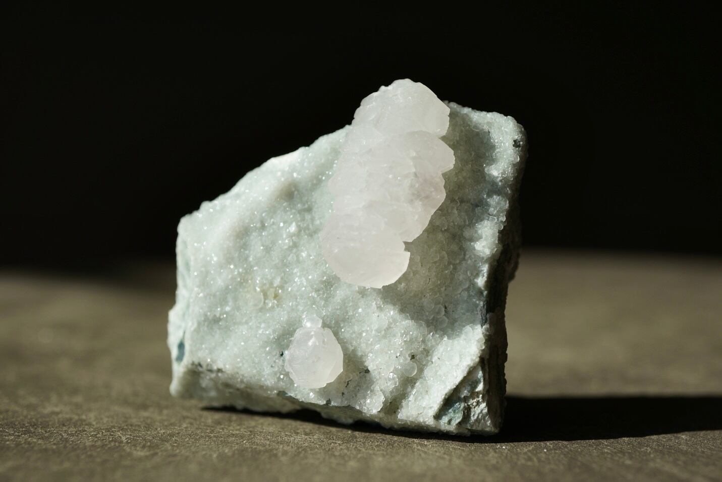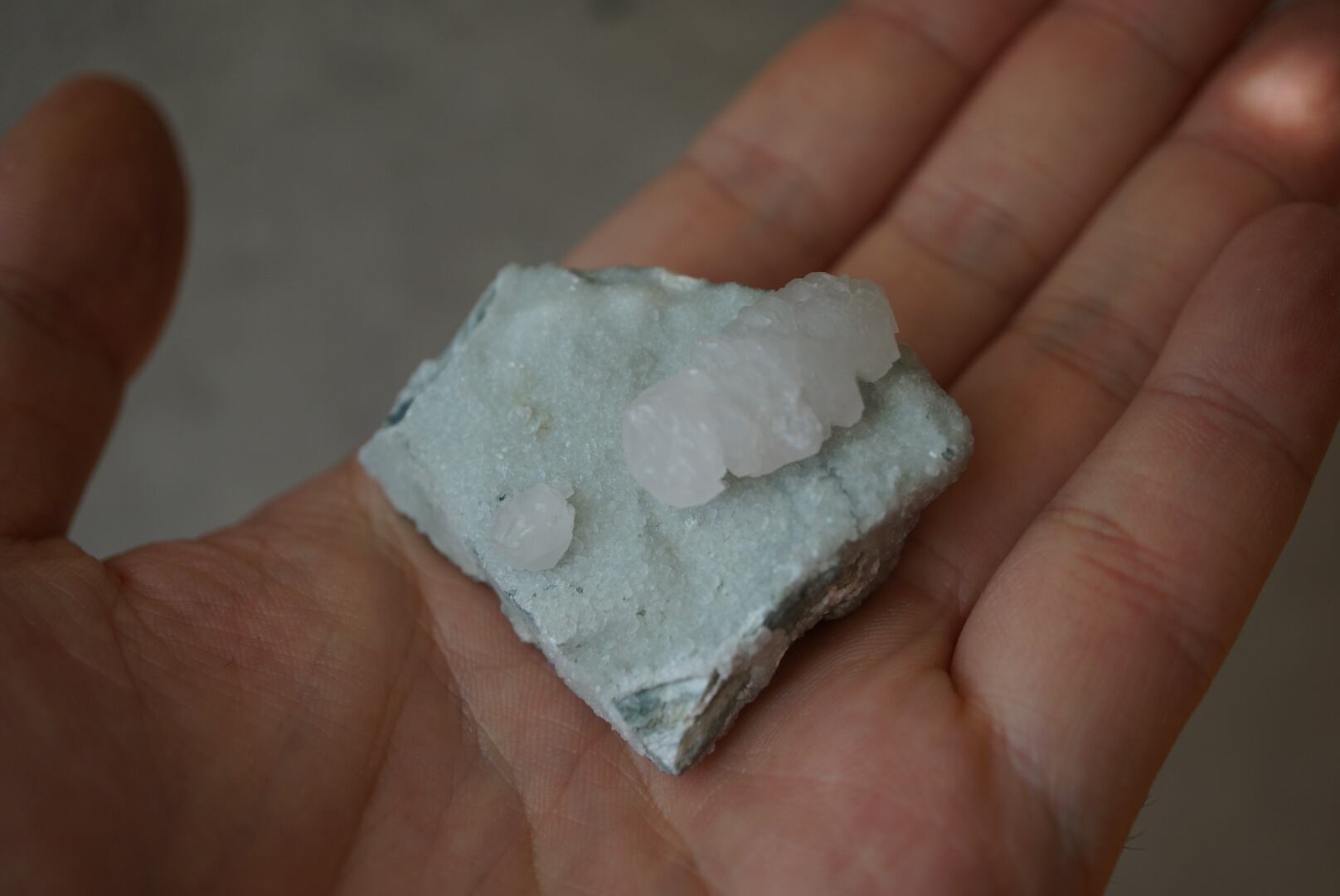 ドゥルージーな淡い水色の母岩に可愛らしいカルサイトが共生しています。