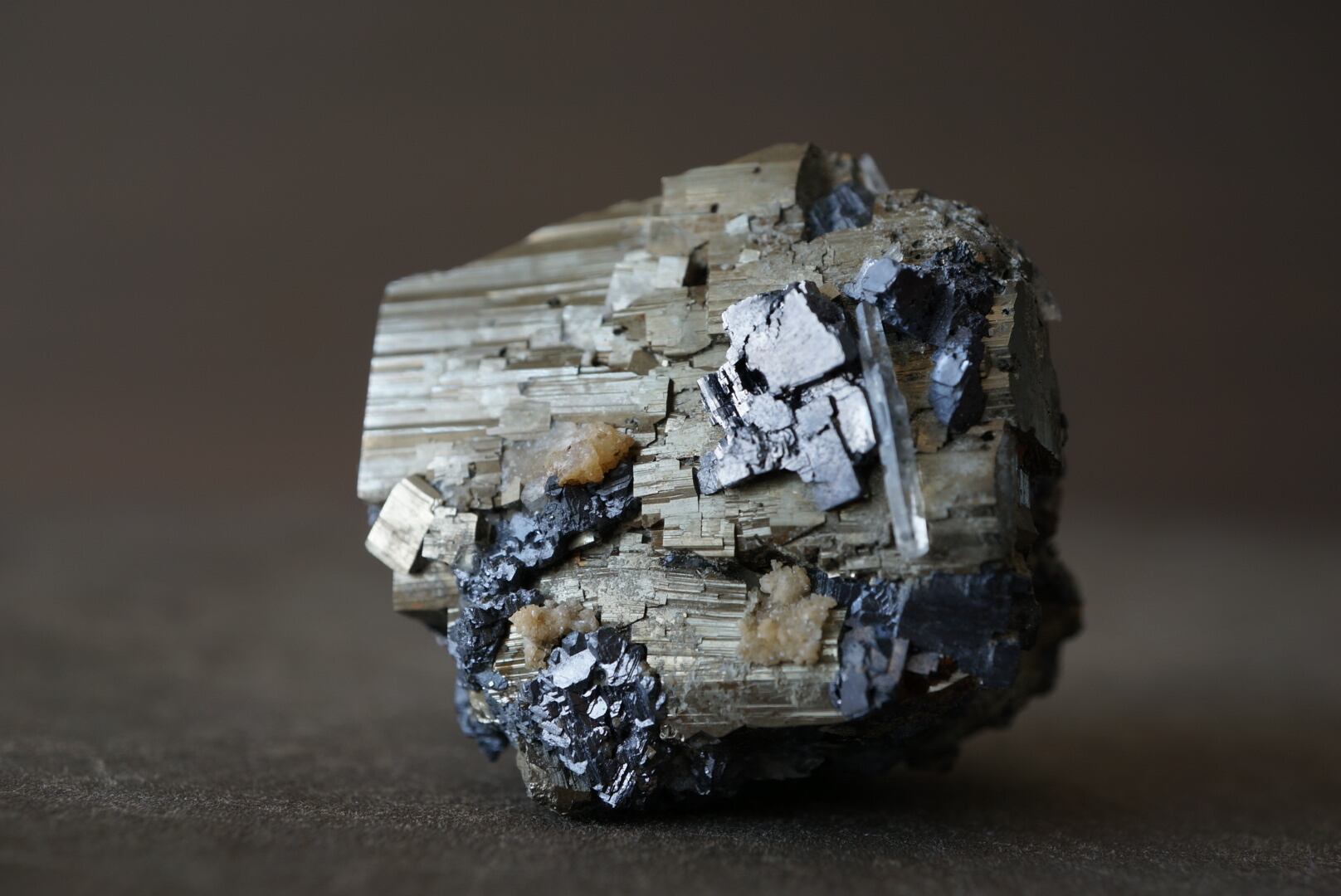 金色のパイライトと鉛色のガレナの表面にメカニカルな条線が浮かんでいます。