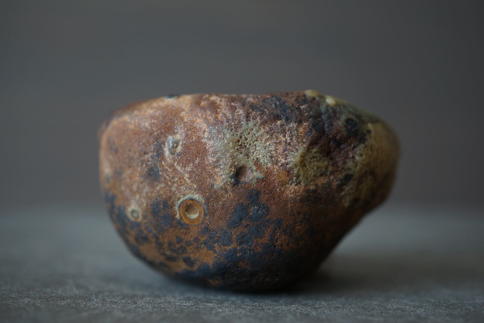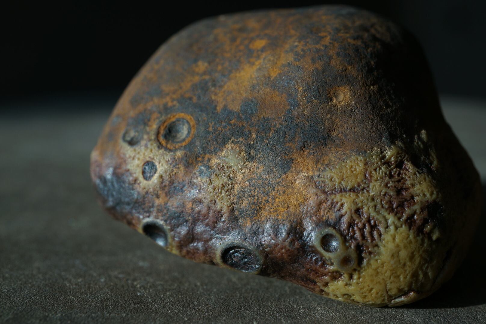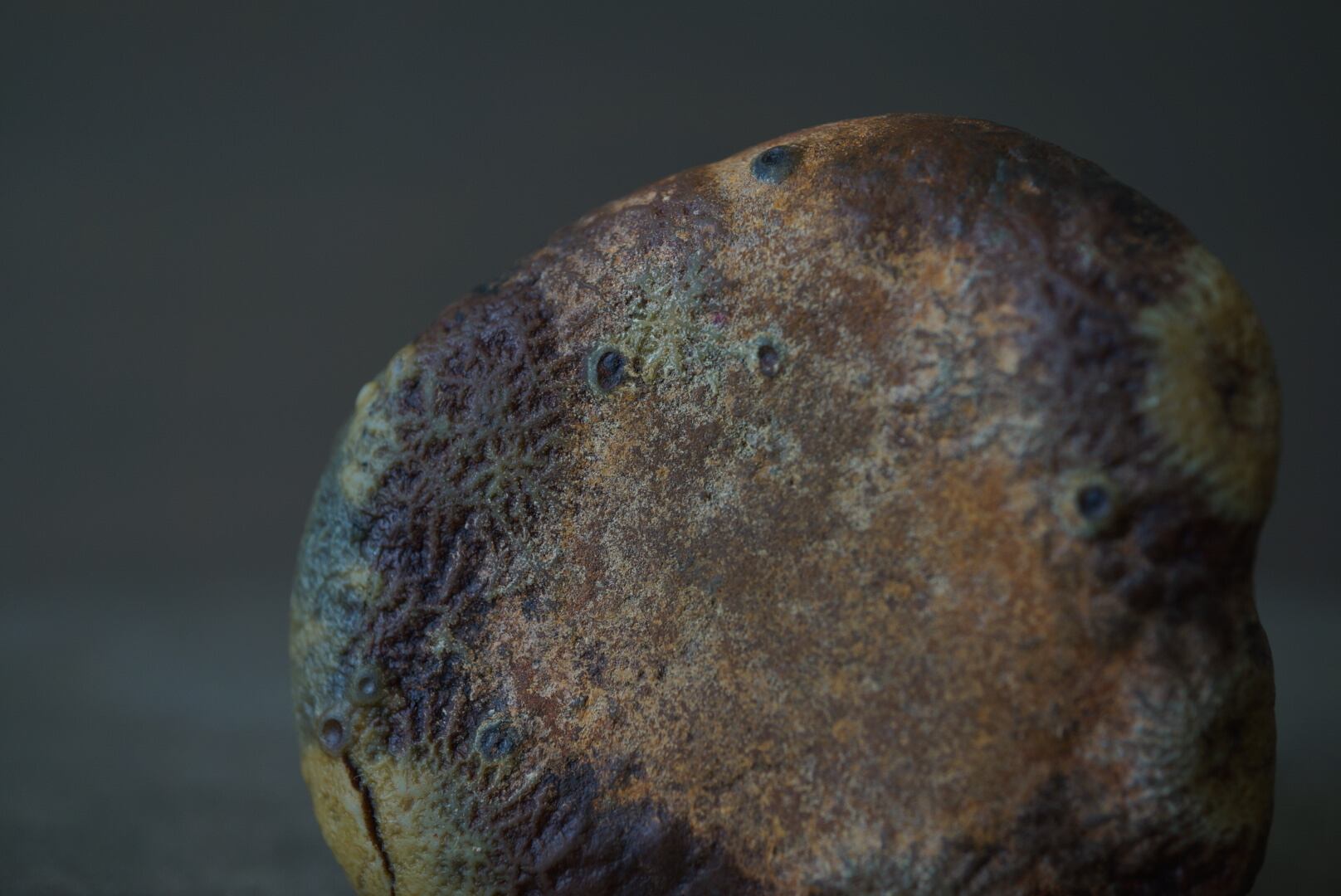 陶胎のうえに釉薬が溶けのびたような色の滲みが広がり、菌糸のように分岐した繊細な構造や、クレーターのような孔が点在しています。