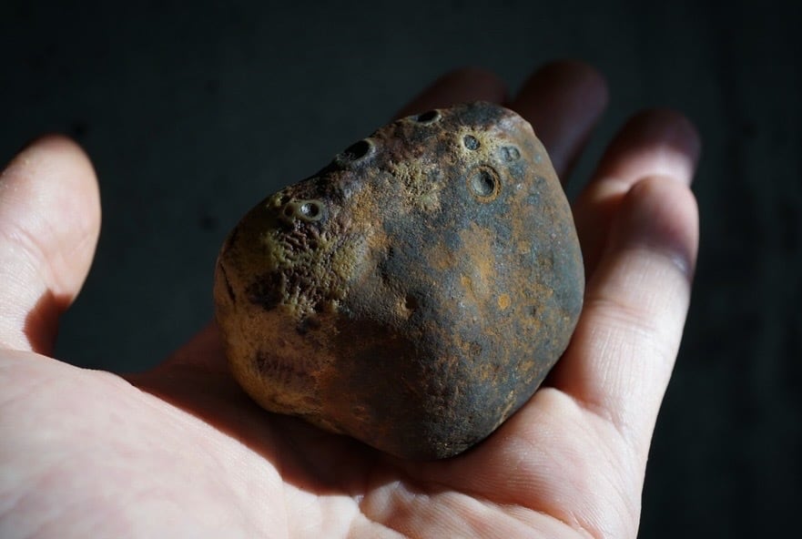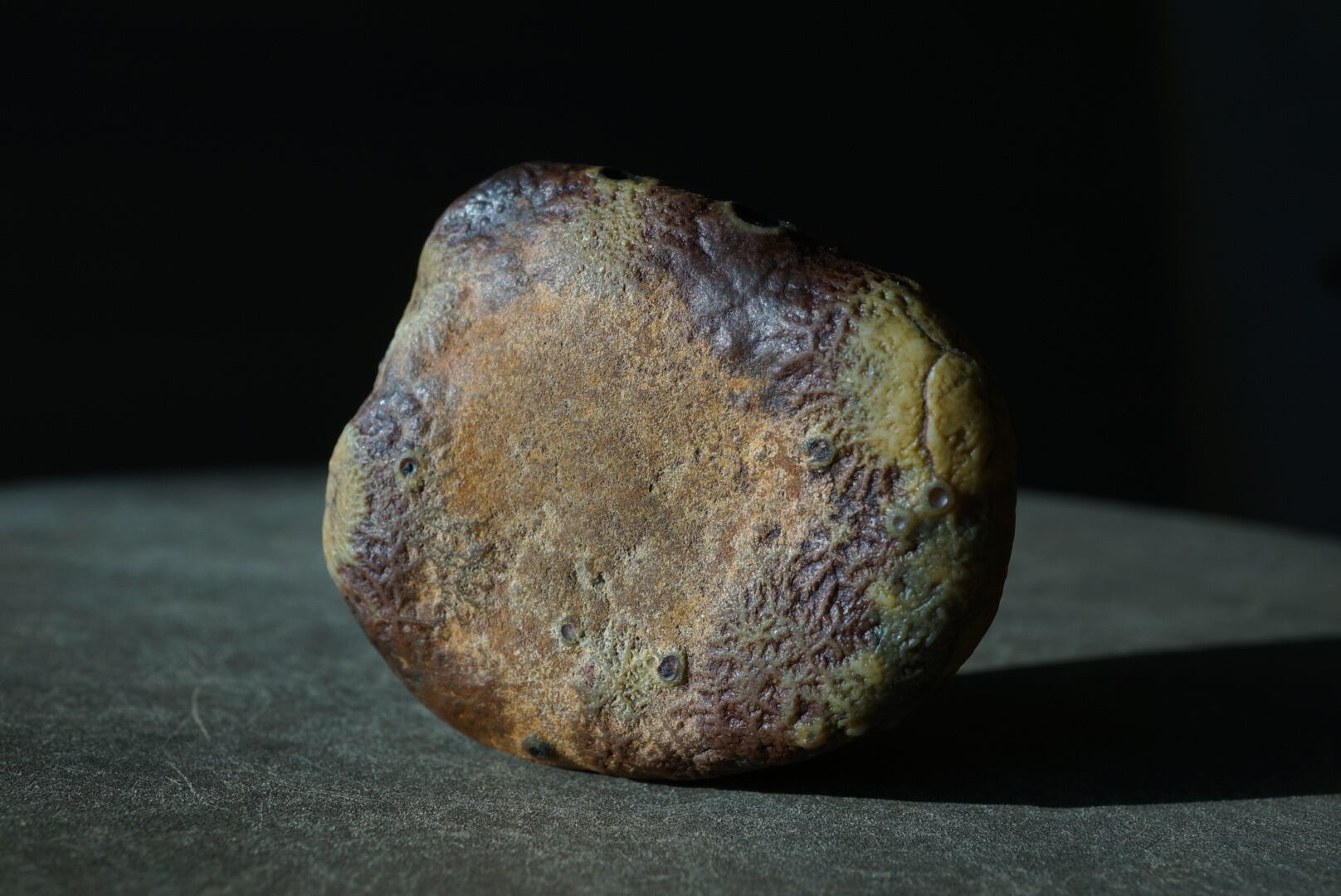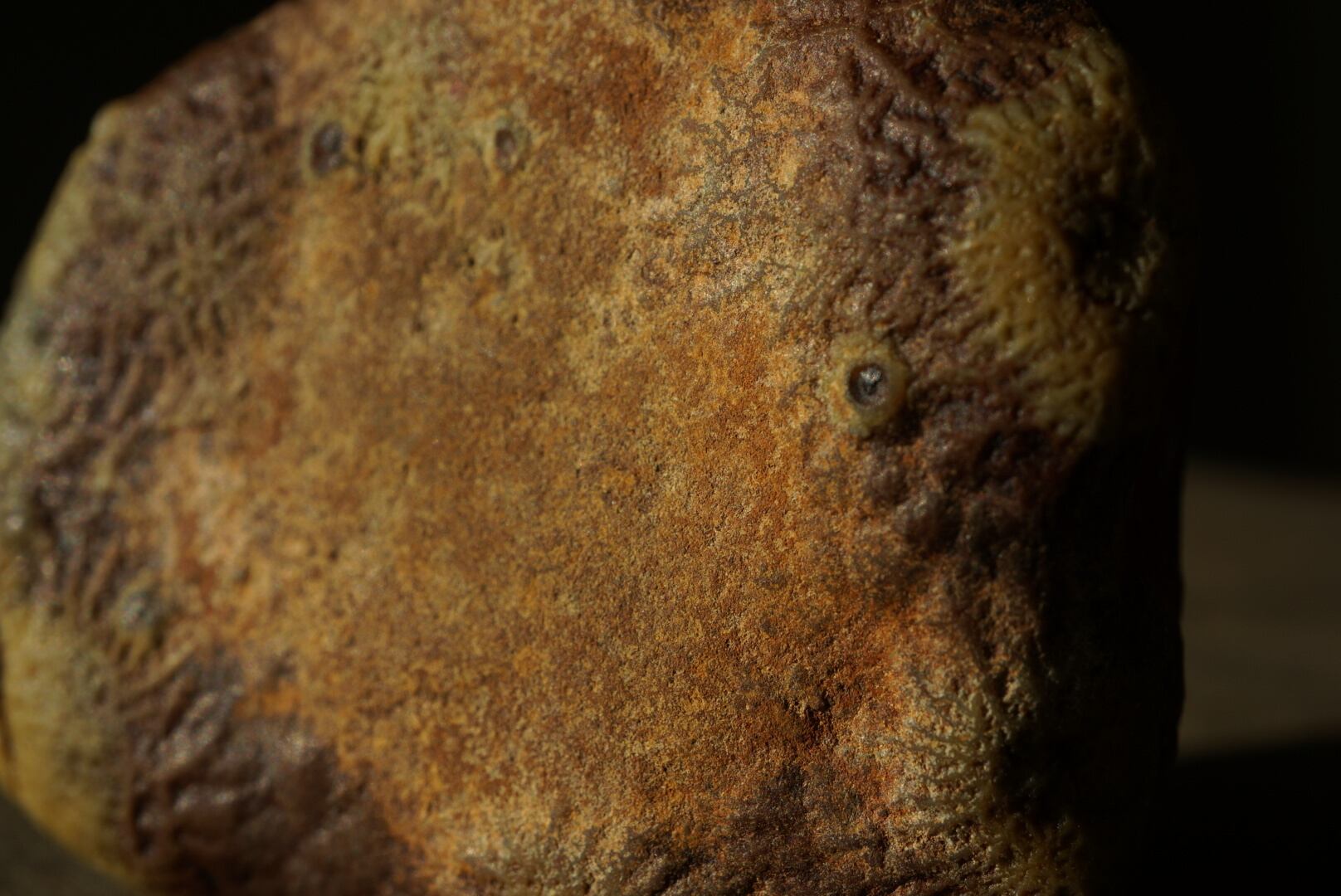 陶胎のうえに釉薬が溶けのびたような色の滲みが広がり、菌糸のように分岐した繊細な構造や、クレーターのような孔が点在しています。
