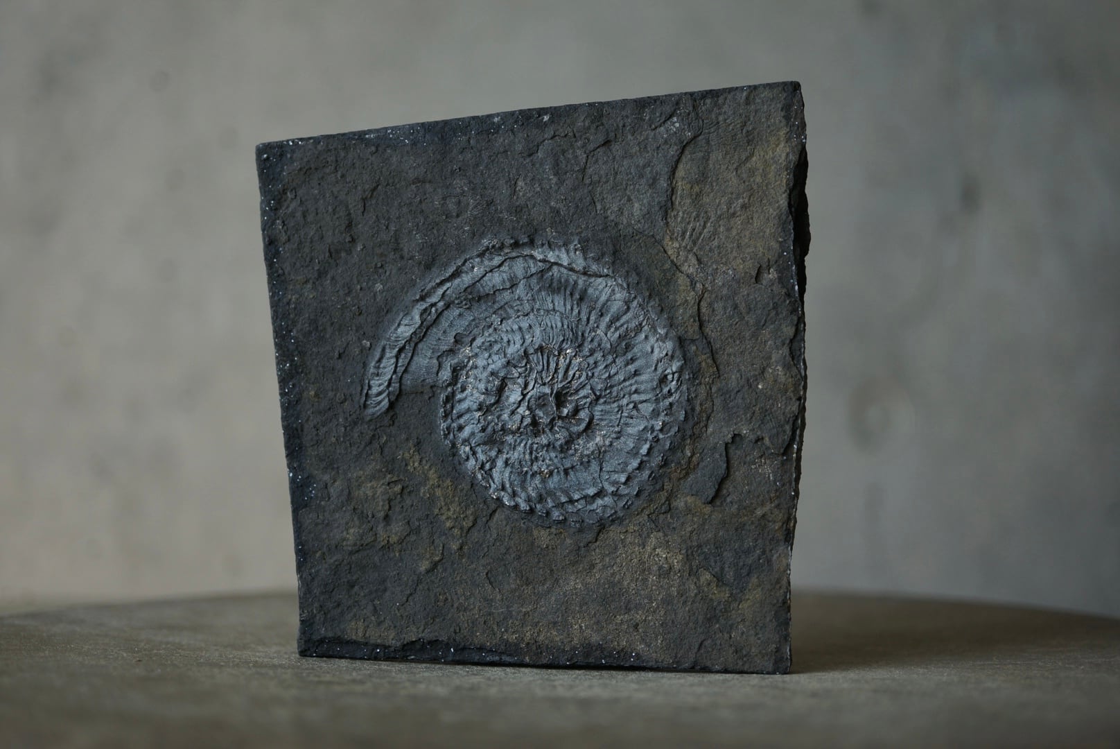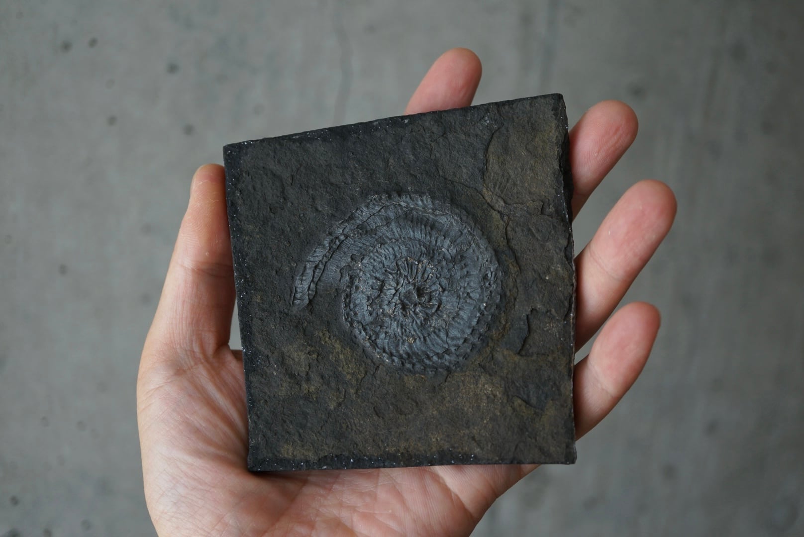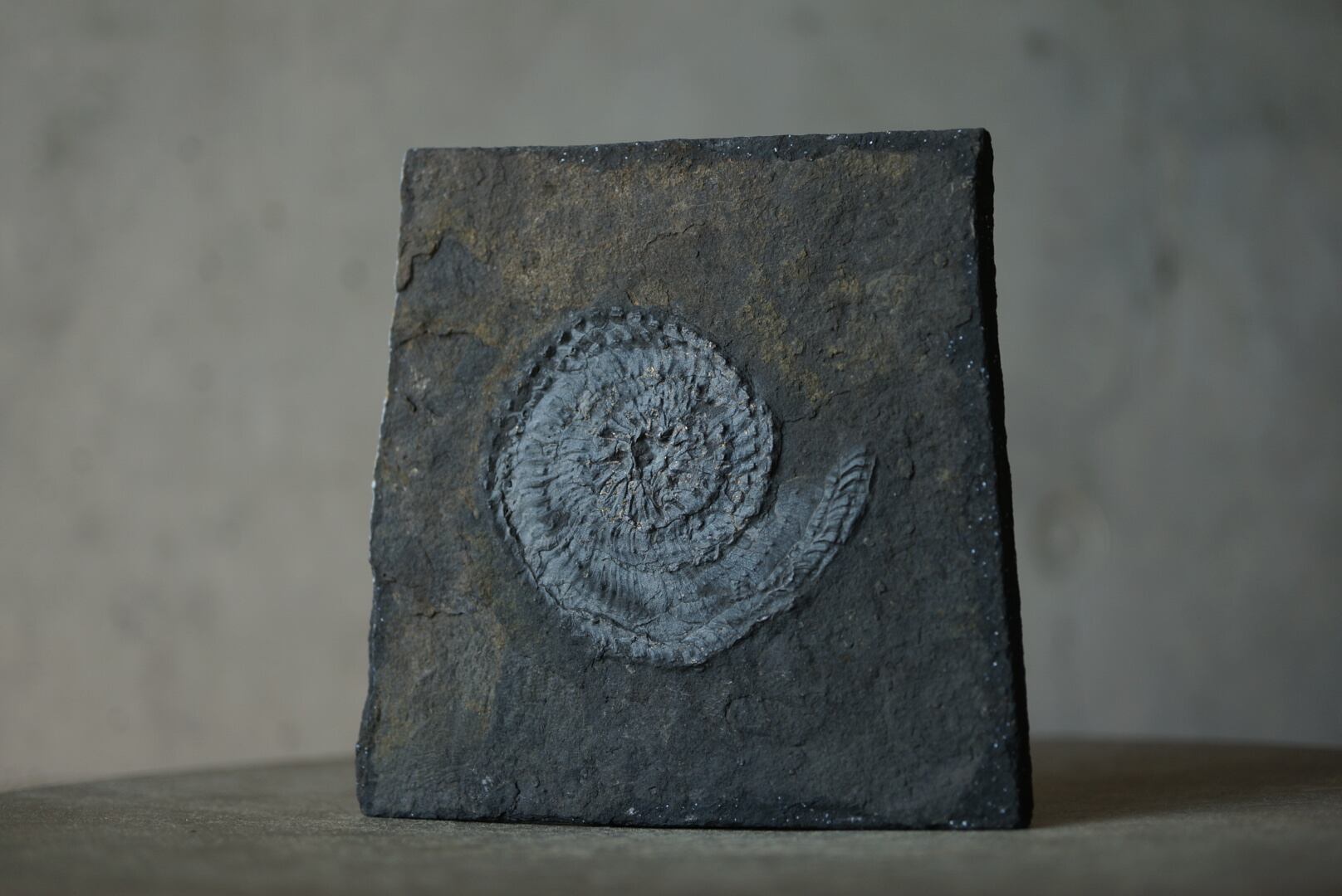 墨色の母岩の風合いも素晴らしく、そこに浮かび上がる螺旋は、拓本に写し取られた文様のように静かな風情を湛えています。