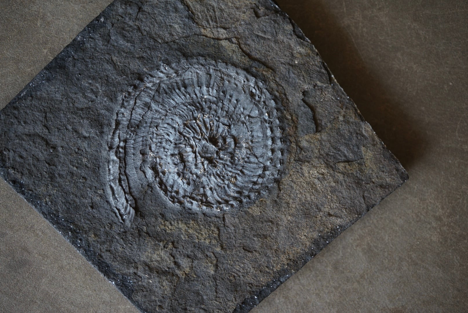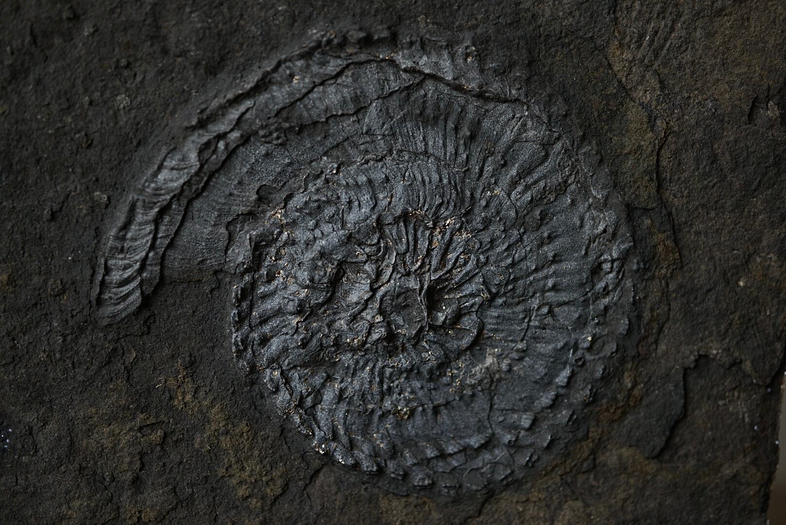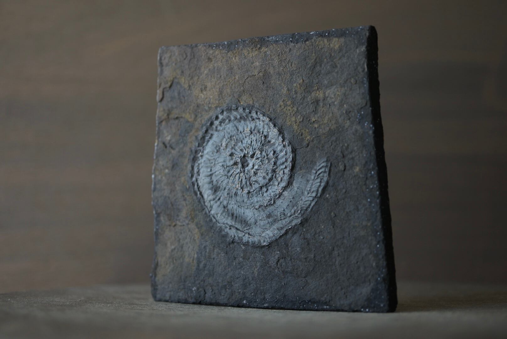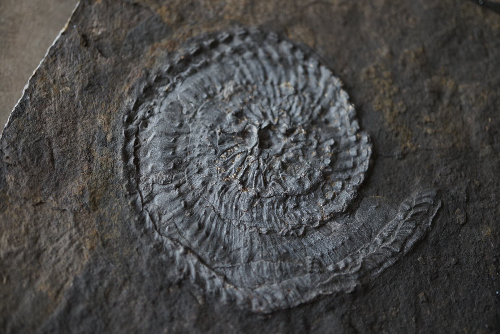 墨色の母岩の風合いも素晴らしく、そこに浮かび上がる螺旋は、拓本に写し取られた文様のように静かな風情を湛えています。