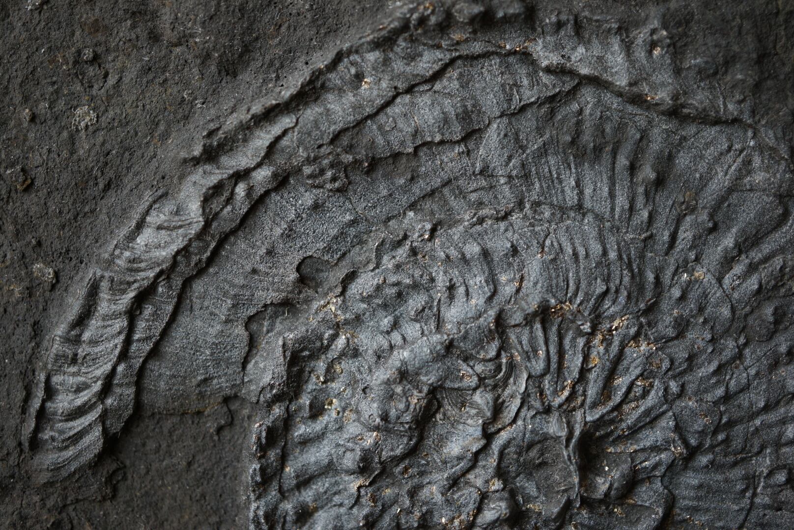 縫合線もジュラ紀~白亜紀の種と比べると原初的な印象で、本石には節足動物がとぐろを巻いているようにも見える緻密な構造が残されています。