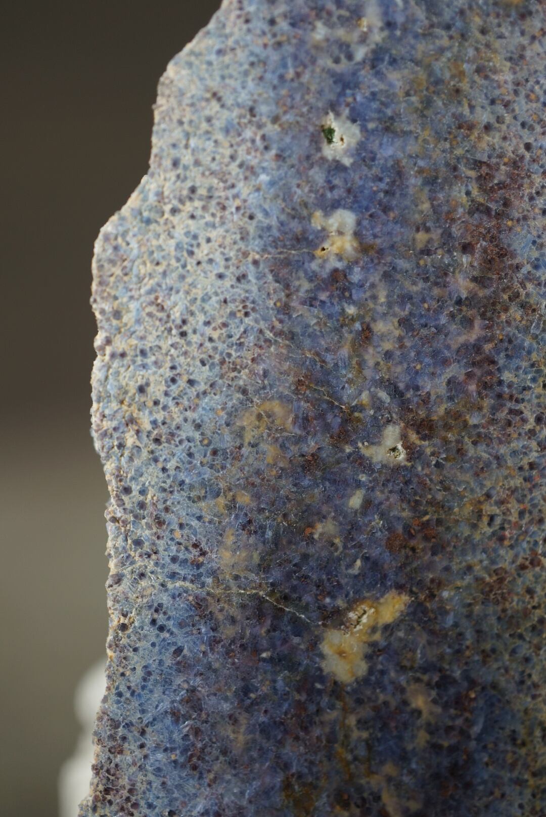 一見してくすみがかった青色に見えるものの、近づいてよく観察すると、青、紫、白の微細な色味が点描画のように散りばめられており、層状の質感と絵画的な表情を併せ持っています。