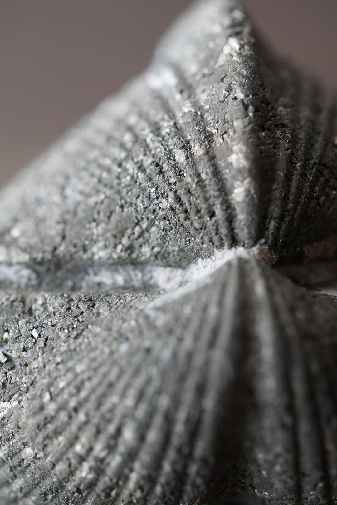 4億年前の生物が金属と化し、銀箔のような細やかな光沢と共にその美しい造形を保っています。