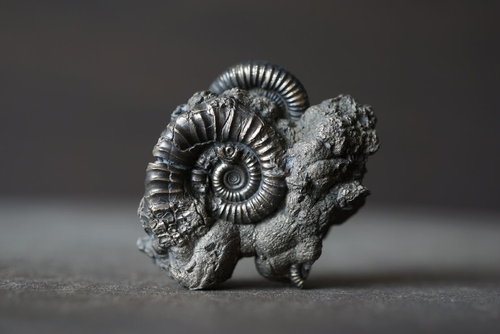 ジュラ紀(約2億130万年前から約1億4550万年前)の海に生息していたアンモナイトの遺骸が、バクテリアによる分解と鉄イオン/硫化物の反応により、黄鉄鉱によって置換され、金属光沢をもつ硬質な物質へと変化したものです。