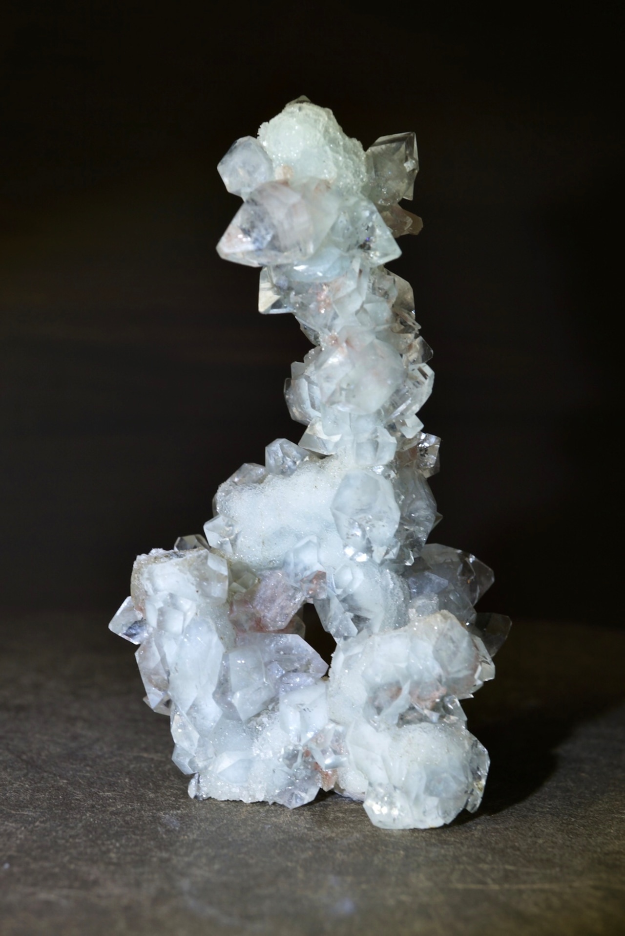 ドゥルージーなカルセドニーを骨組みに、共生するアポフィライトとスティルバイトがユニークな形を構成しています。