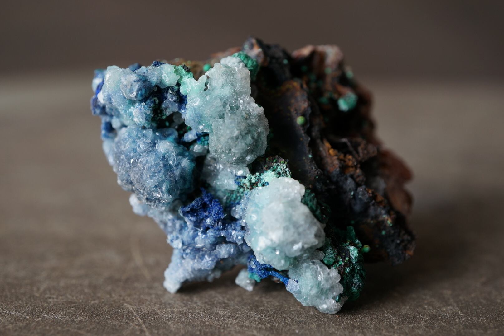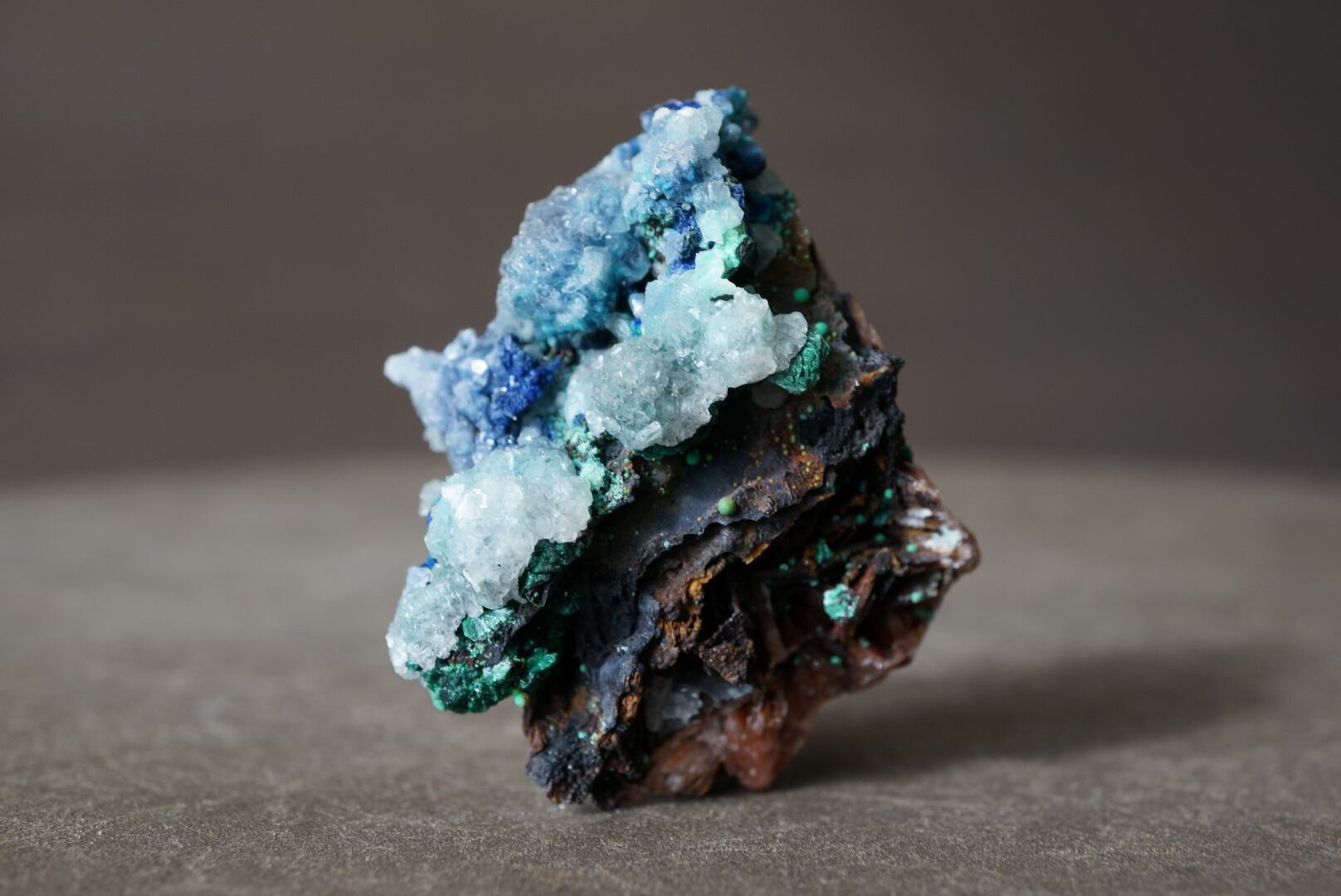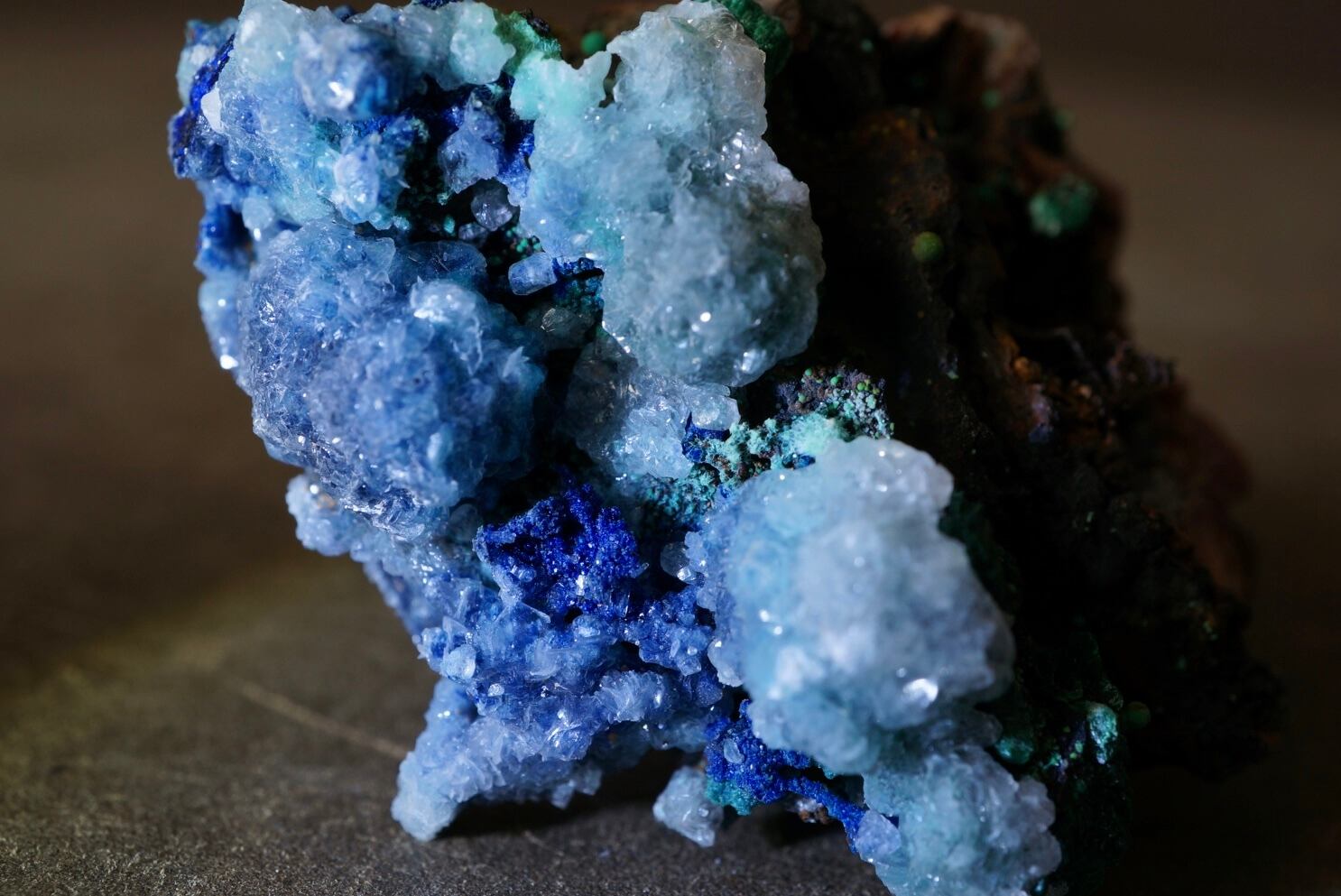 アズライト/マラカイトの表面には透明のクォーツがコーティングされており、下地の寒色を美しく透かしています。
