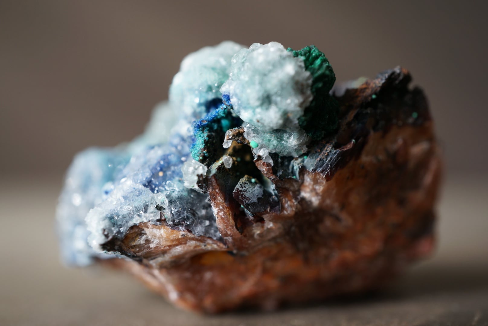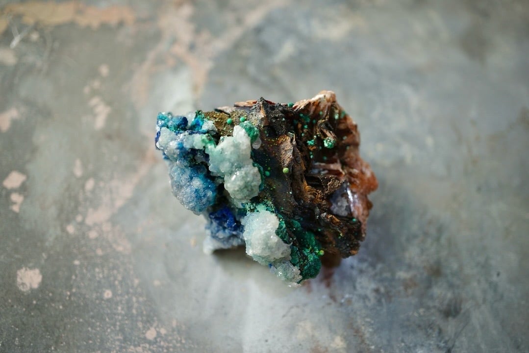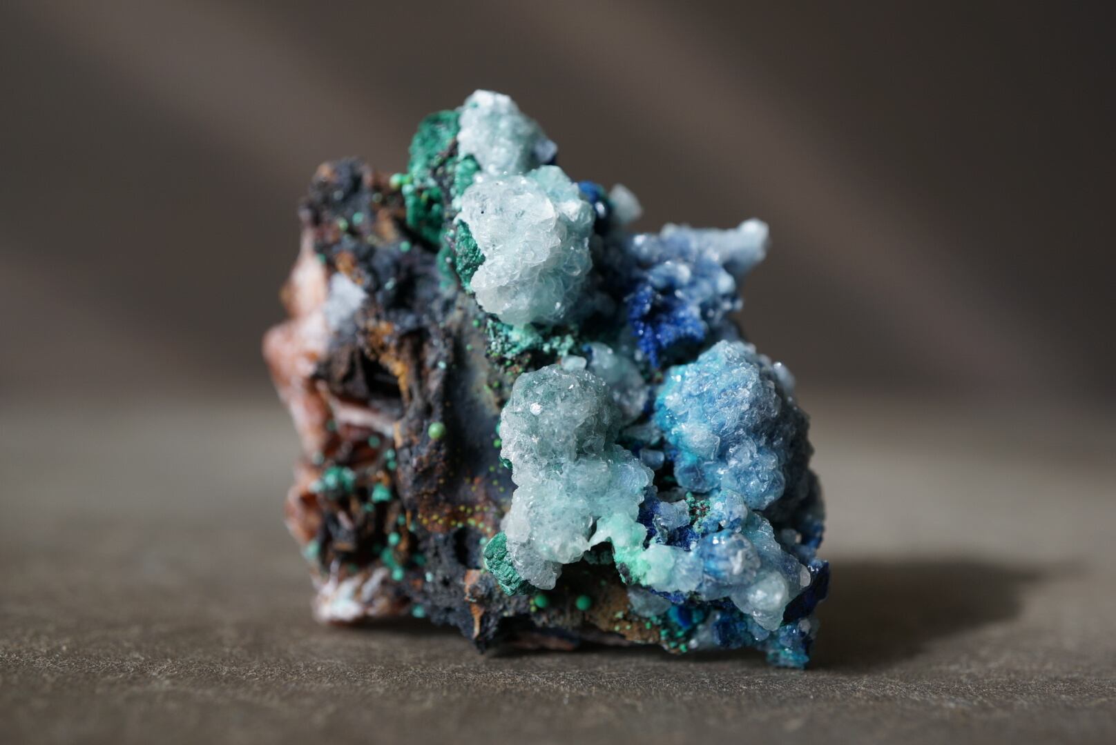アズライト/マラカイトの表面には透明のクォーツがコーティングされており、下地の寒色を美しく透かしています。