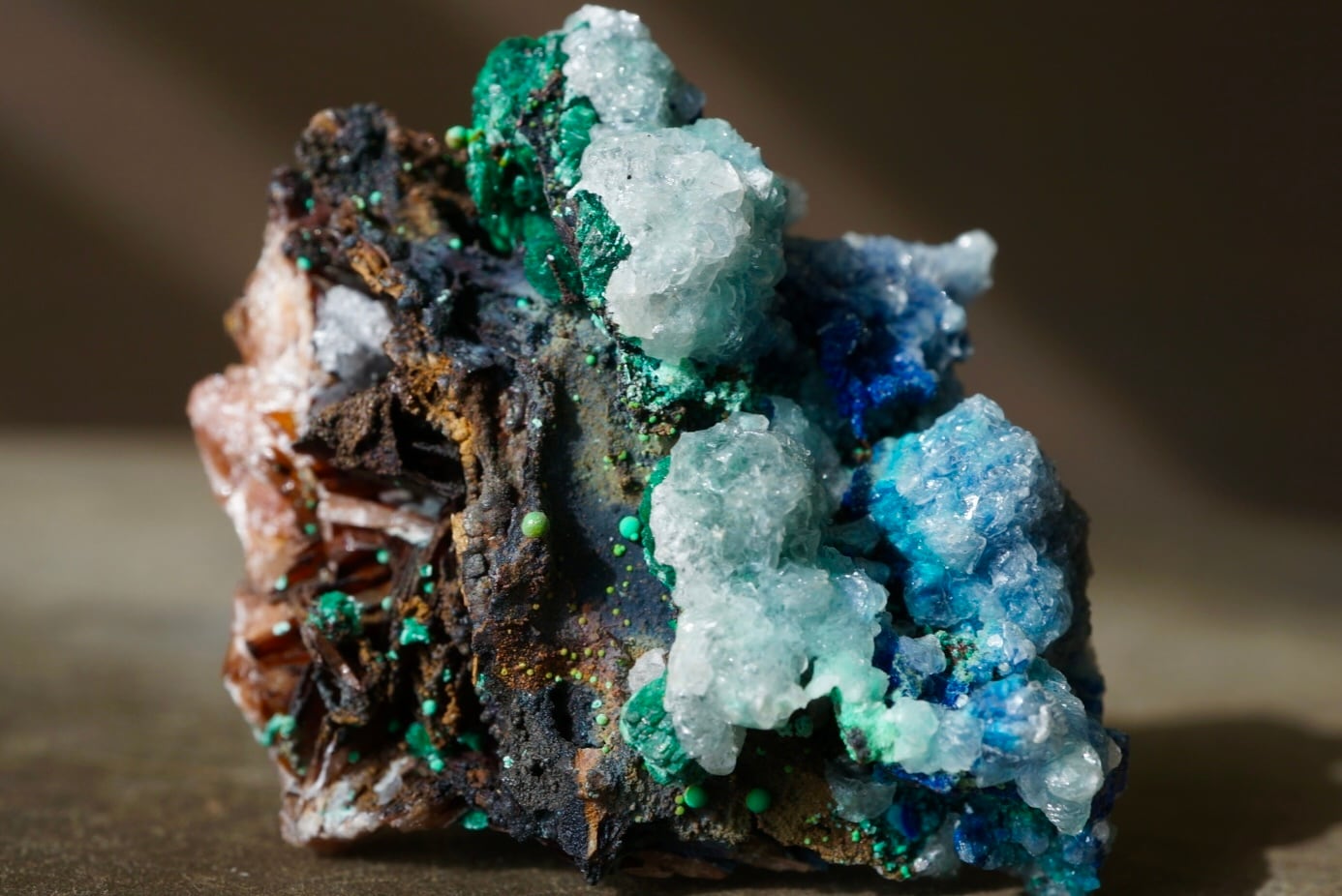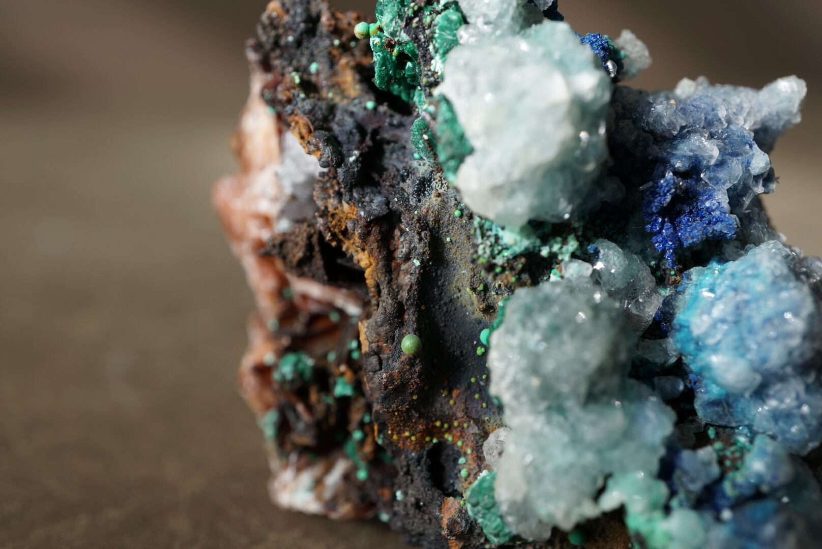 赤みがかったバライトを母岩に青のアズライト、緑のマラカイトが共生しています。