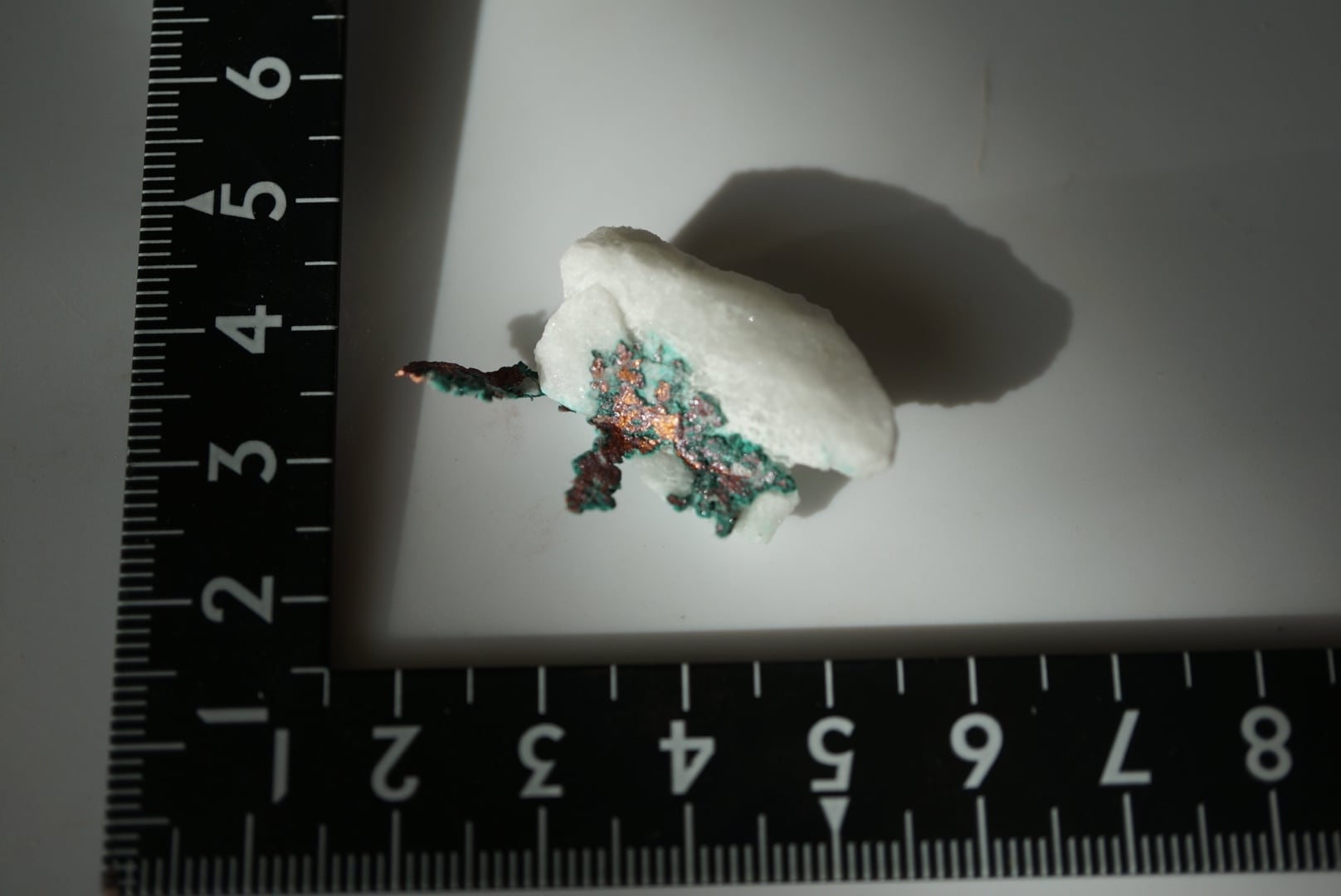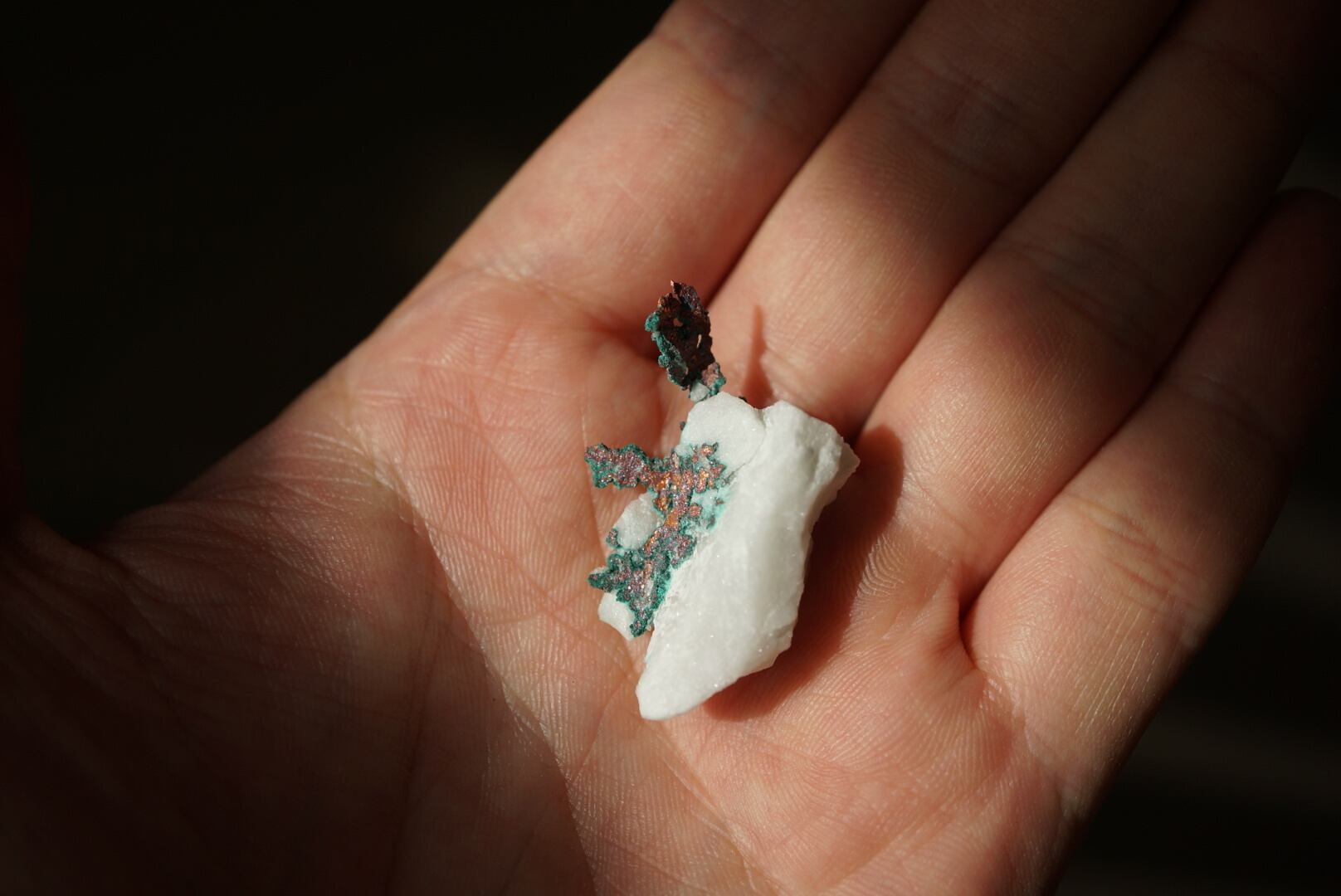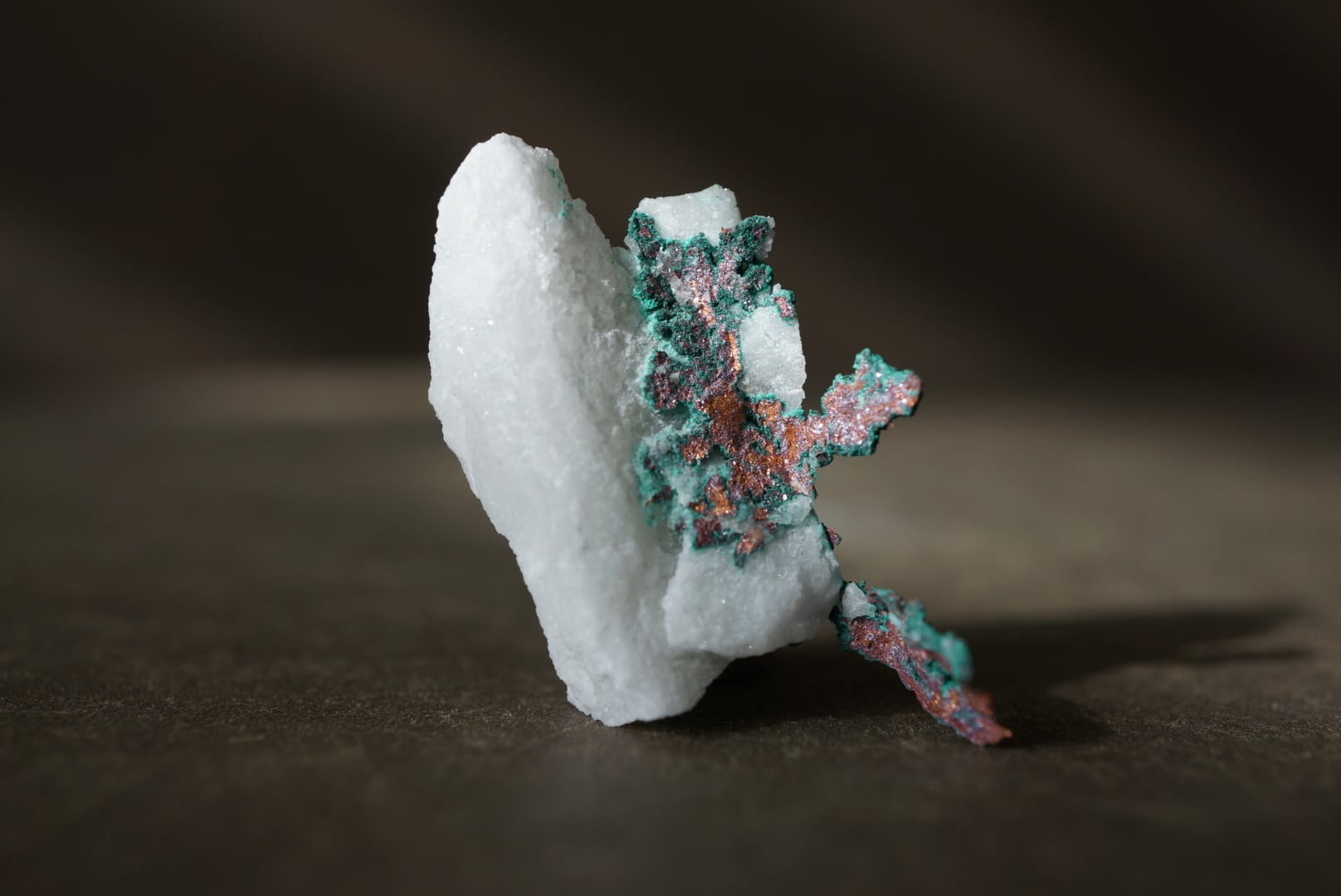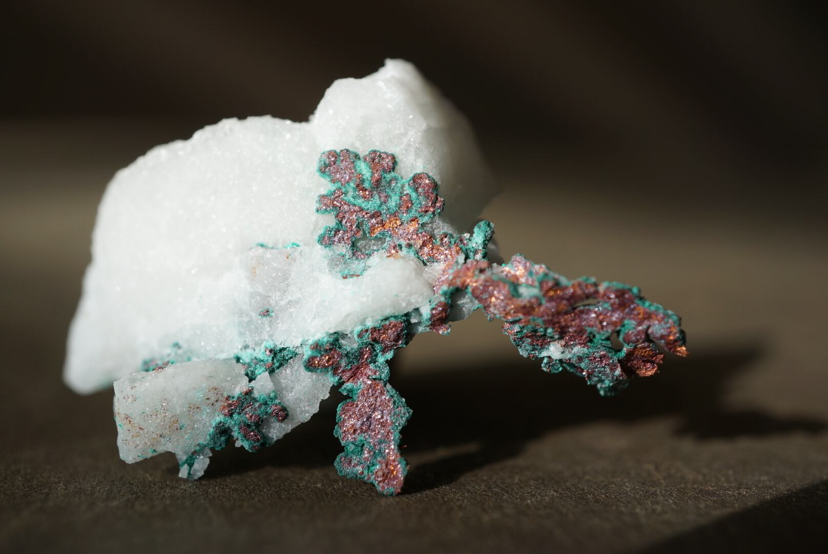 純白のクォーツの母岩から樹枝状の銅がにじみ出るように結晶しており、金属光沢を放つ赤銅色の輝きに加えて、表面には緑青が差し込み、鮮やかなコントラストを描き出しています。
