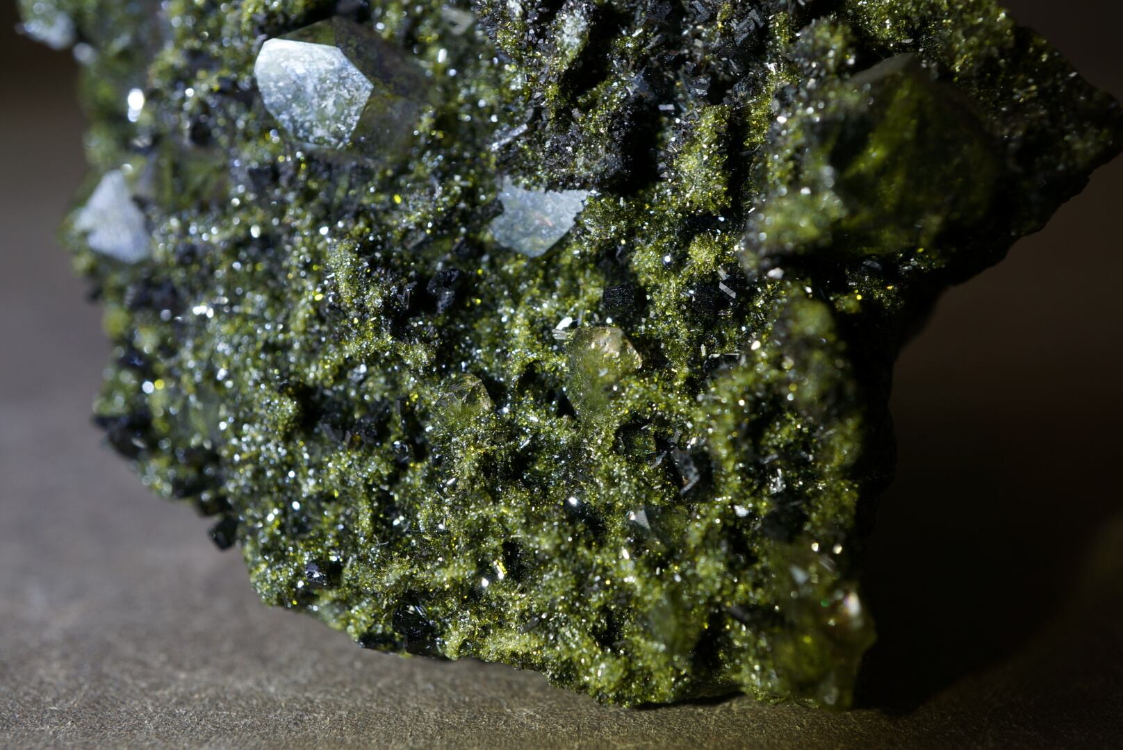 抹茶のような深い緑色のエピドートが微細なクォーツ結晶と混ざり合い、遠目からでも目立つほどのきらびやかな光沢を放ちます。