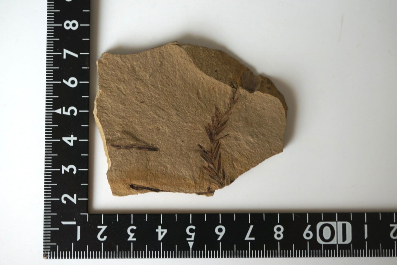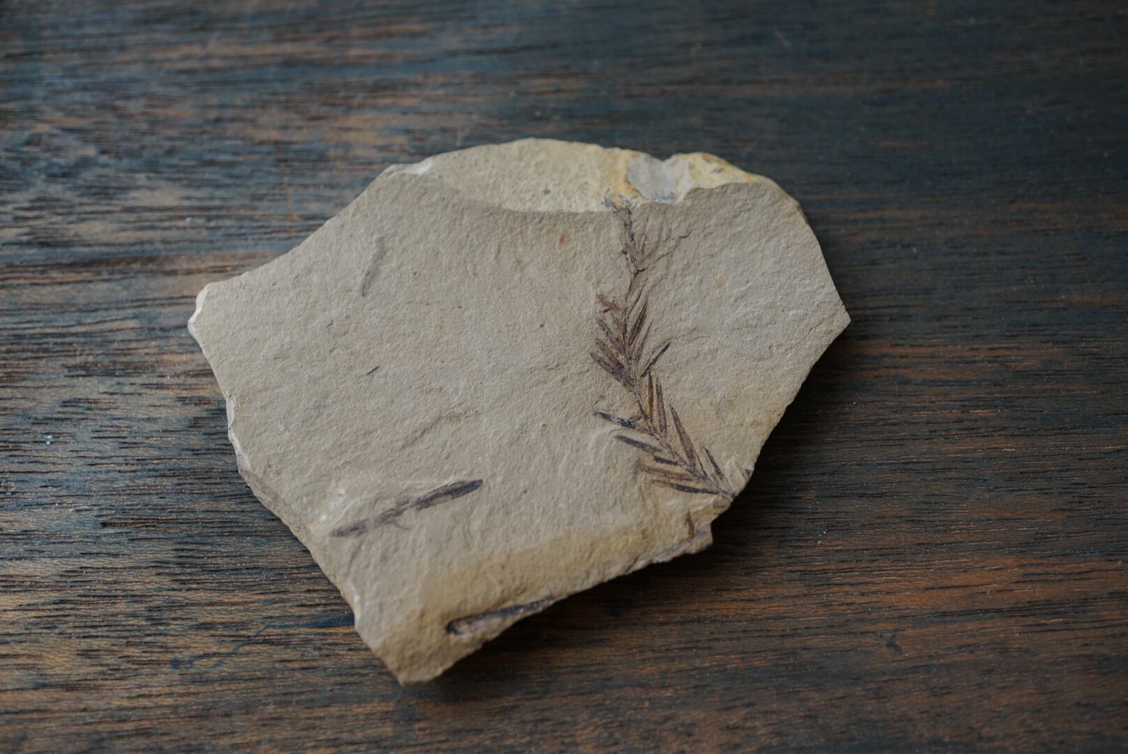 葉形を型押しした陶片のようなモンタナ州産のメタセコイア化石です。