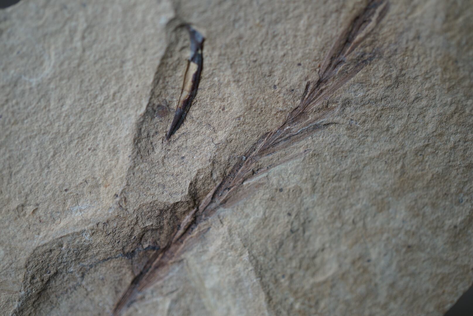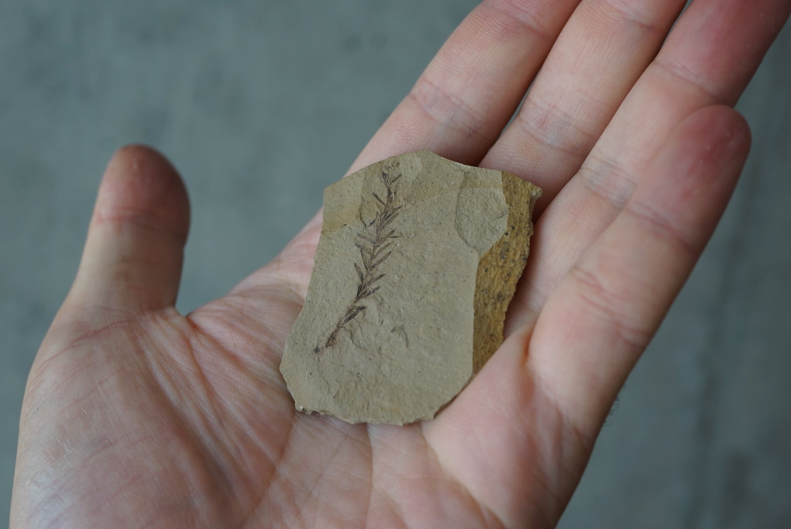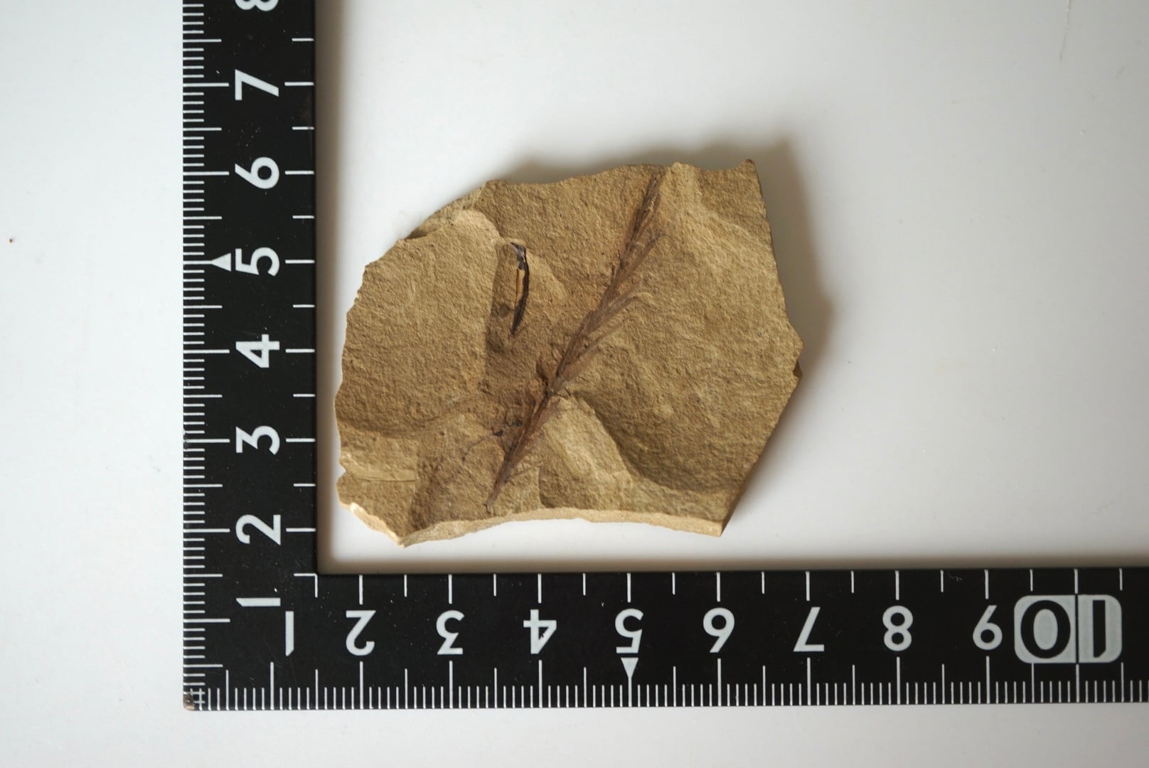 葉形を型押しした陶片のようなモンタナ州産のメタセコイア化石です。