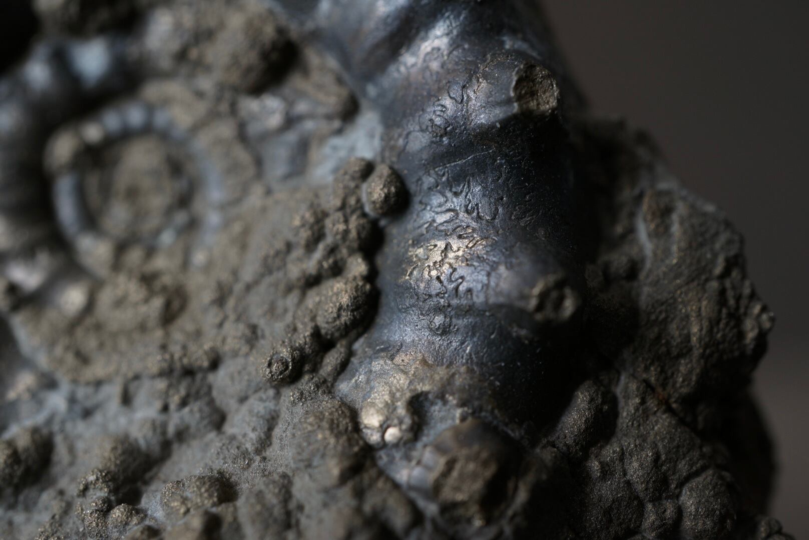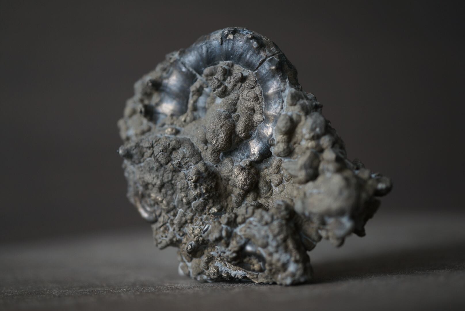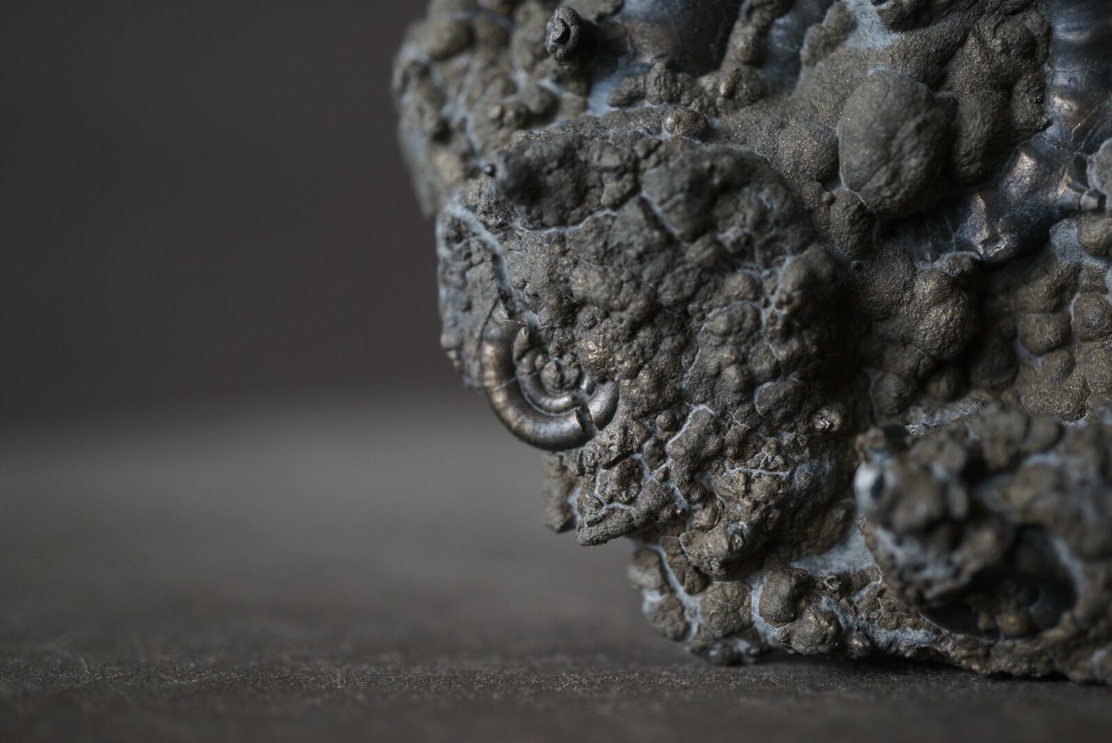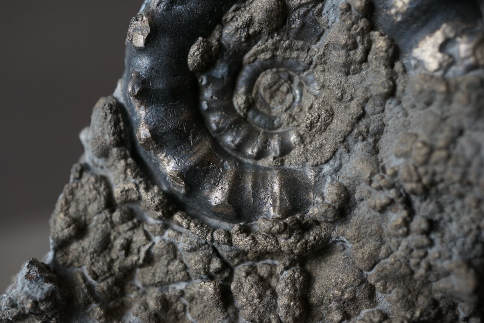 ジュラ紀(約2億130万年前から約1億4550万年前)の海に生息していたアンモナイトの遺骸が、バクテリアによる分解と鉄イオン/硫化物の反応により、黄鉄鉱によって置換され、金属光沢をもつ硬質な物質へと変化したものです。