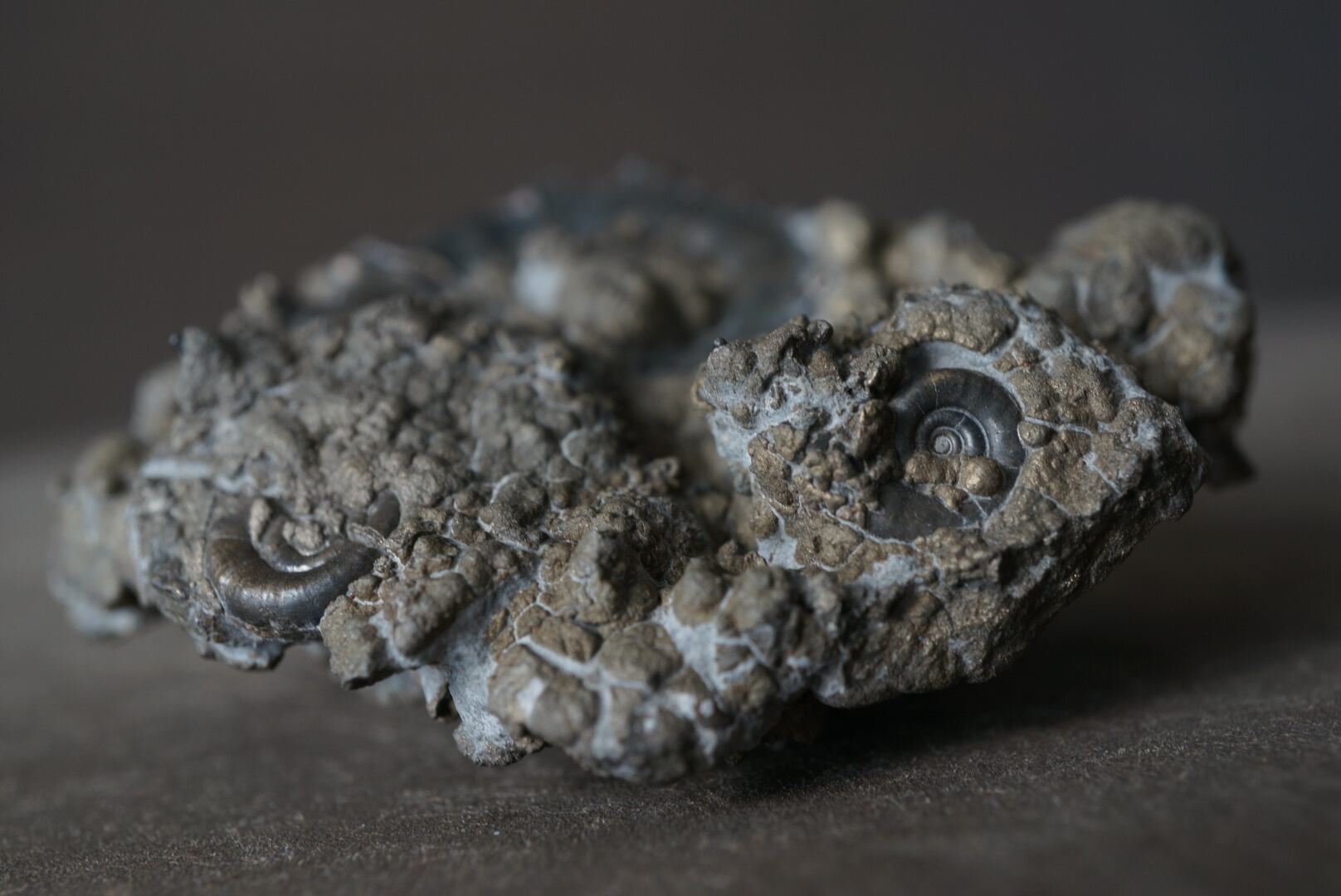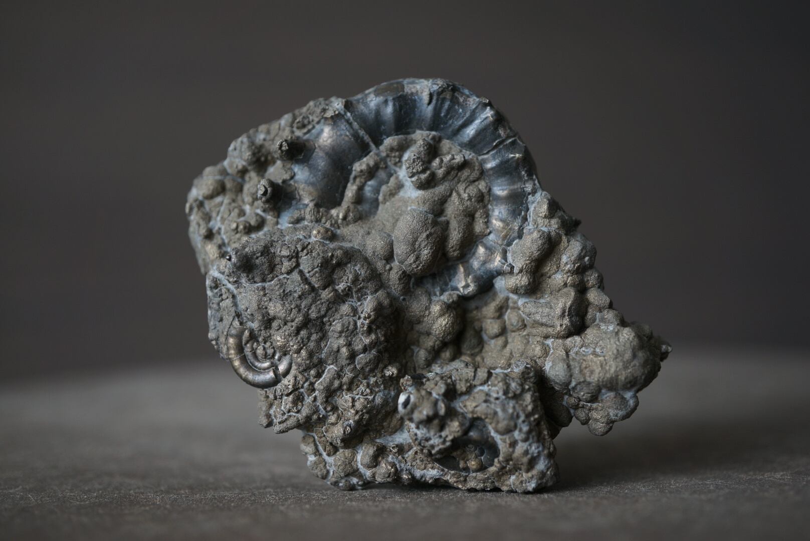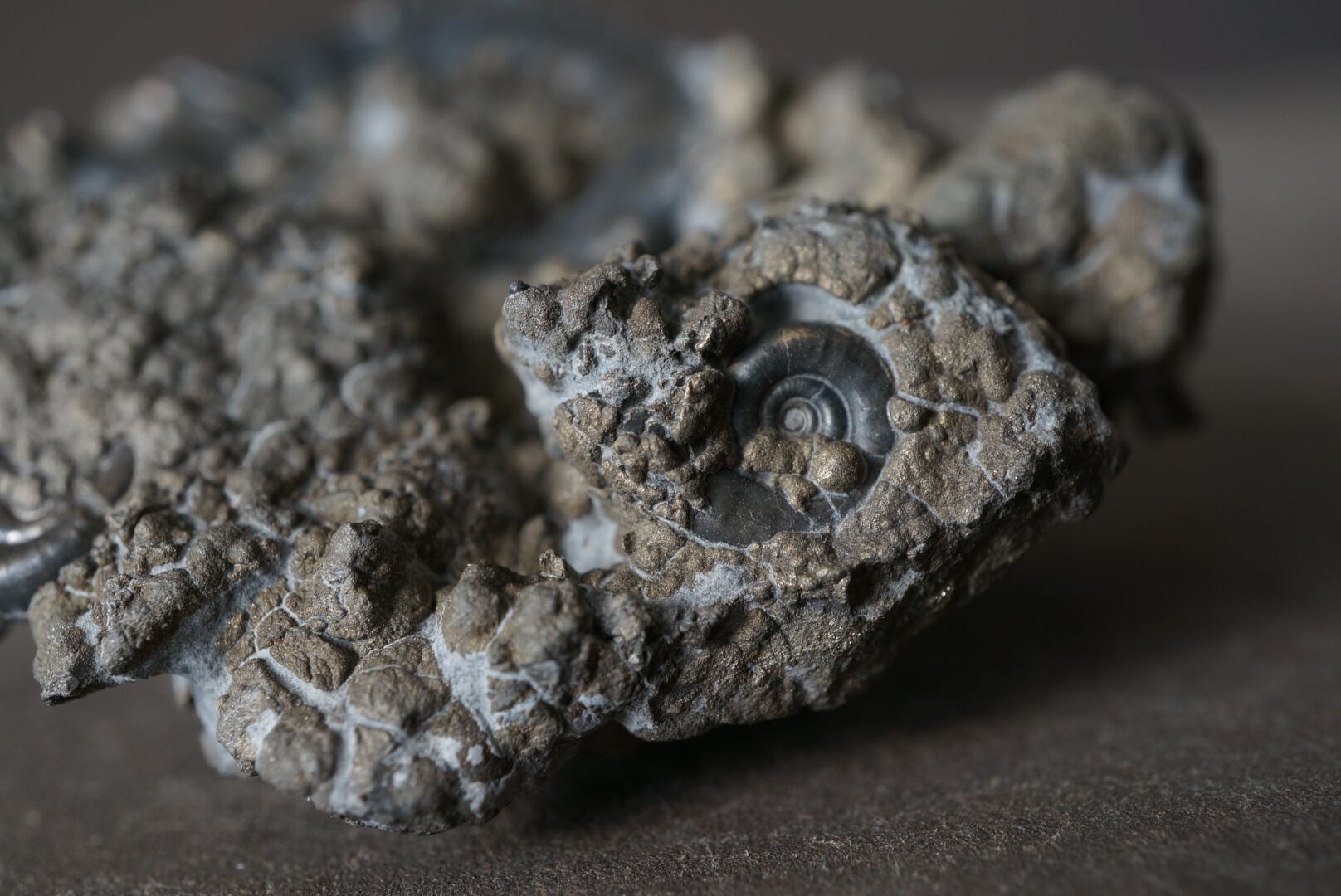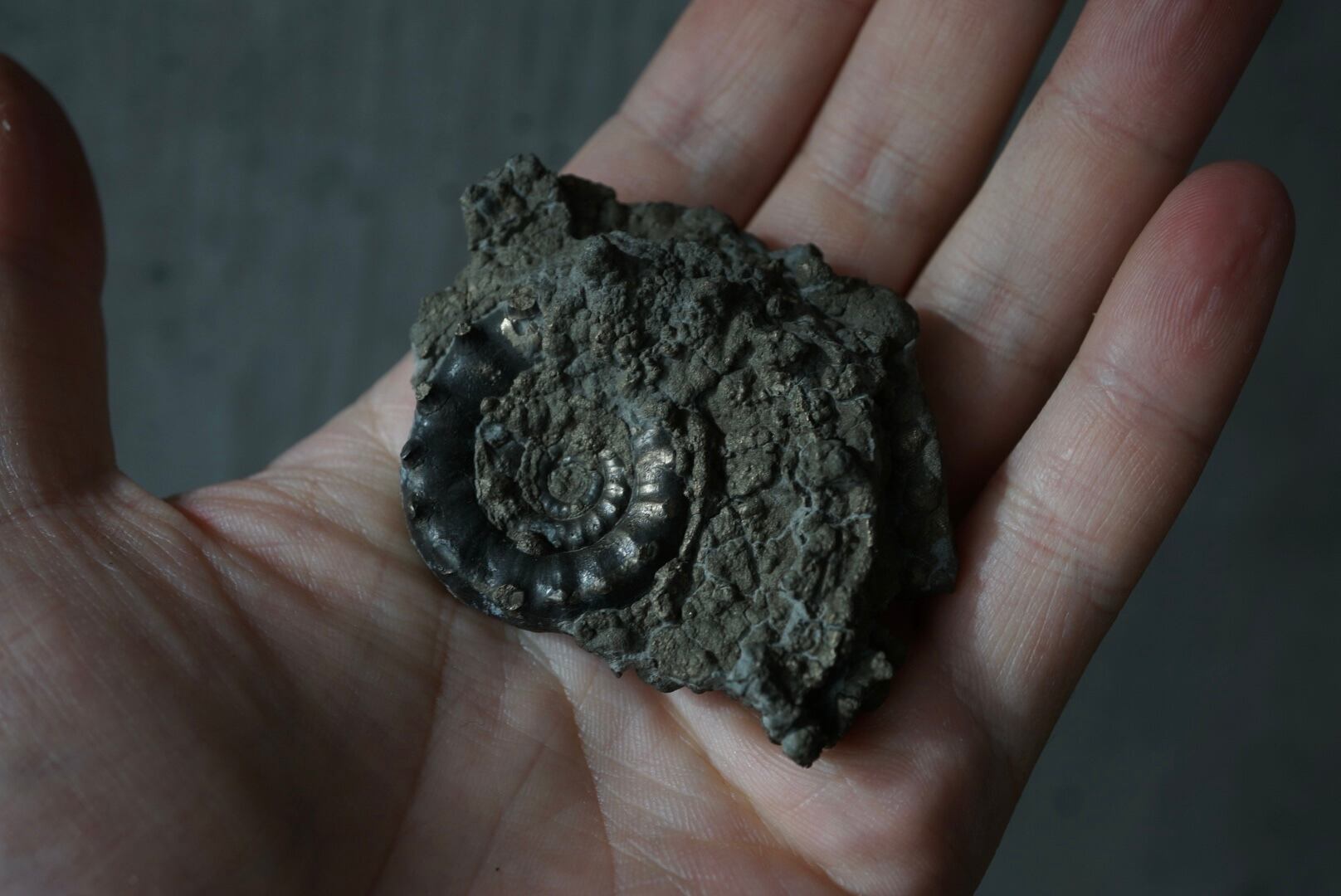 ジュラ紀(約2億130万年前から約1億4550万年前)の海に生息していたアンモナイトの遺骸が、バクテリアによる分解と鉄イオン/硫化物の反応により、黄鉄鉱によって置換され、金属光沢をもつ硬質な物質へと変化したものです。