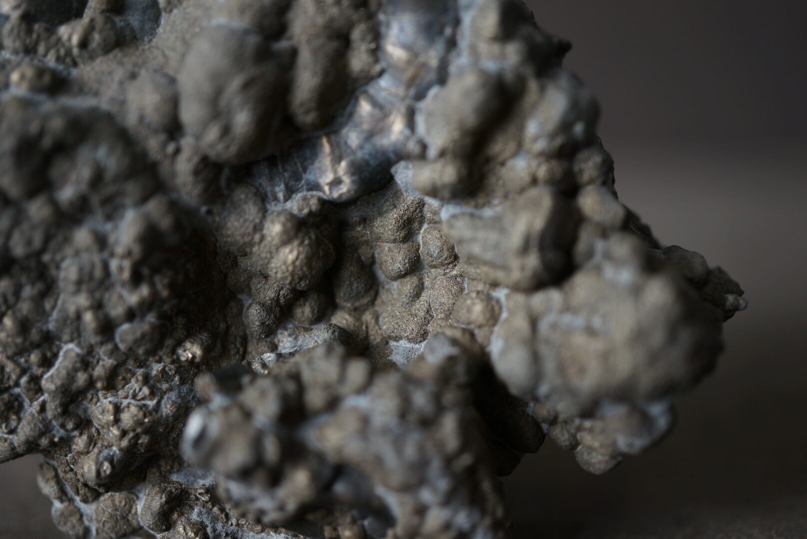 本石は母岩を含め、全体的に黄鉄鉱化されたいぶし銀の光沢感で、緻密な彫金作品のような重厚な印象を与えています。