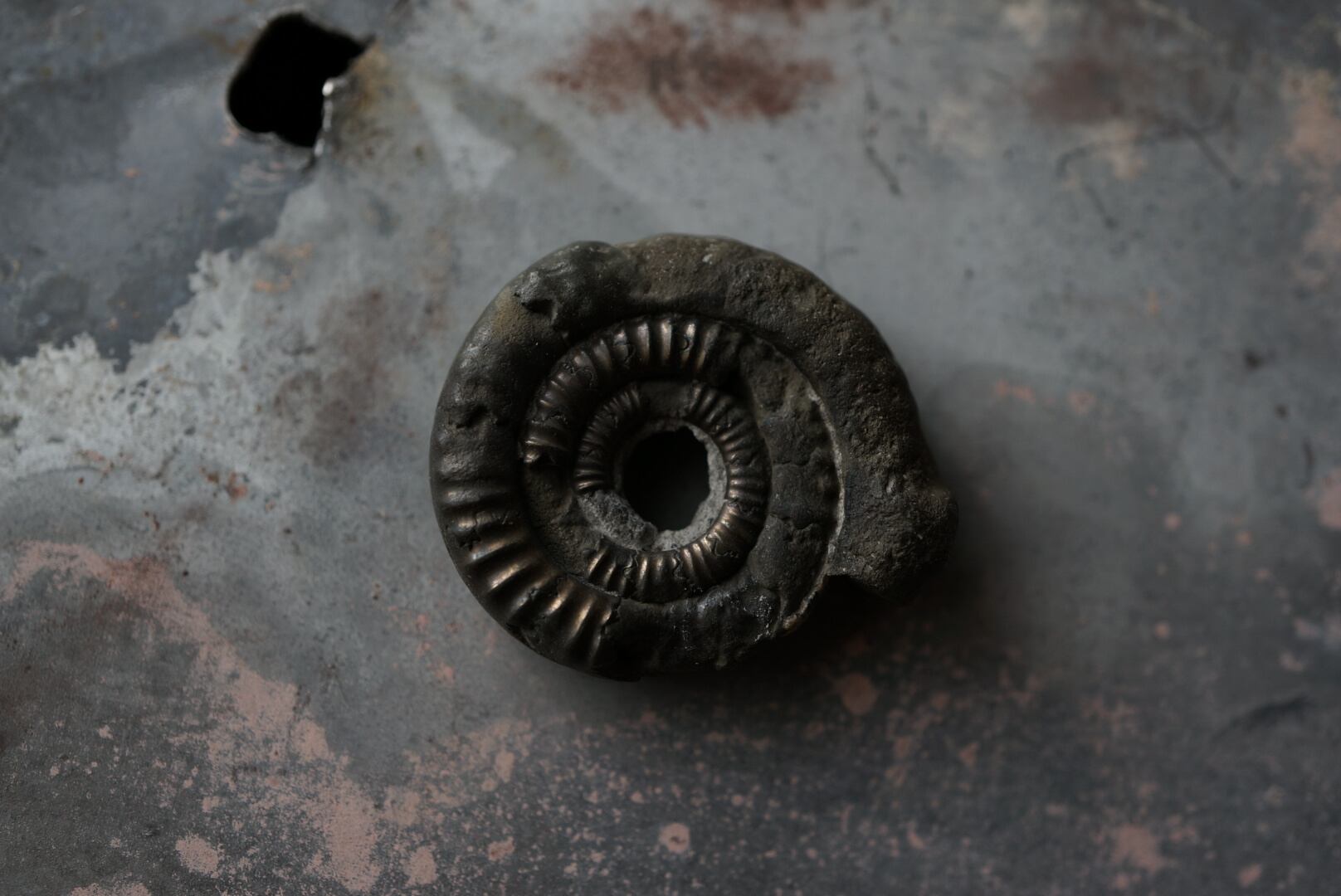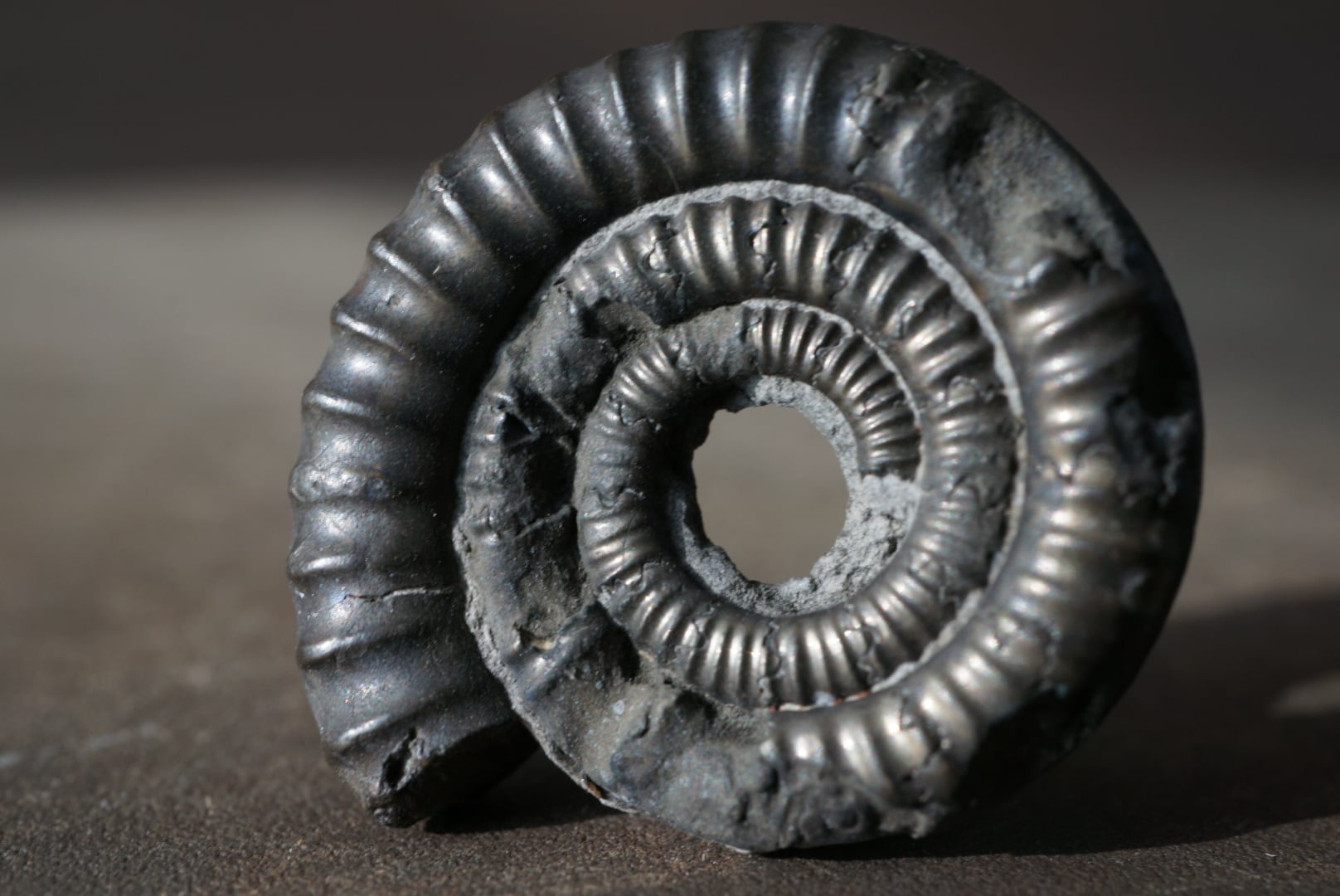 ジュラ紀(約2億130万年前から約1億4550万年前)の海に生息していたアンモナイトの遺骸が、バクテリアによる分解と鉄イオン/硫化物の反応により、黄鉄鉱によって置換され、金属光沢をもつ硬質な物質へと変化したものです。