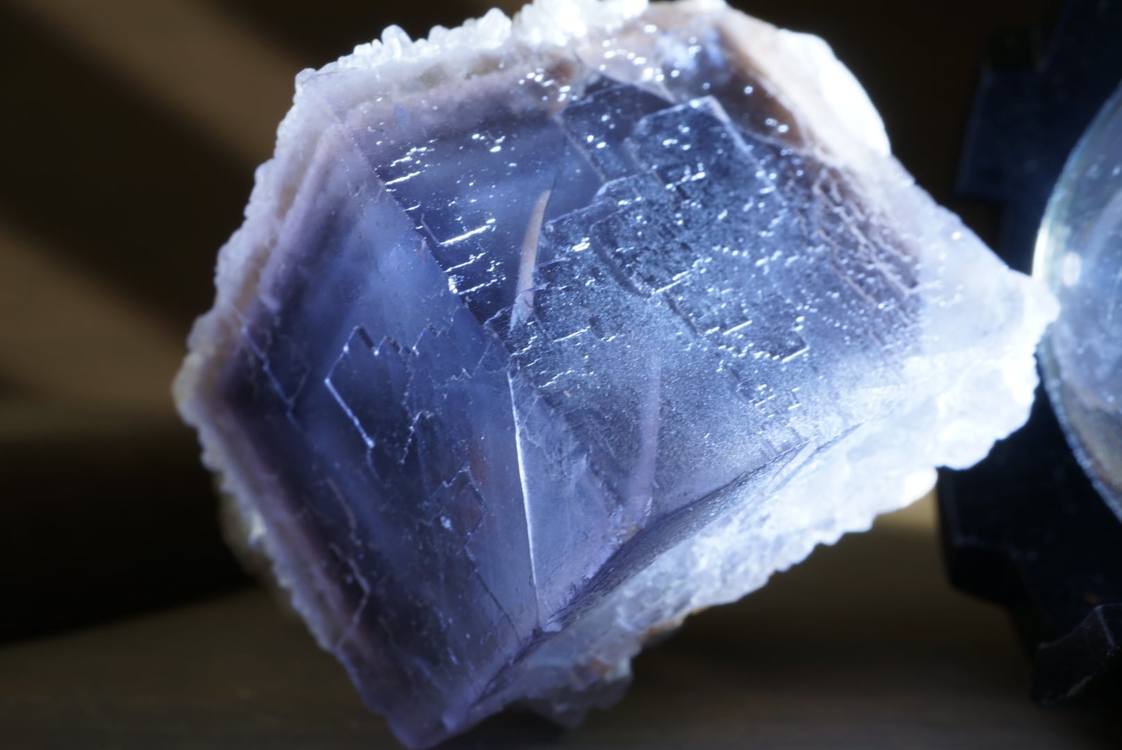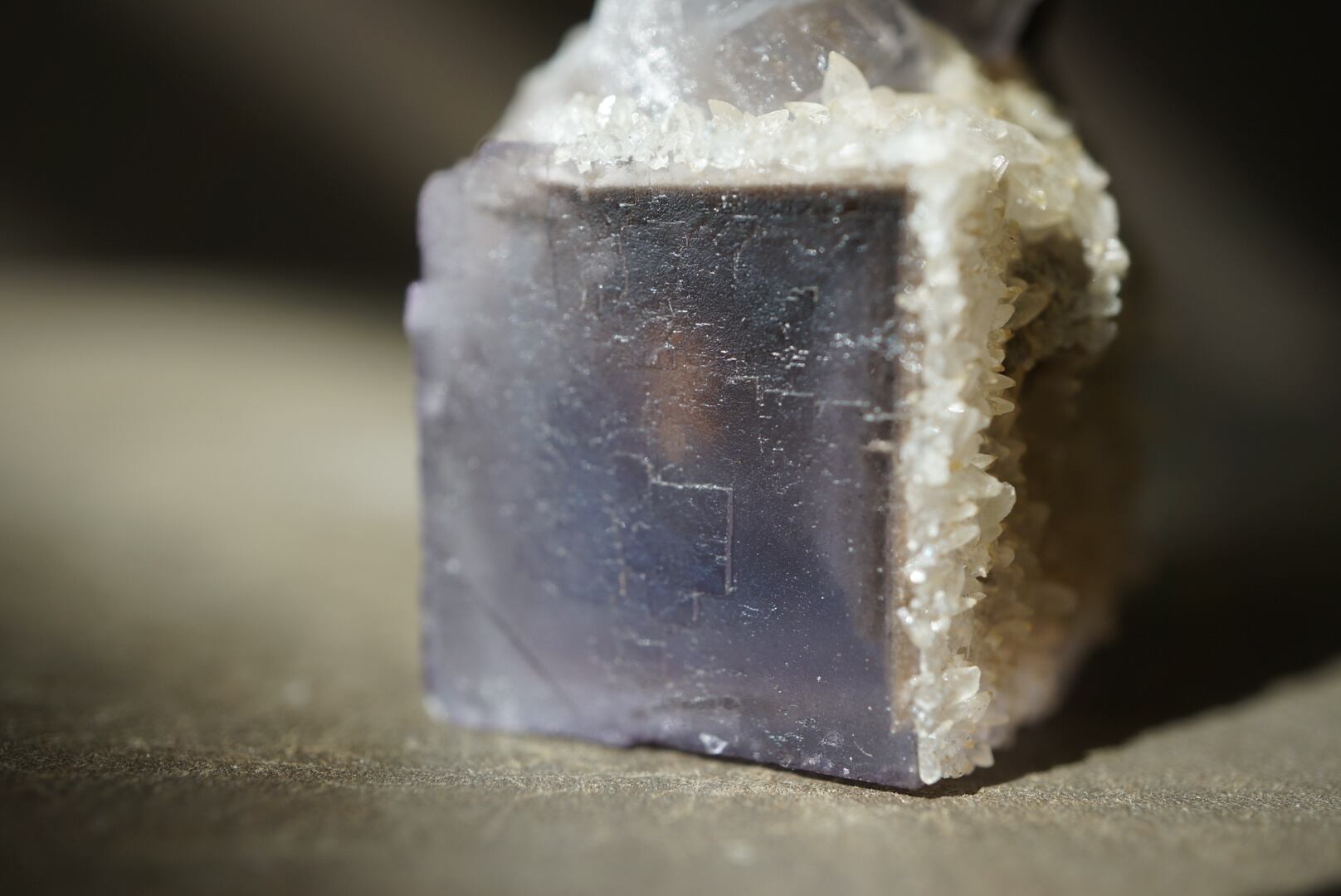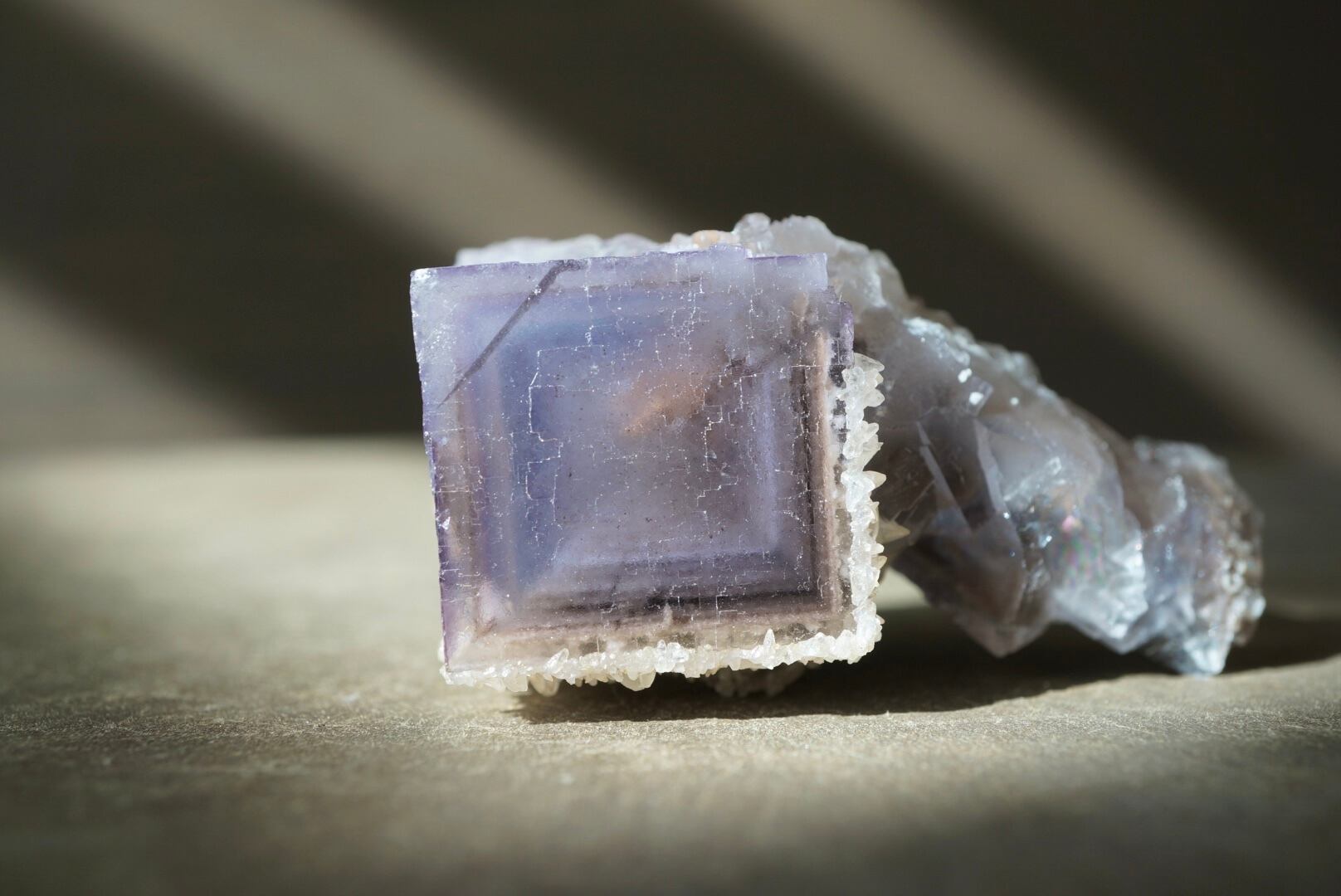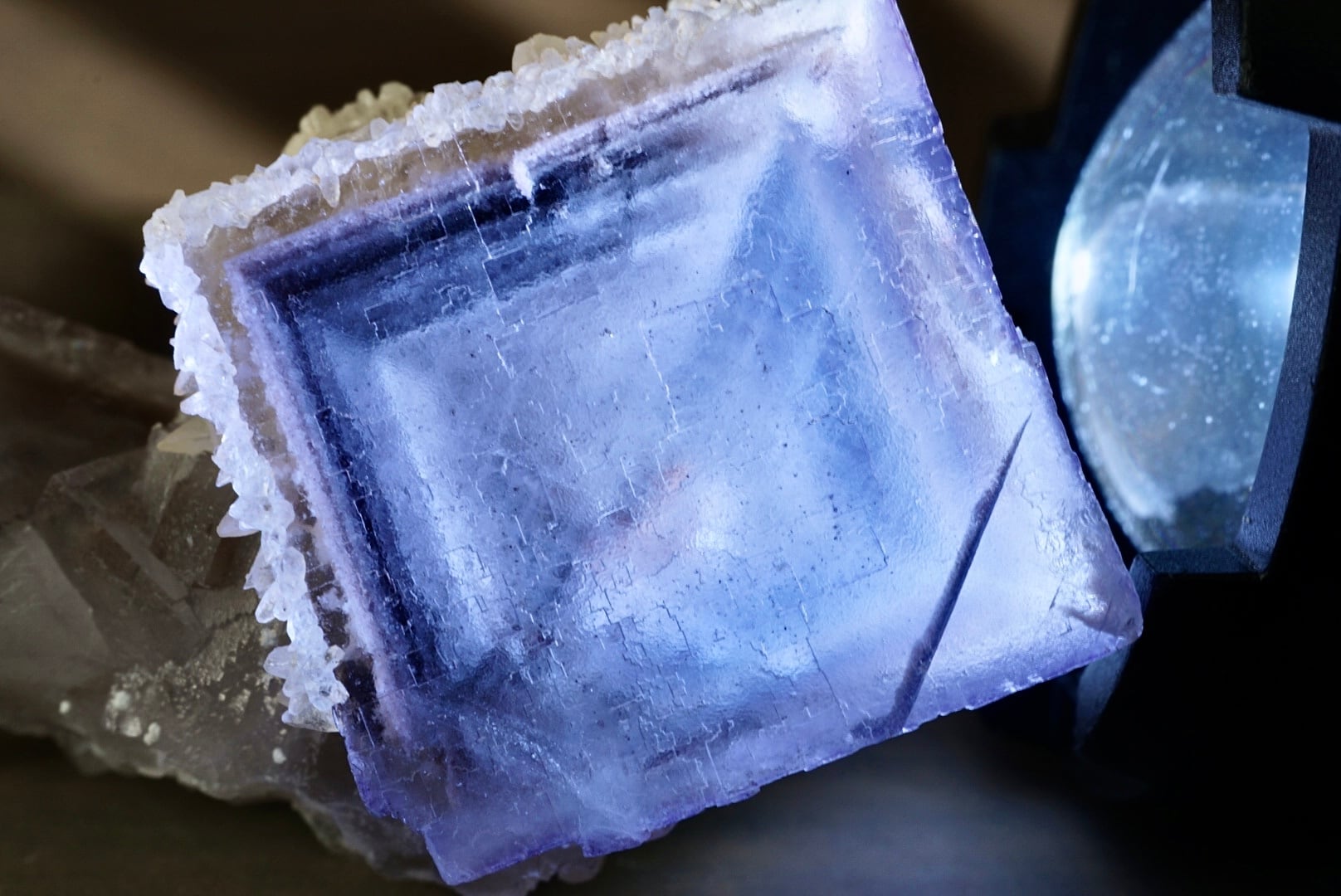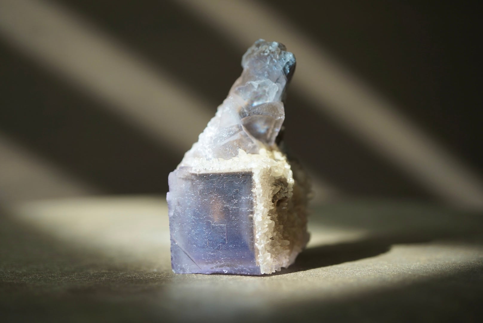 キューブ状のフローライトに光を当てると内部に潜むゾーニングが浮かび上がり、淡い層状の色彩が立体的に重なって表れます。