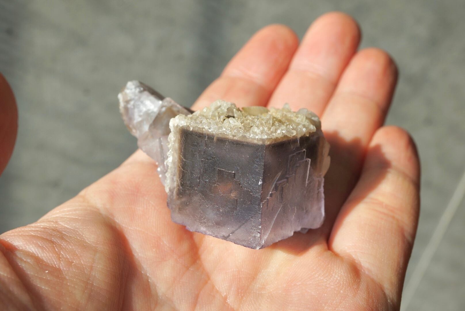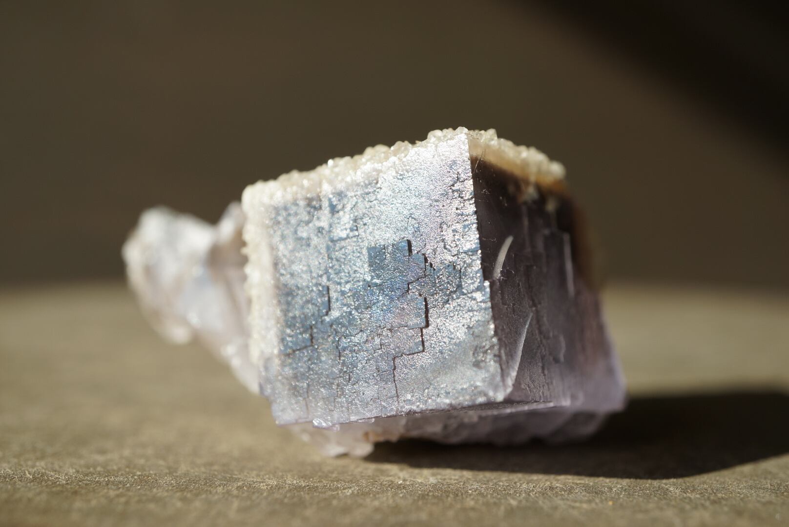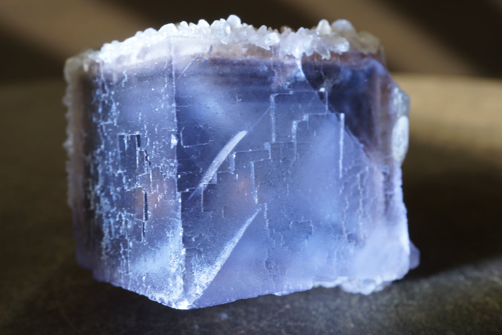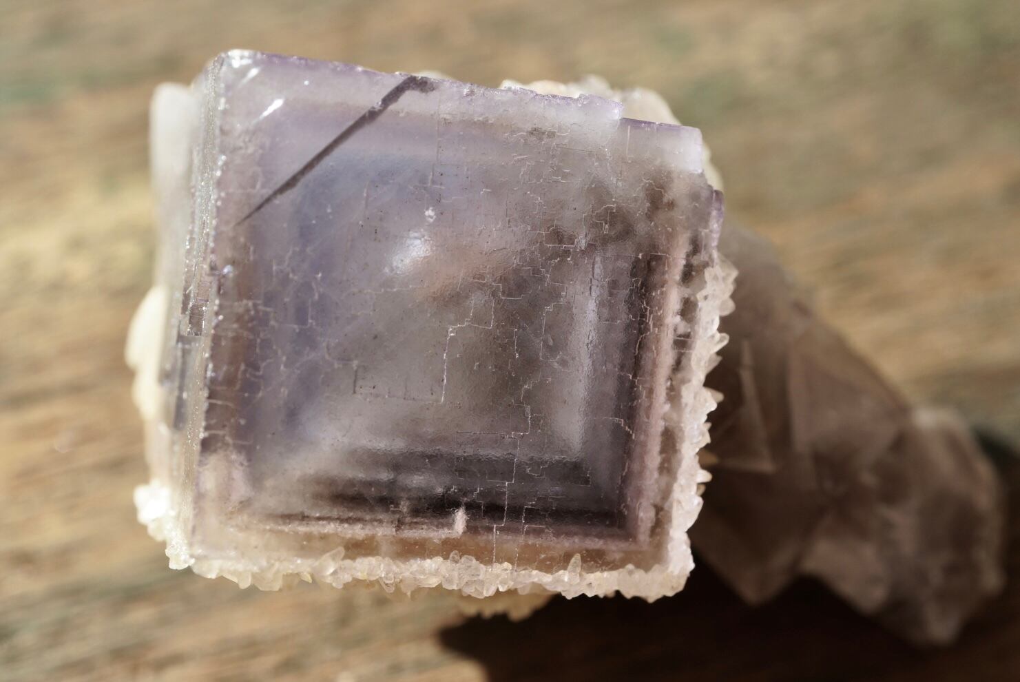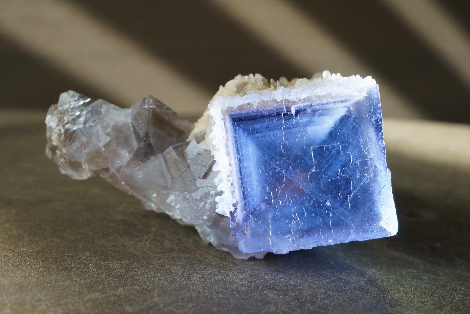 キューブ状のフローライトに光を当てると内部に潜むゾーニングが浮かび上がり、淡い層状の色彩が立体的に重なって表れます。