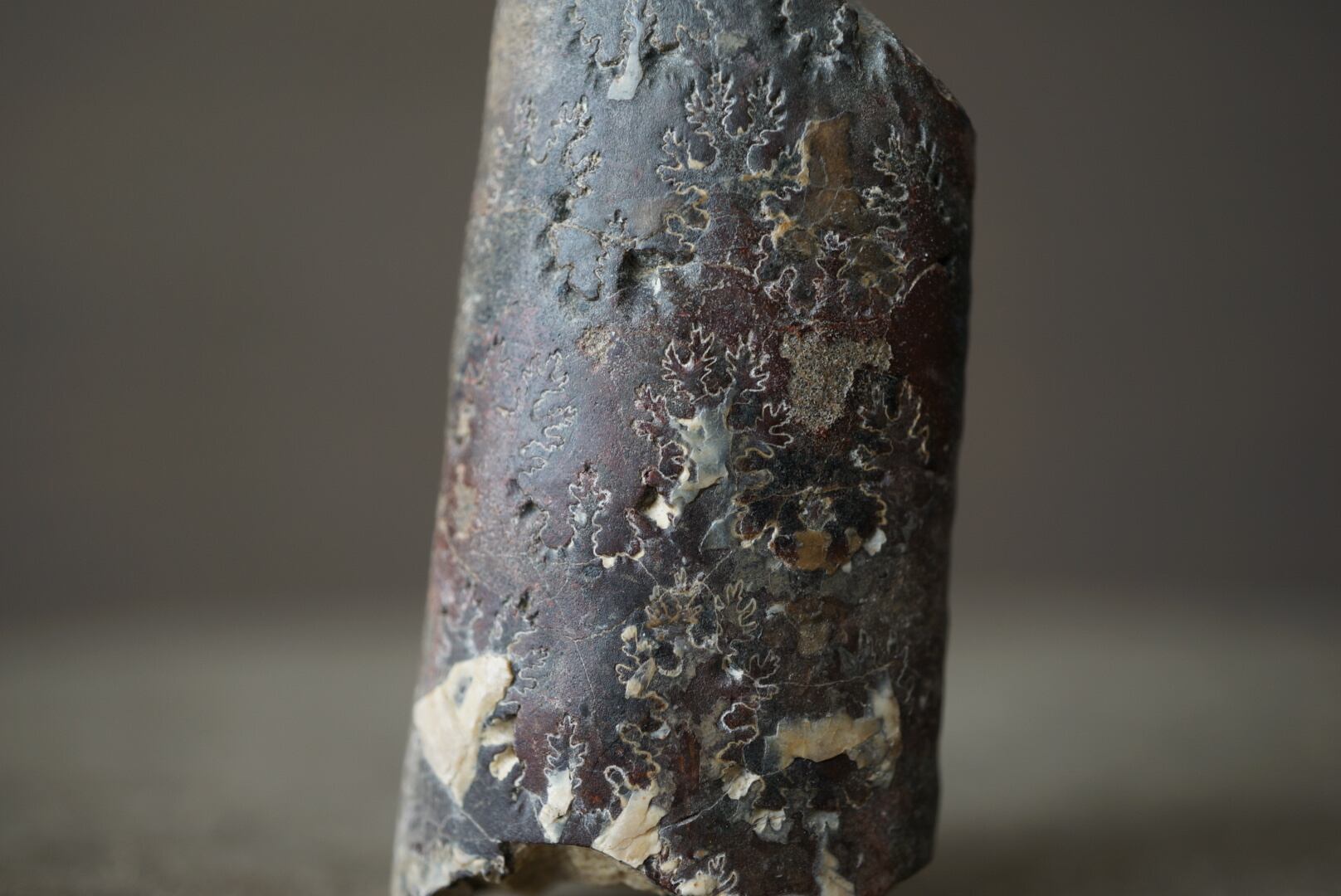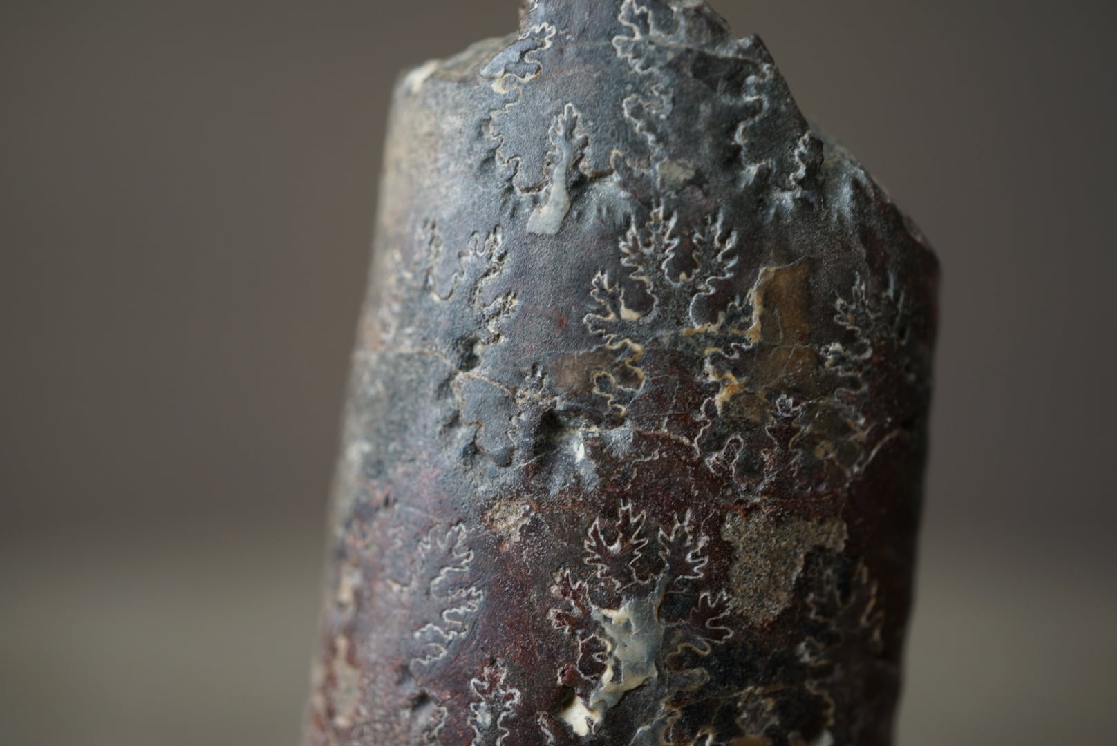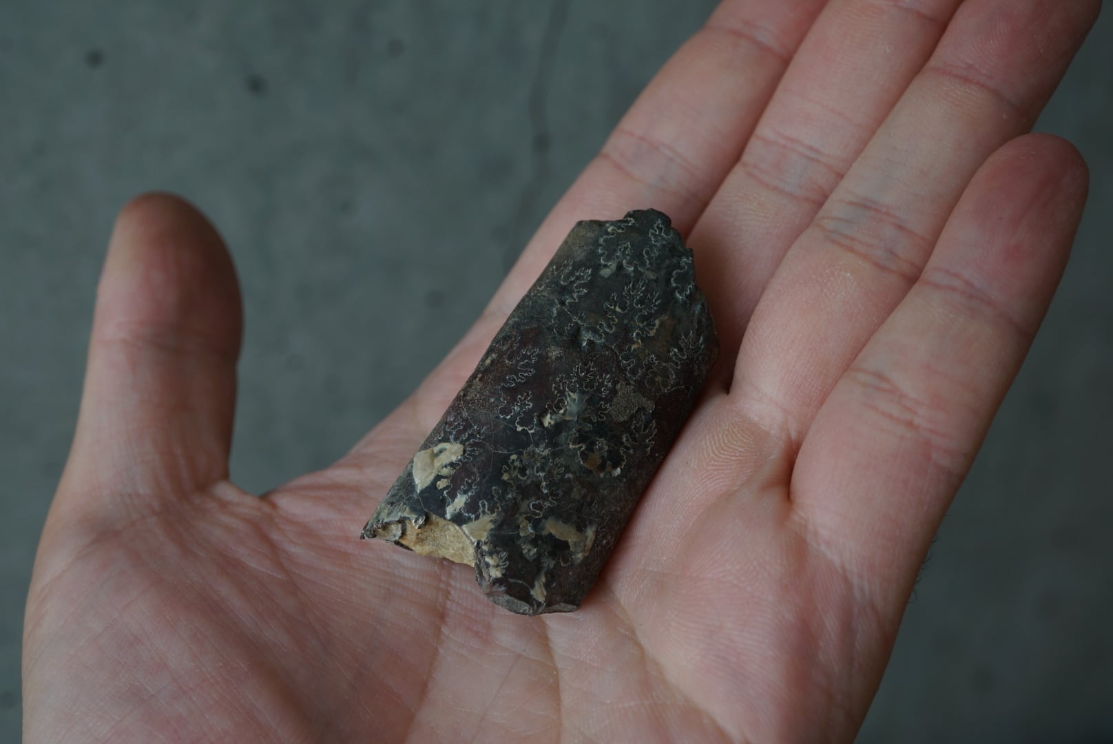 本石は殻表面の縫合線が鮮明で、ボタニカルな文様のように入り組んだ線が広がっています。