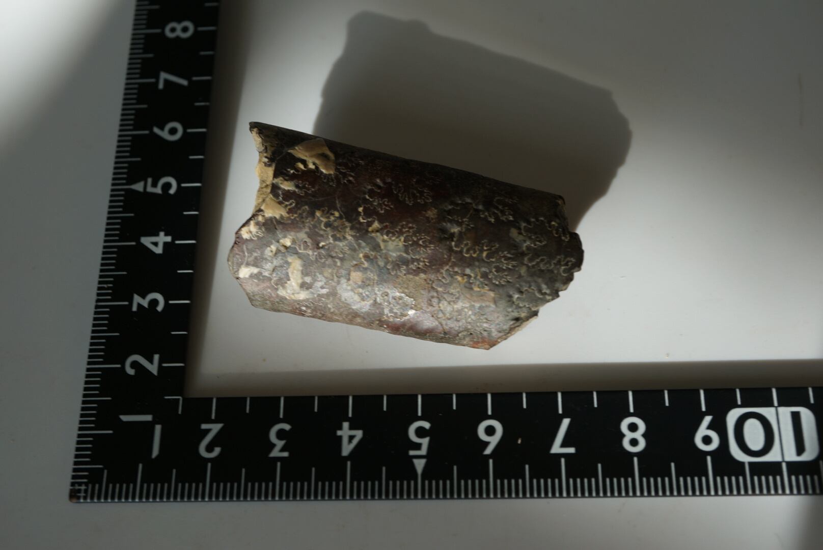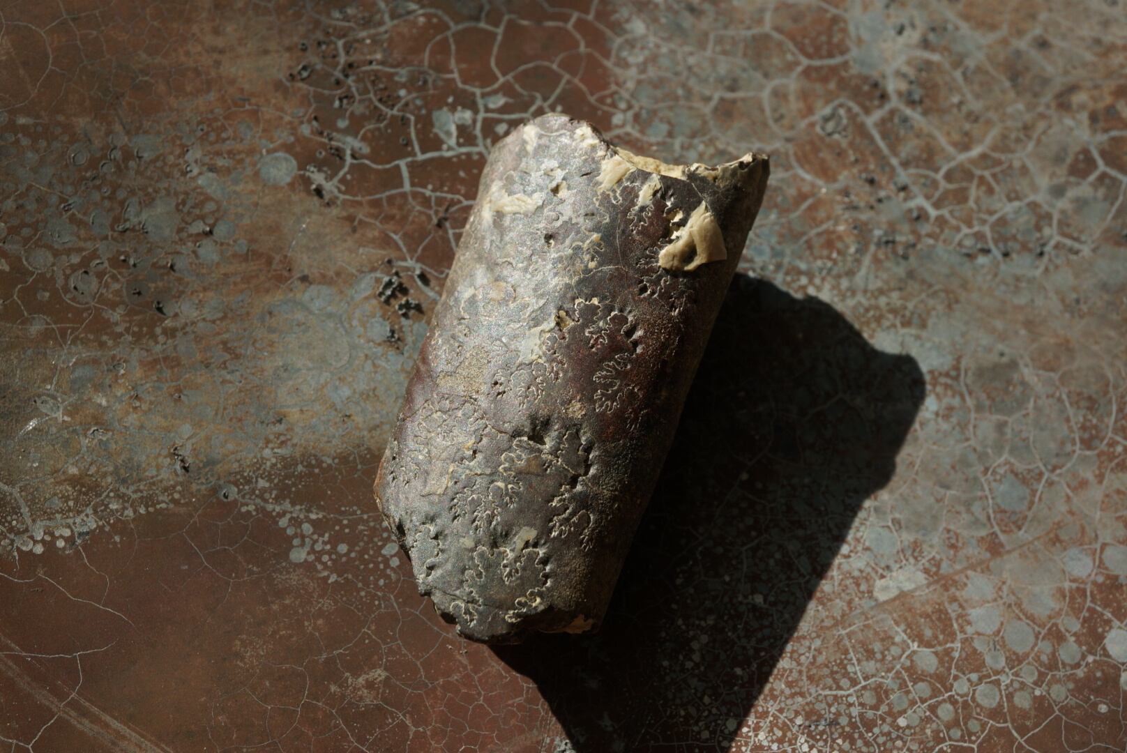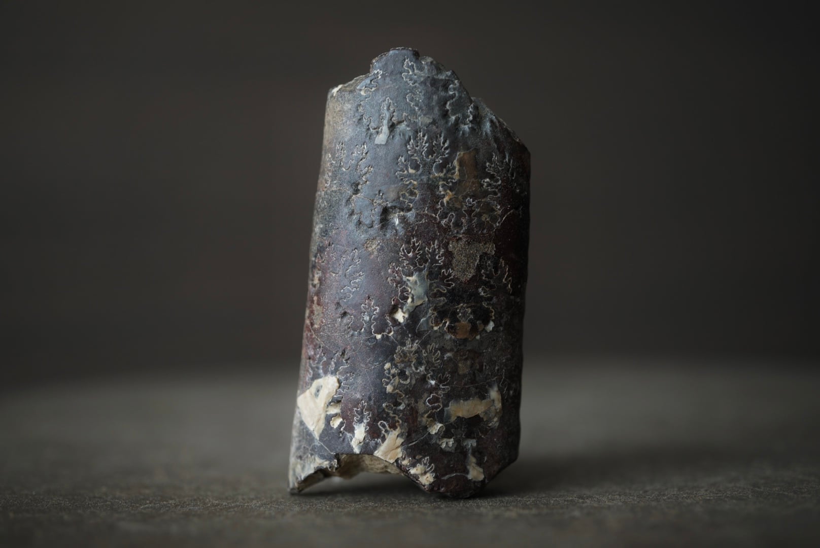 本石は殻表面の縫合線が鮮明で、ボタニカルな文様のように入り組んだ線が広がっています。