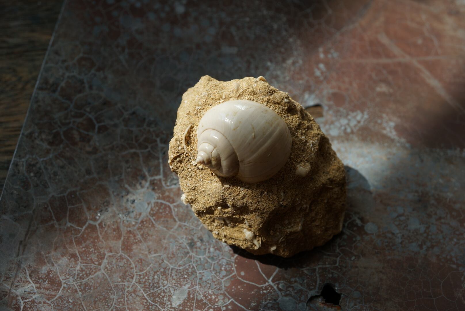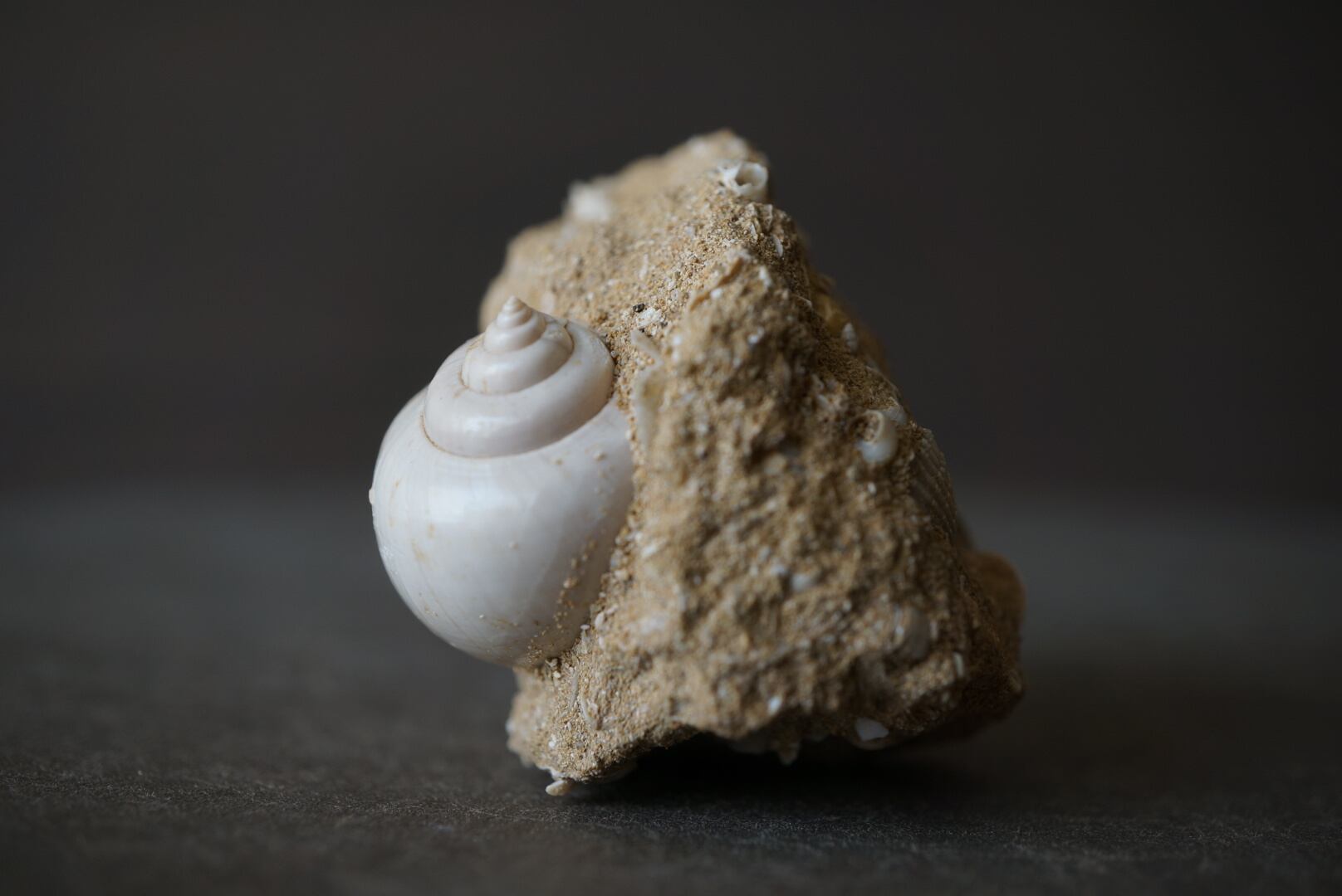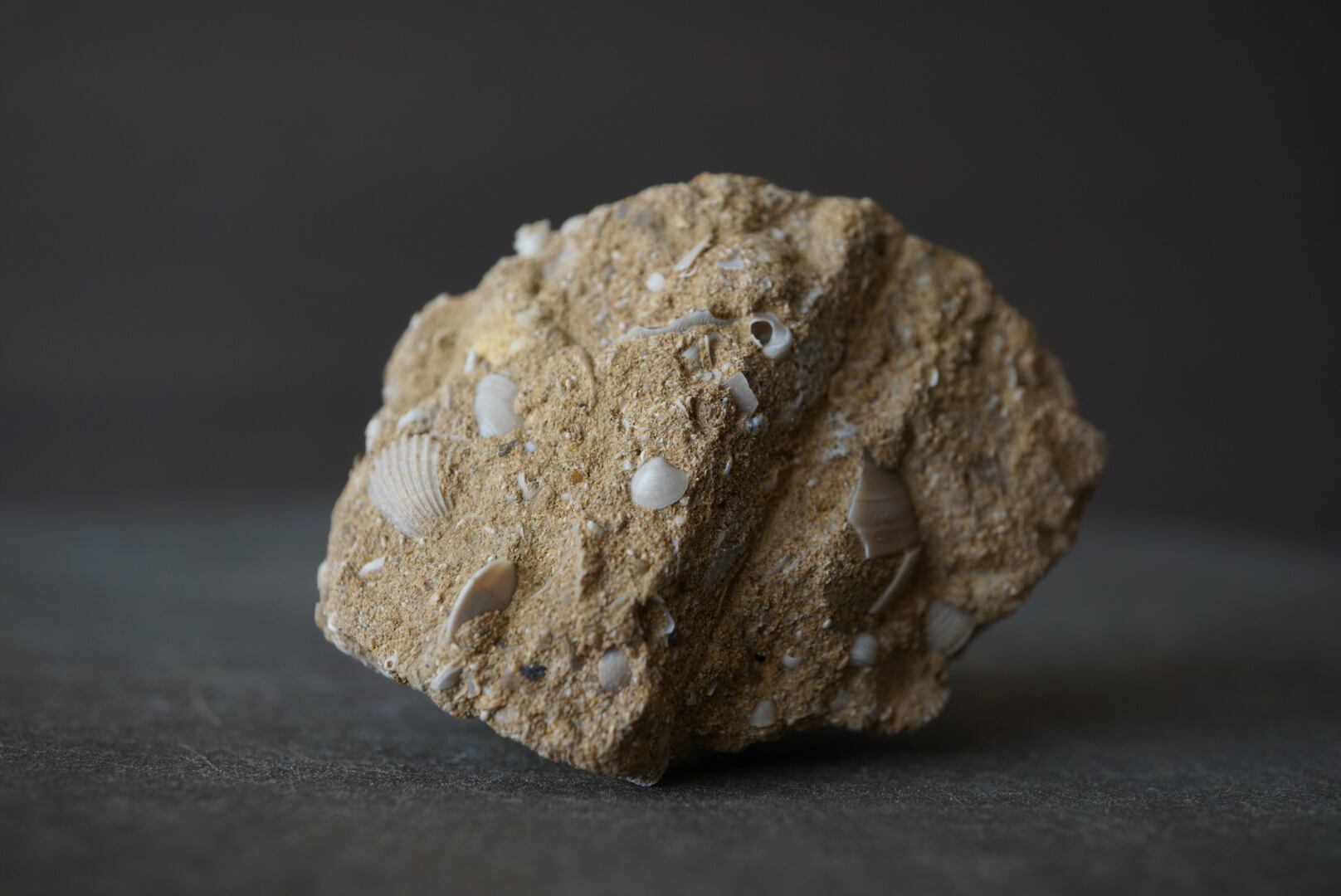 母岩には他種の貝殻や微細な海洋生物の痕跡が多数含まれており、一つの小さな海底断面を切り取ったかのような佇まいは遠い太古の海の静けさを今に伝えてくれるようです。